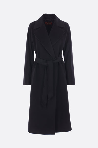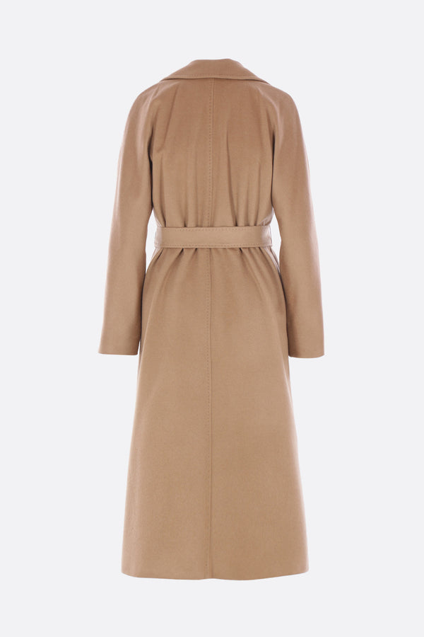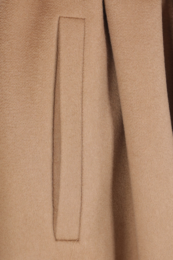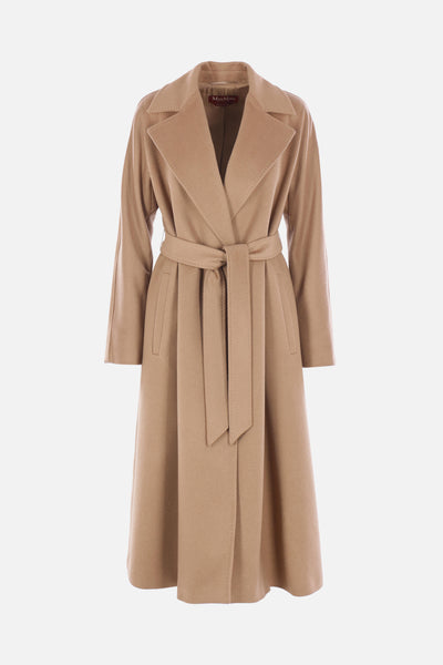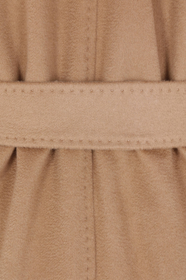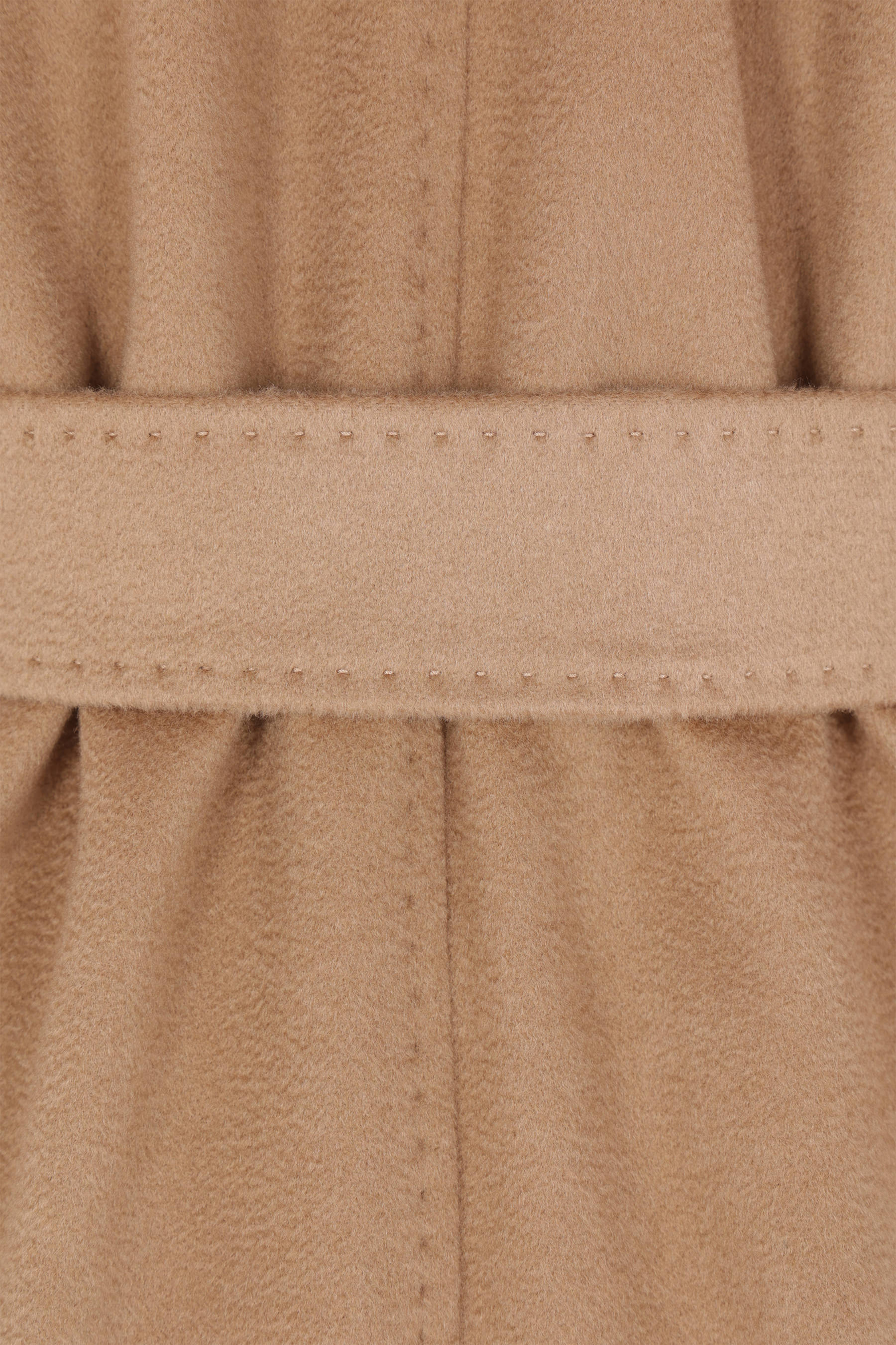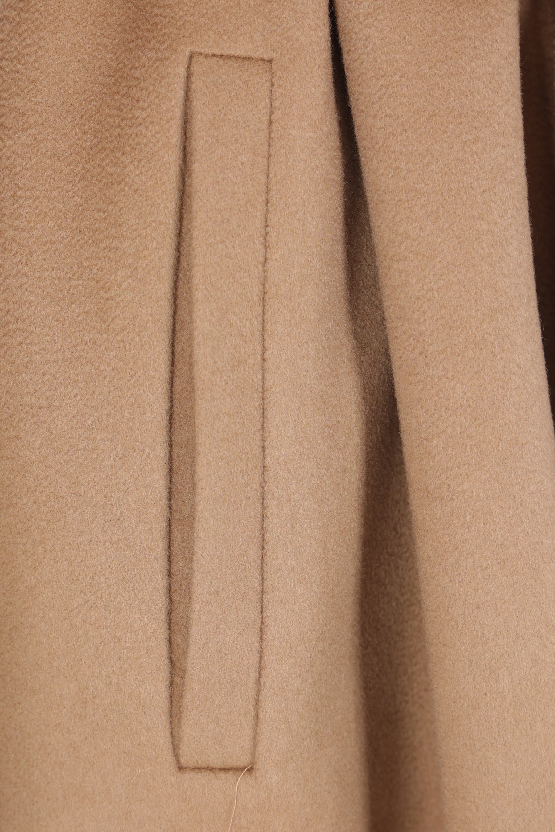 Max Mara Studio wrap coat made of camel-colored pure cashmere broadcloth. Featuring wide lapels, a matching belt, welt pockets, long sleeves, and a straight hem. Fully lined interior.