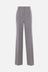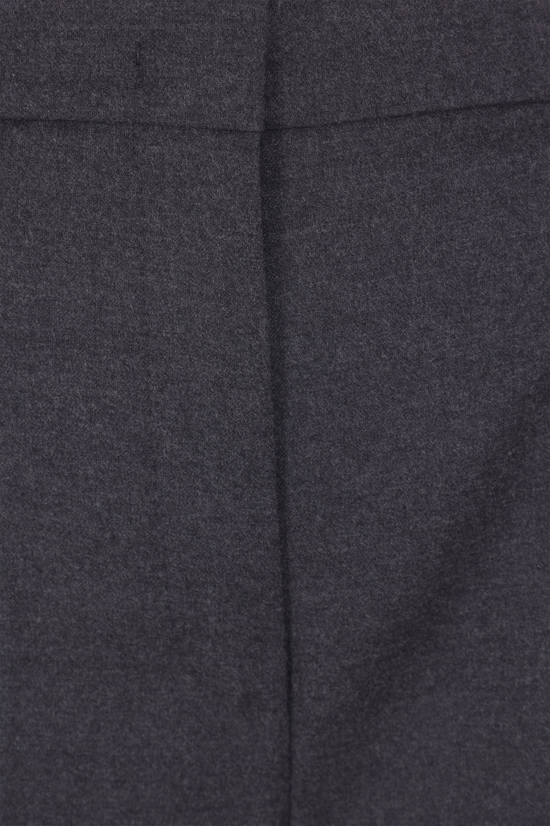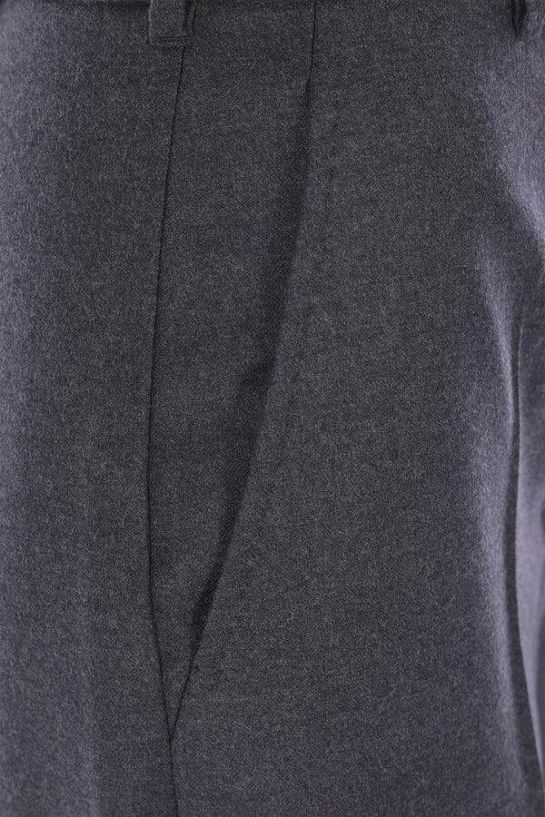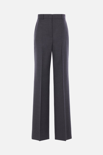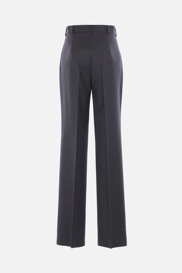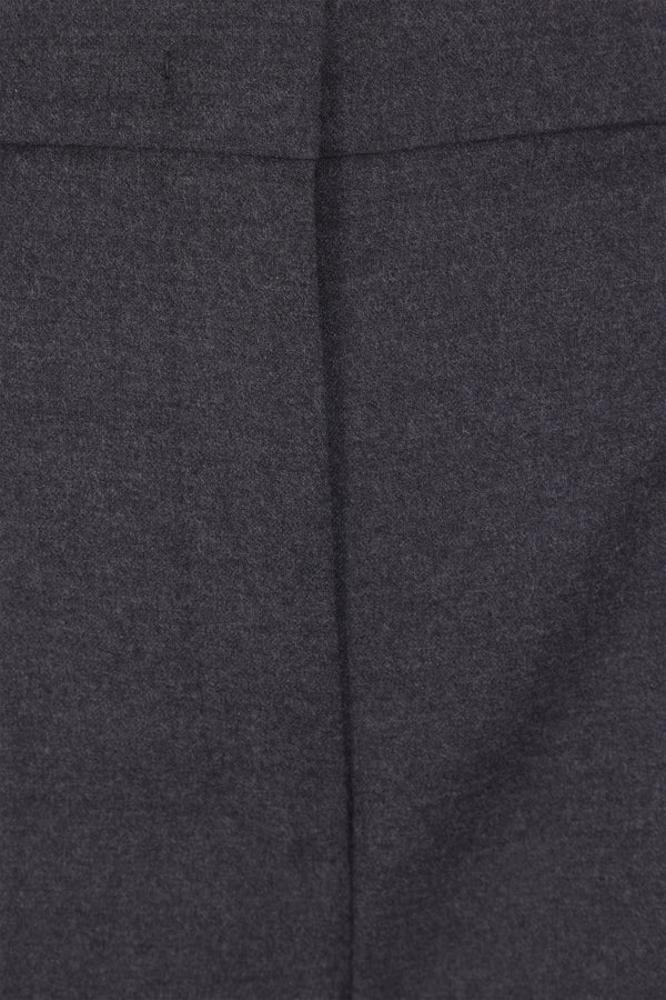 Max Mara Studio trousers made from dark grey stretch wool flannel. Features front hook, button, and zip closure, belt loops, multiple pockets, and central crease. Unlined interior.