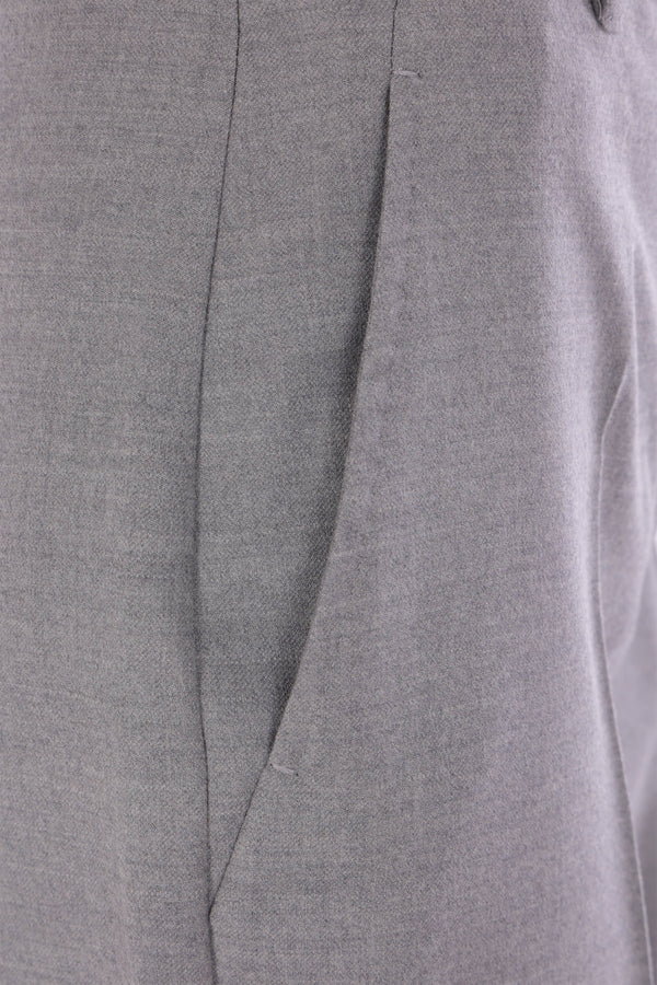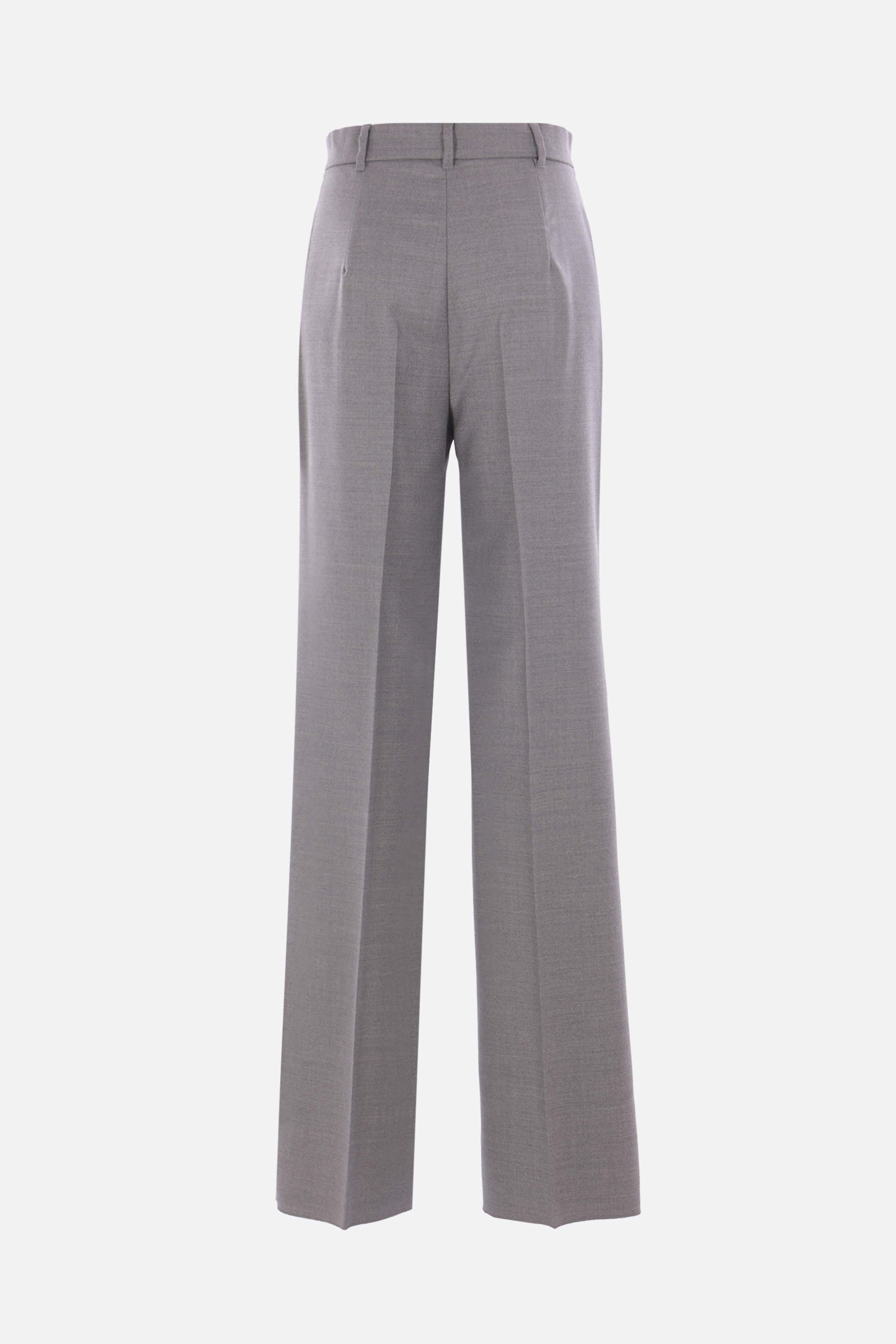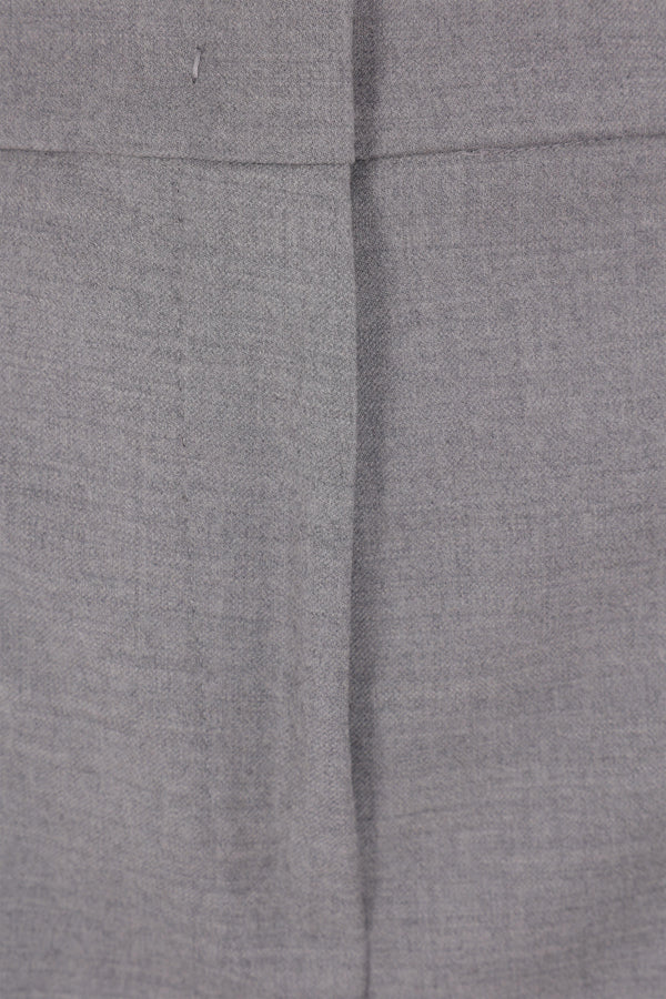 Max Mara Studio trousers made from light grey stretch wool flannel. Features front hook, button, and zip closure, belt loops, multiple pockets, and central crease. Unlined interior.