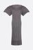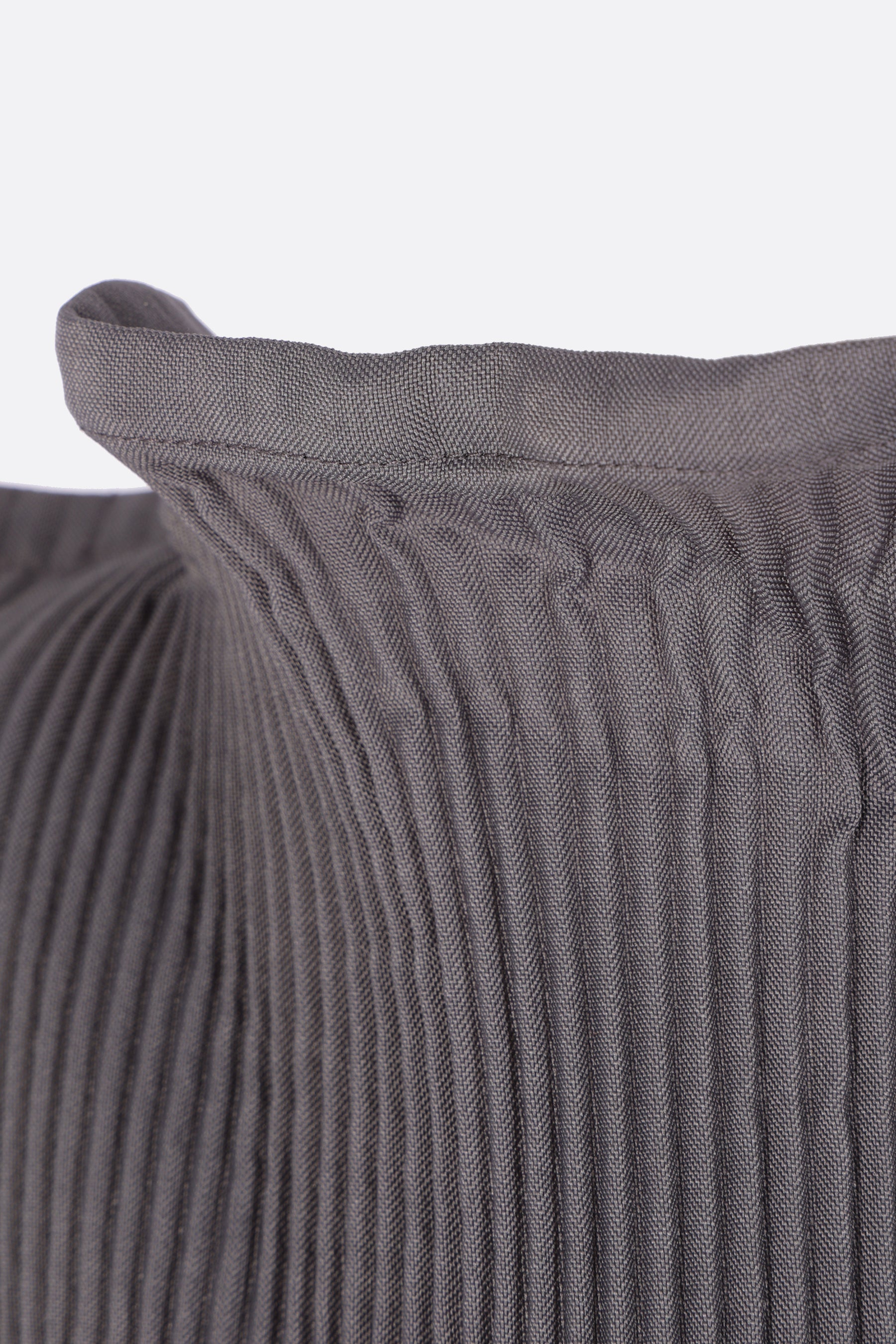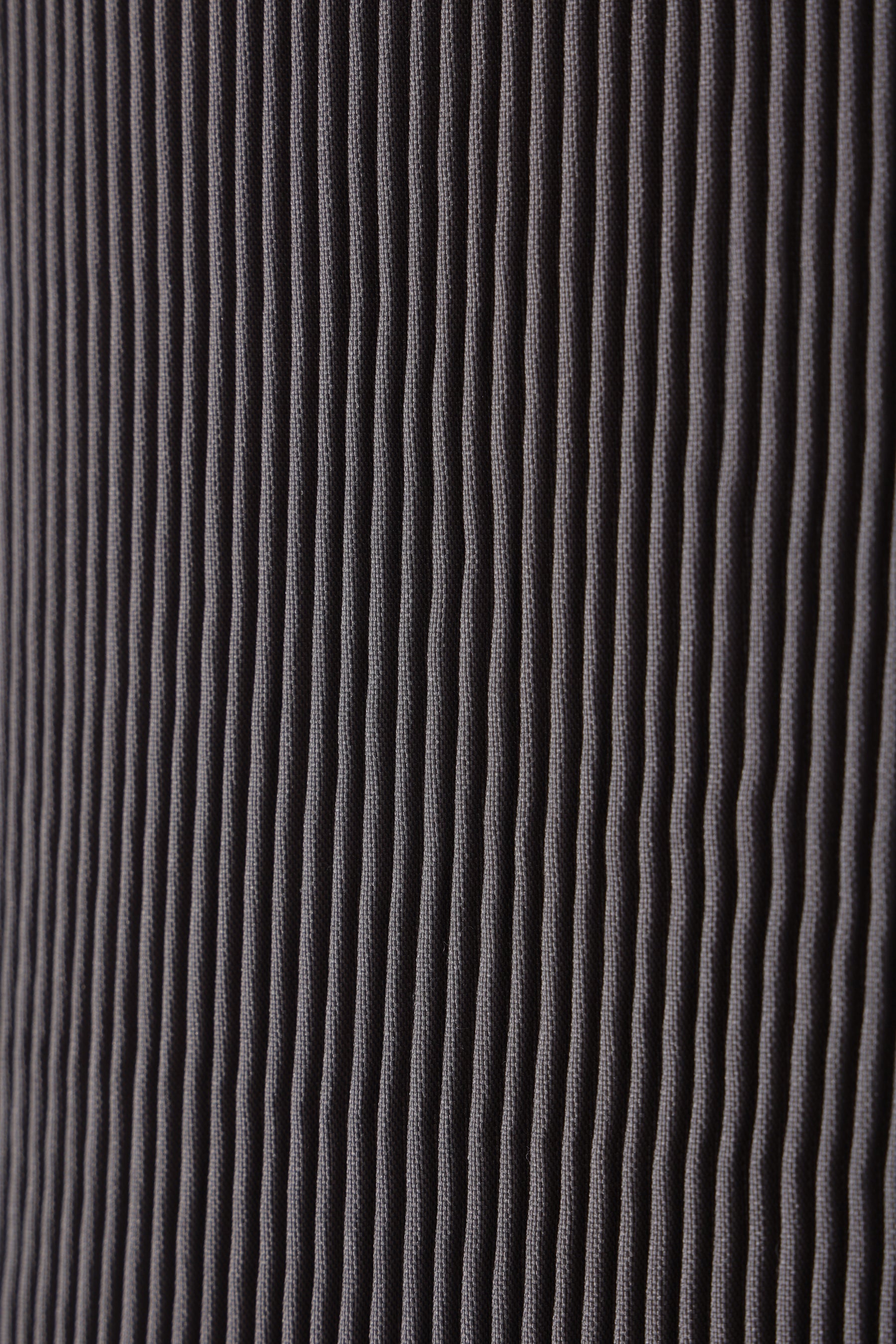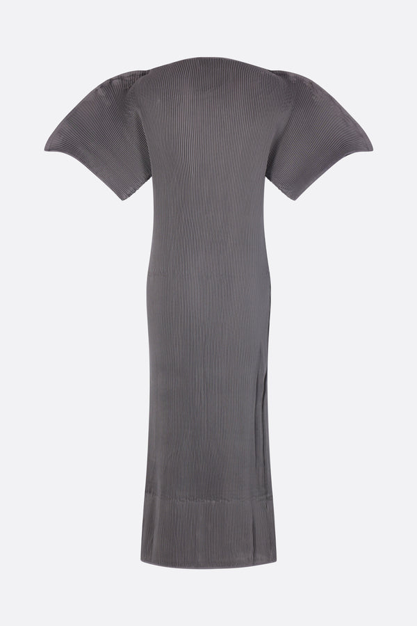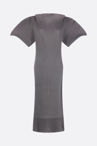 Melitta Baumeister midi dress made of grey pleated nylon. It features a boat neckline, zigzag-edged shoulders reinforced with wire, short sleeves, and a straight hem.
