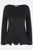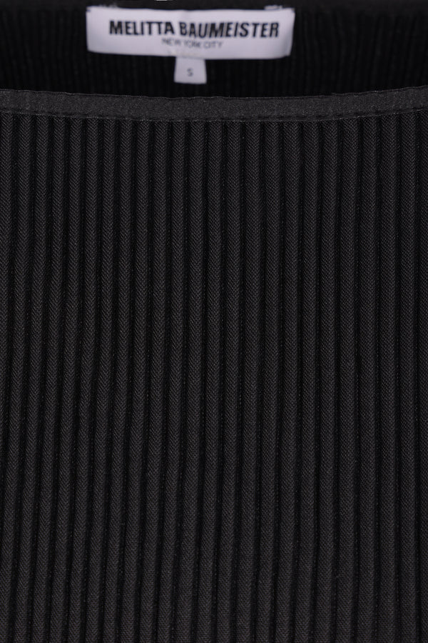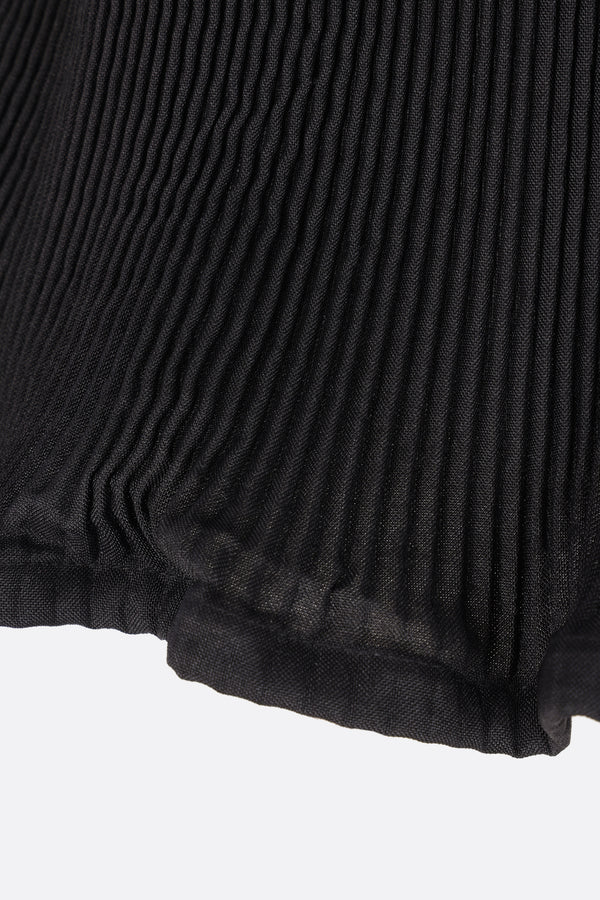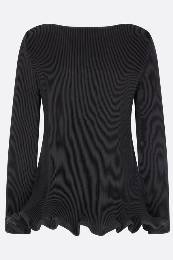 Melitta Baumeister top made of black pleated nylon. It features a boat neckline, long sleeves, and a zigzag hem reinforced with wire.