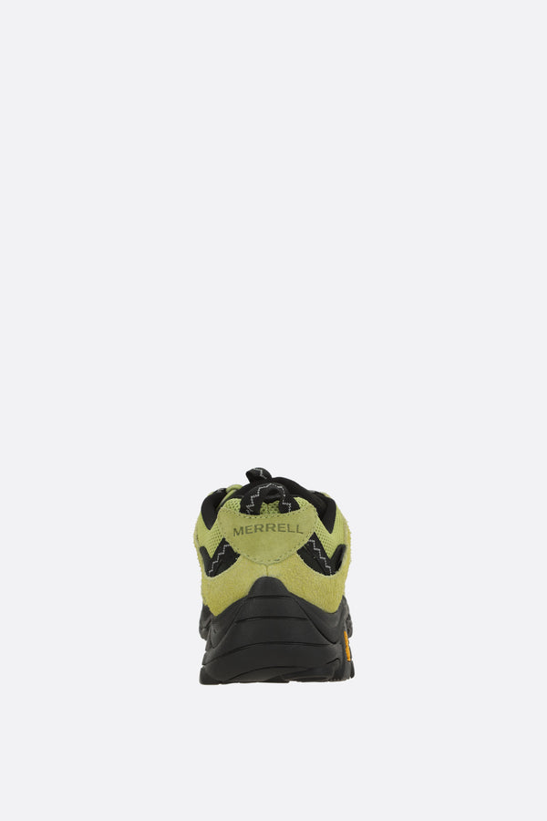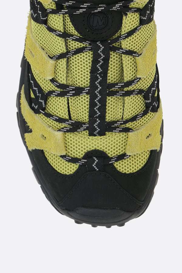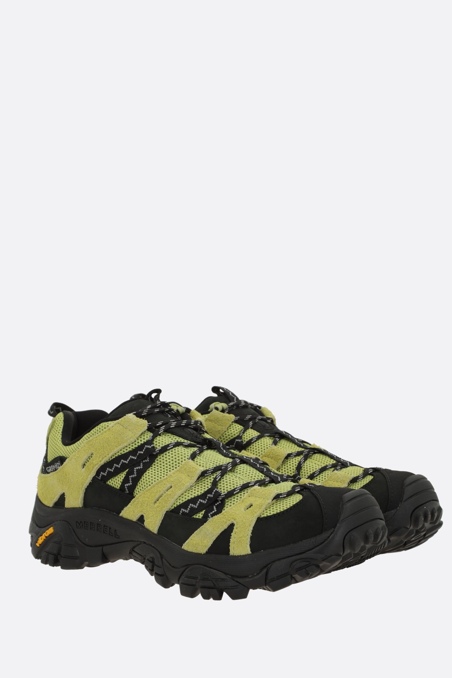 Merrell x Gramicci low-top sneakers crafted from acid green mesh and suede with black nubuck details. Featuring lace-up closure, rounded toe, fabric linings, and a Vibram rubber sole. Completed with a side Gramicci label and embossed Merrell logo on the heel.