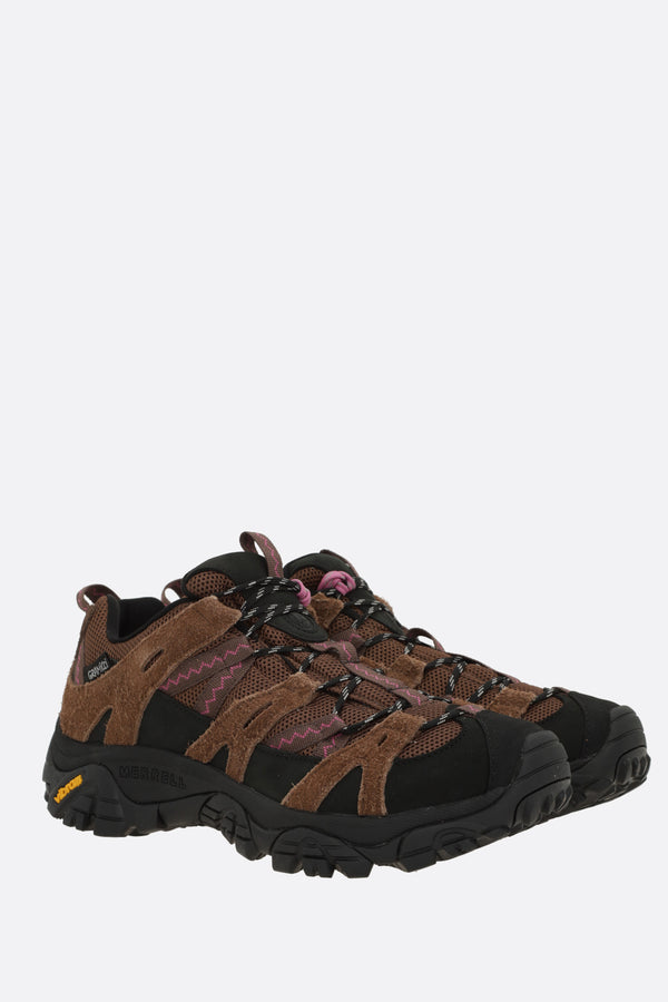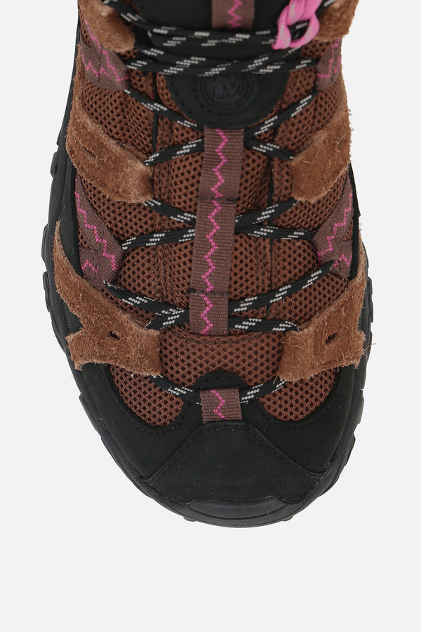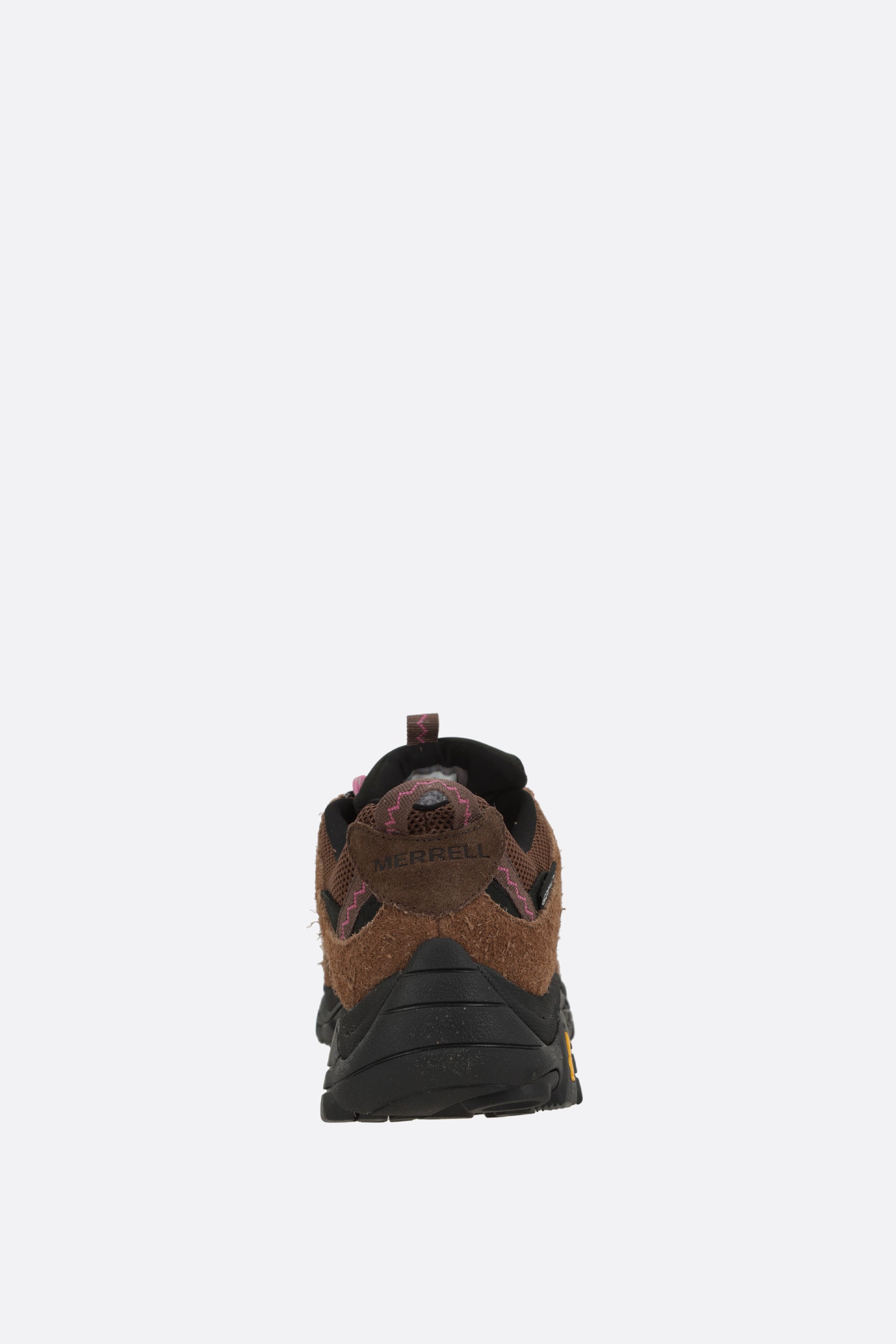 Merrell x Gramicci low-top sneakers crafted from brown mesh and suede with black nubuck details. Featuring lace-up closure, rounded toe, fabric linings, and a Vibram rubber sole. Completed with a side Gramicci label and embossed Merrell logo on the heel.