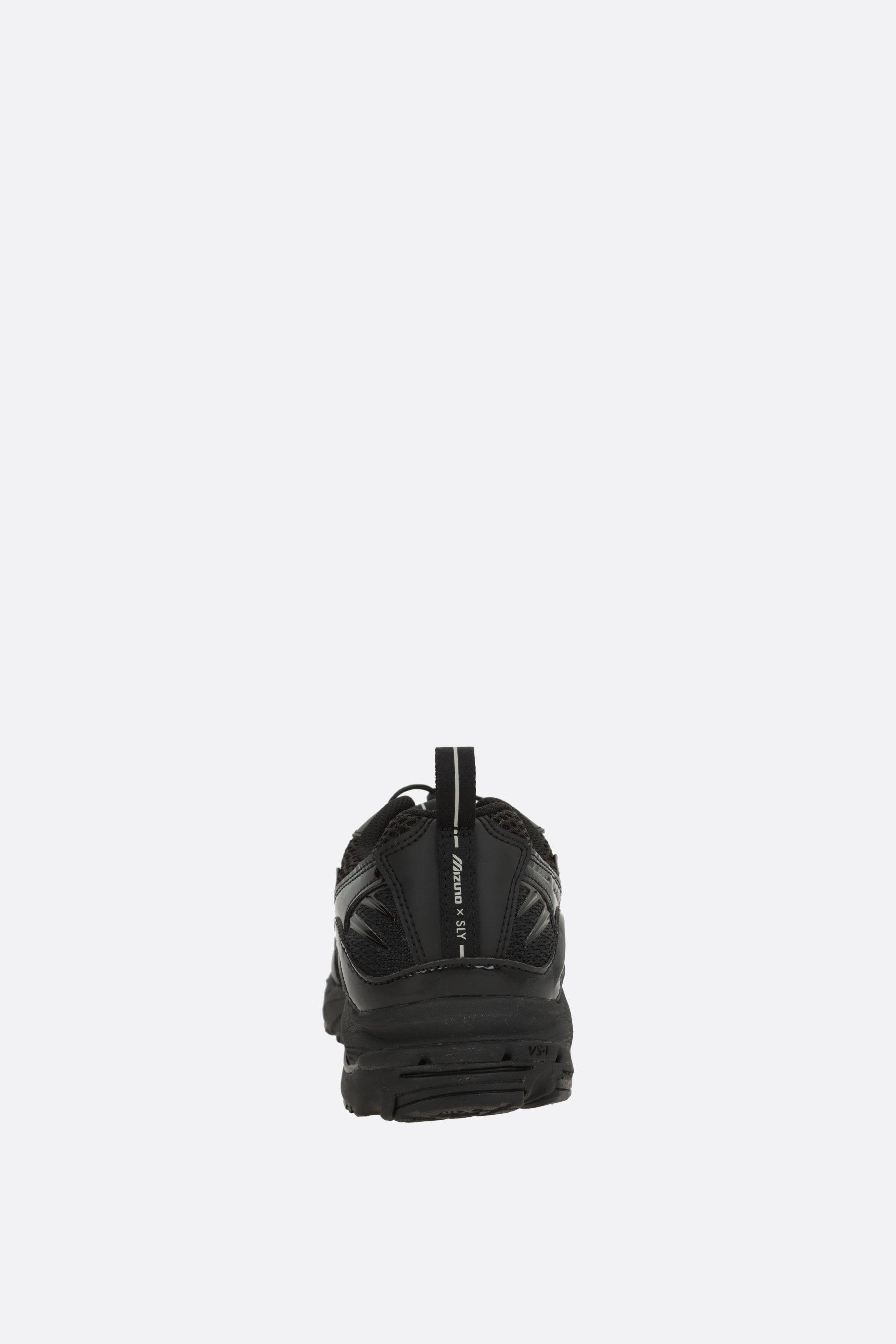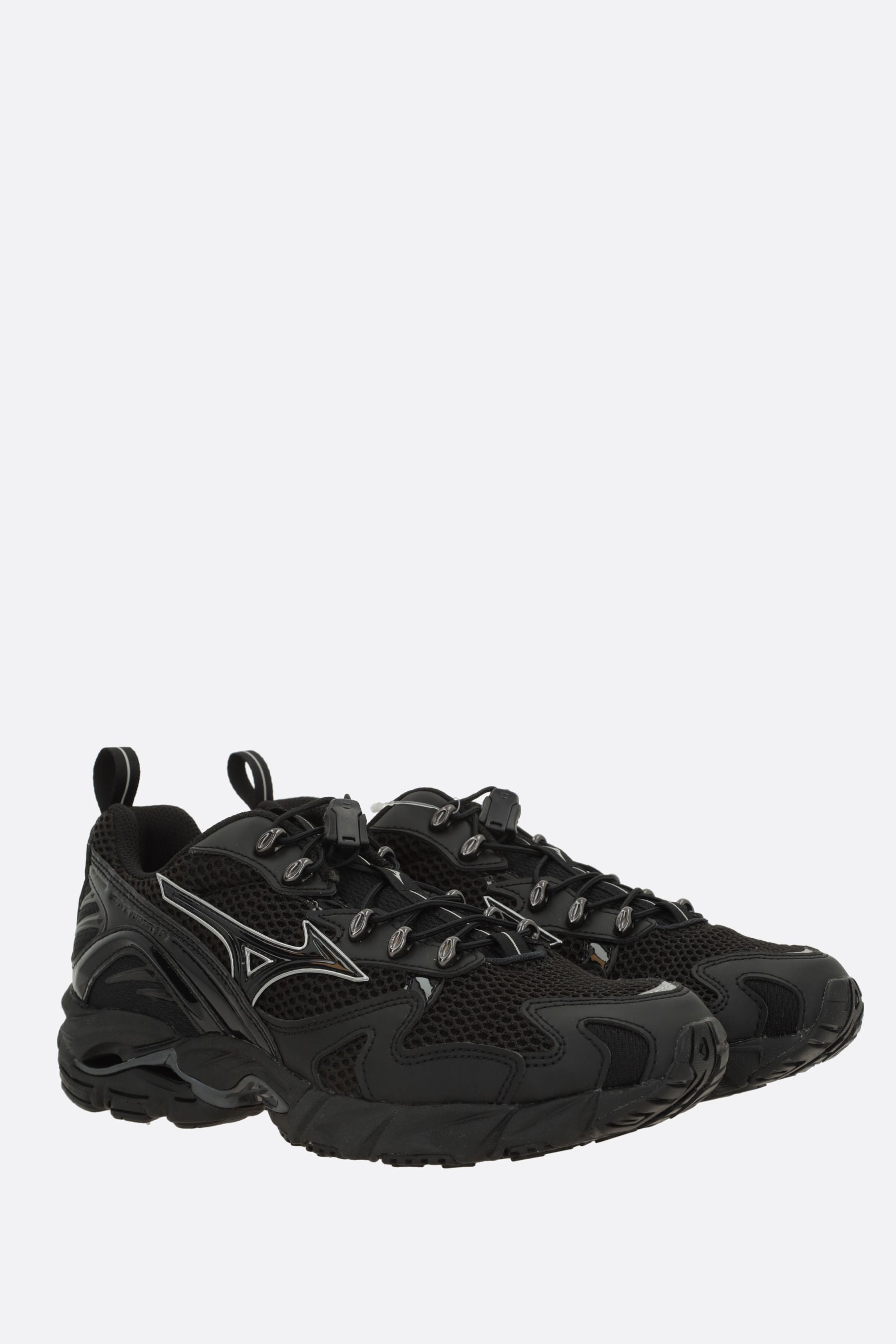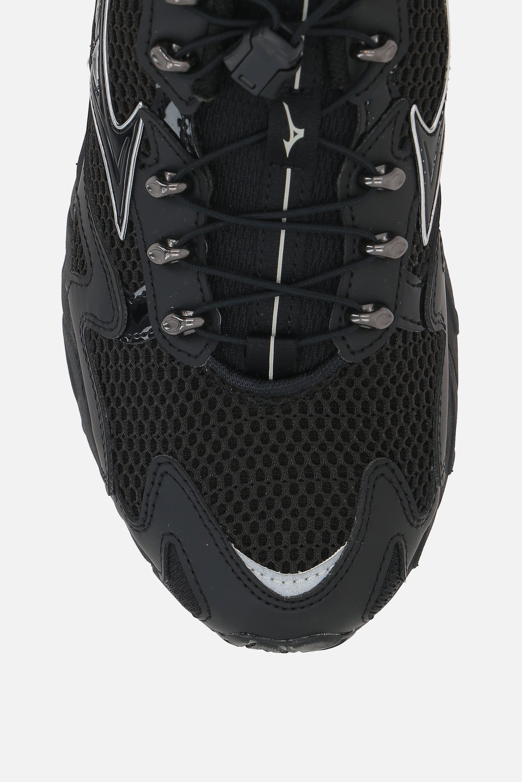 Mizuno sneaker made of black mesh and eco-leather with silver trims and details. Featuring lace-up closure, round toe, fabric lining, and Vibram MegaGrip sole.