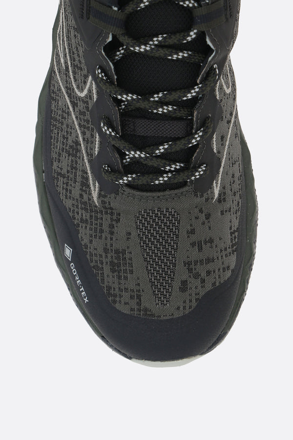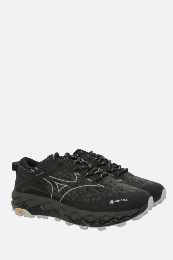 Mizuno low-top sneakers made of black GORE-TEX nylon with reflective details. Features lace-up fastening, round toe, logo placed at various points on the shoe, fabric lining, and a textured Vibram Mega Grip rubber sole.