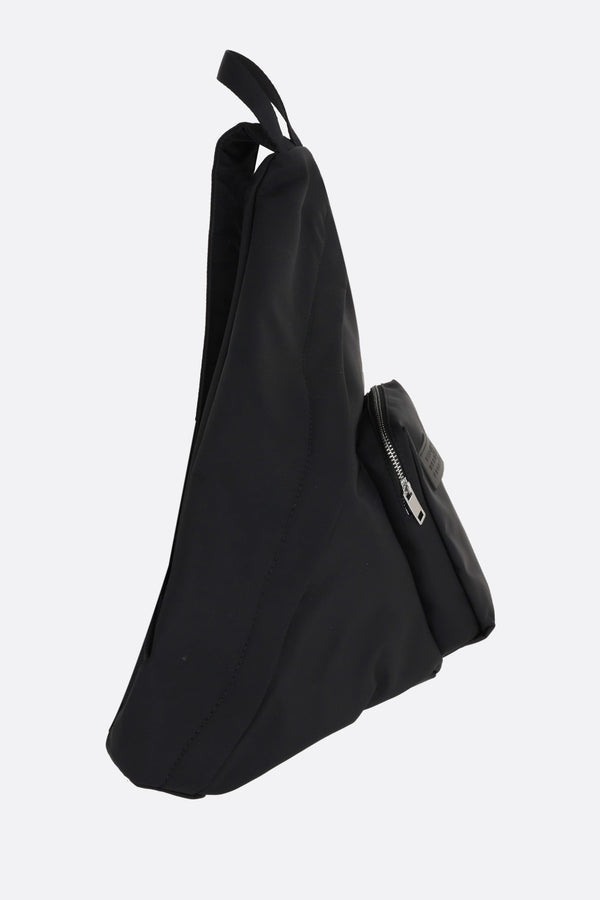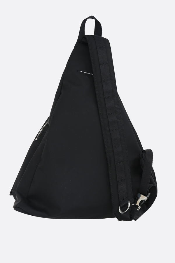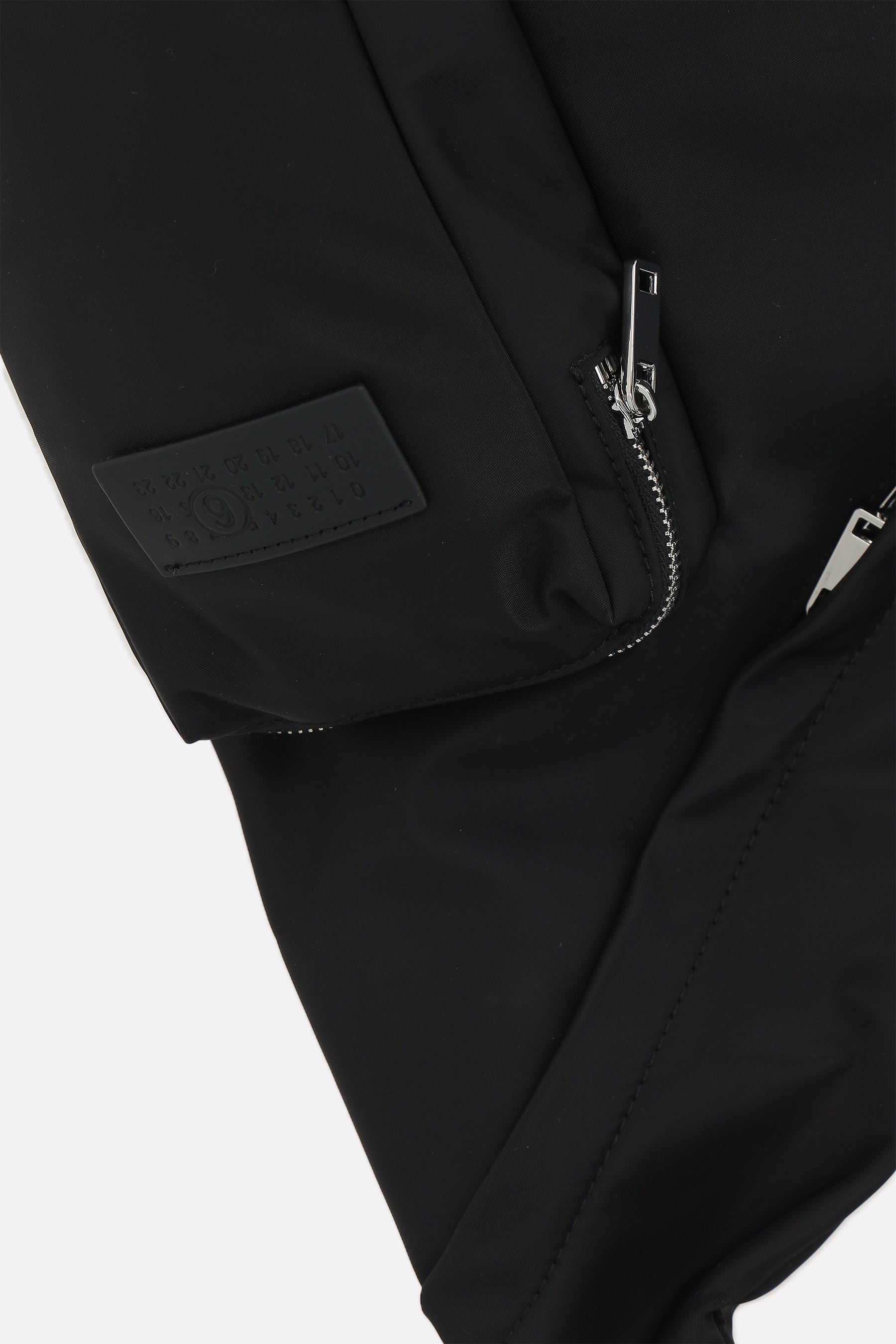 MM6 single-strap backpack crafted in black nylon. Featuring silver-tone hardware, a front zip closure with double slider, top handle, and adjustable shoulder strap. The interior is lined in black nylon. The design is completed by a front zip pocket adorned with the iconic numeric logo label.