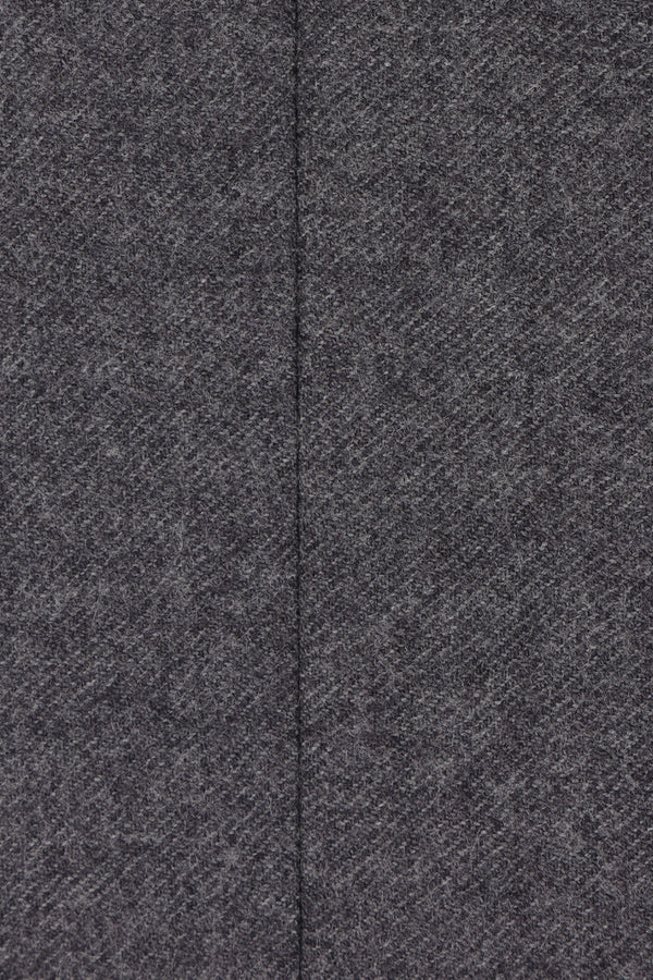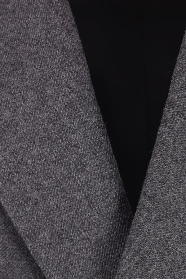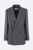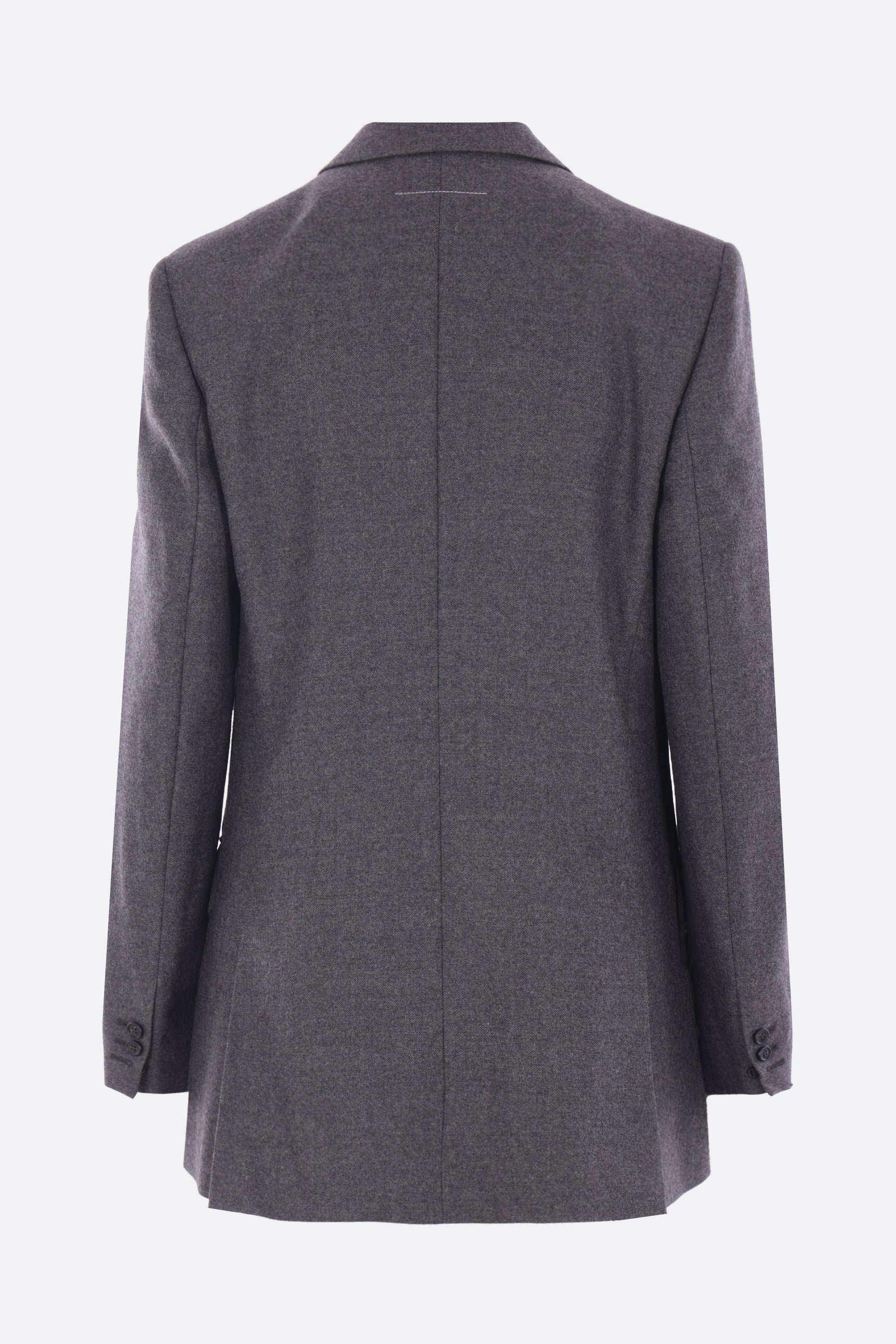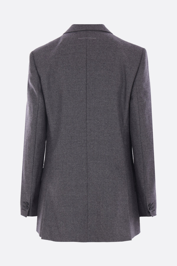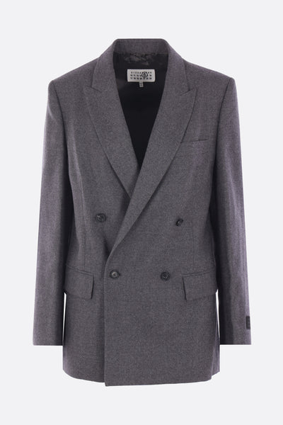 MM6 oversized double-breasted jacket crafted from grey wool, featuring the signature numeric logo label on the cuff. Designed with peaked lapels, button closure, multiple pockets, long sleeves with buttoned cuffs, side slits, and a fully lined interior. The design is completed with the Maison's unmistakable white stitching on the back.
