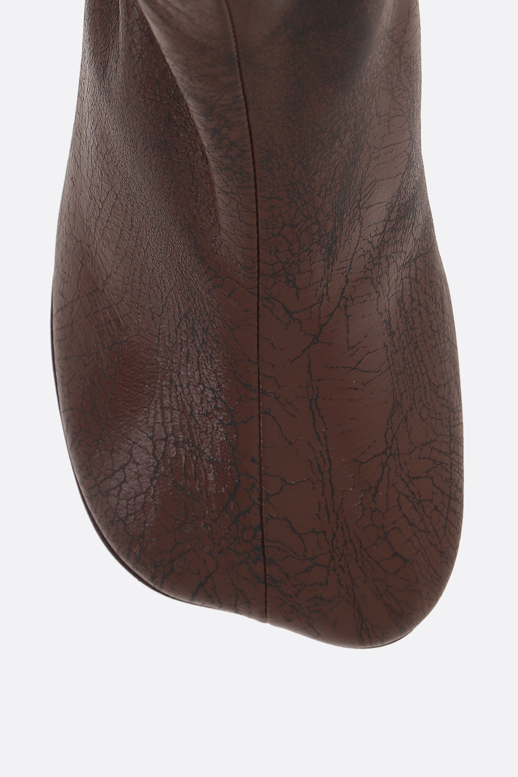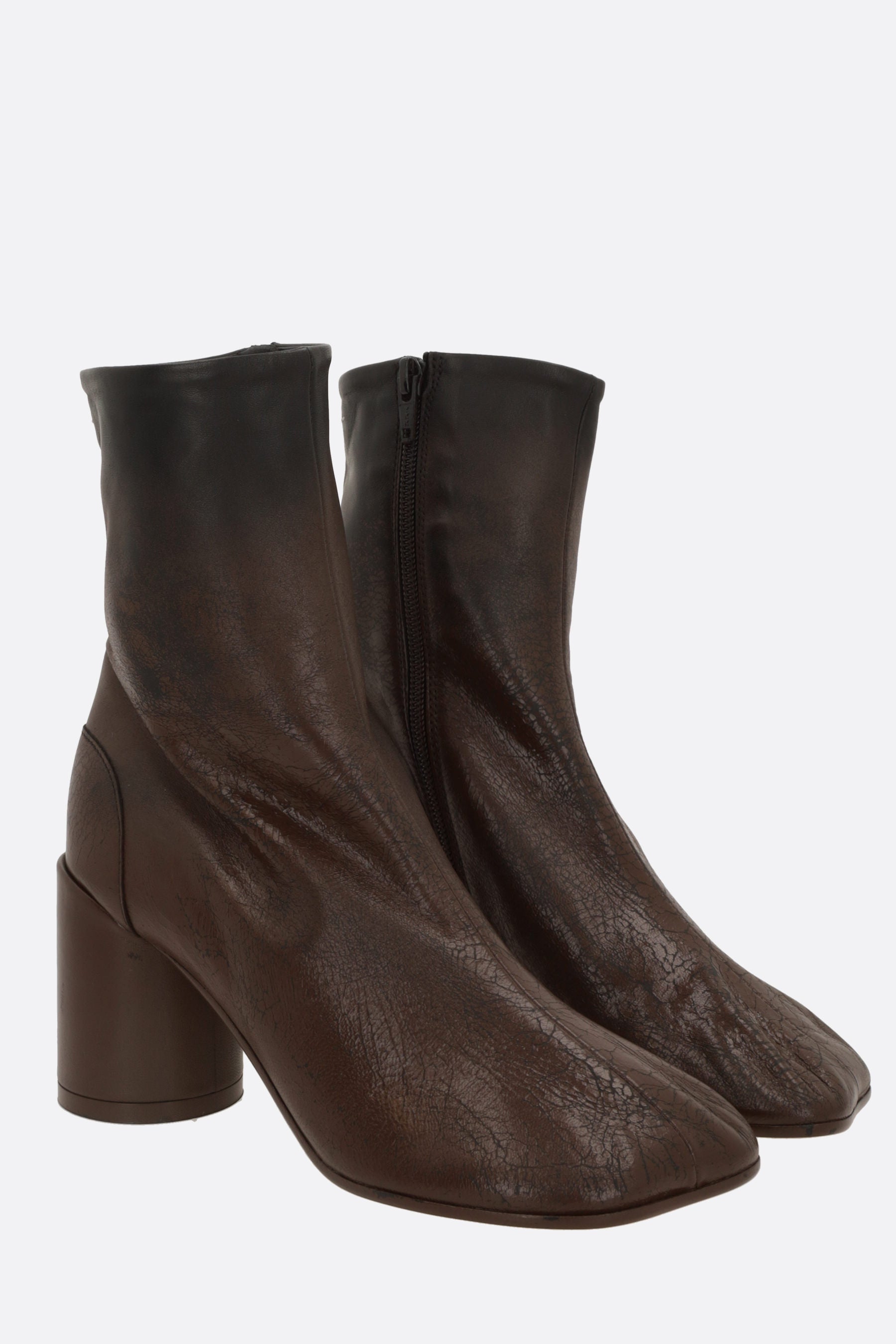 MM6 ankle boots crafted in brown craquelé leather with a shaded effect. Featuring a side zip fastening, anatomical toe, leather lining, and leather sole. The design is completed with a wooden cylindrical heel and the Maison's signature white stitching on the back.