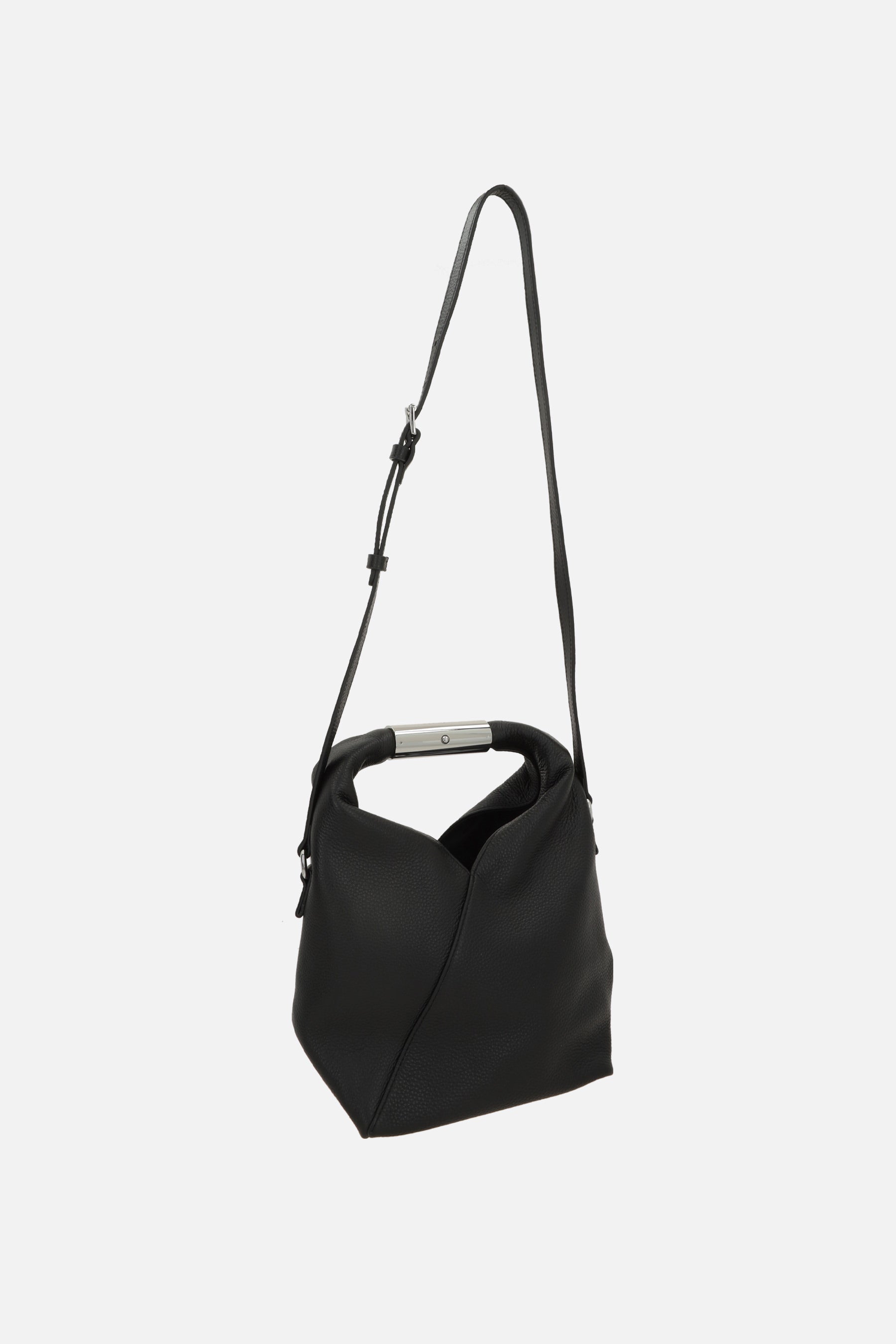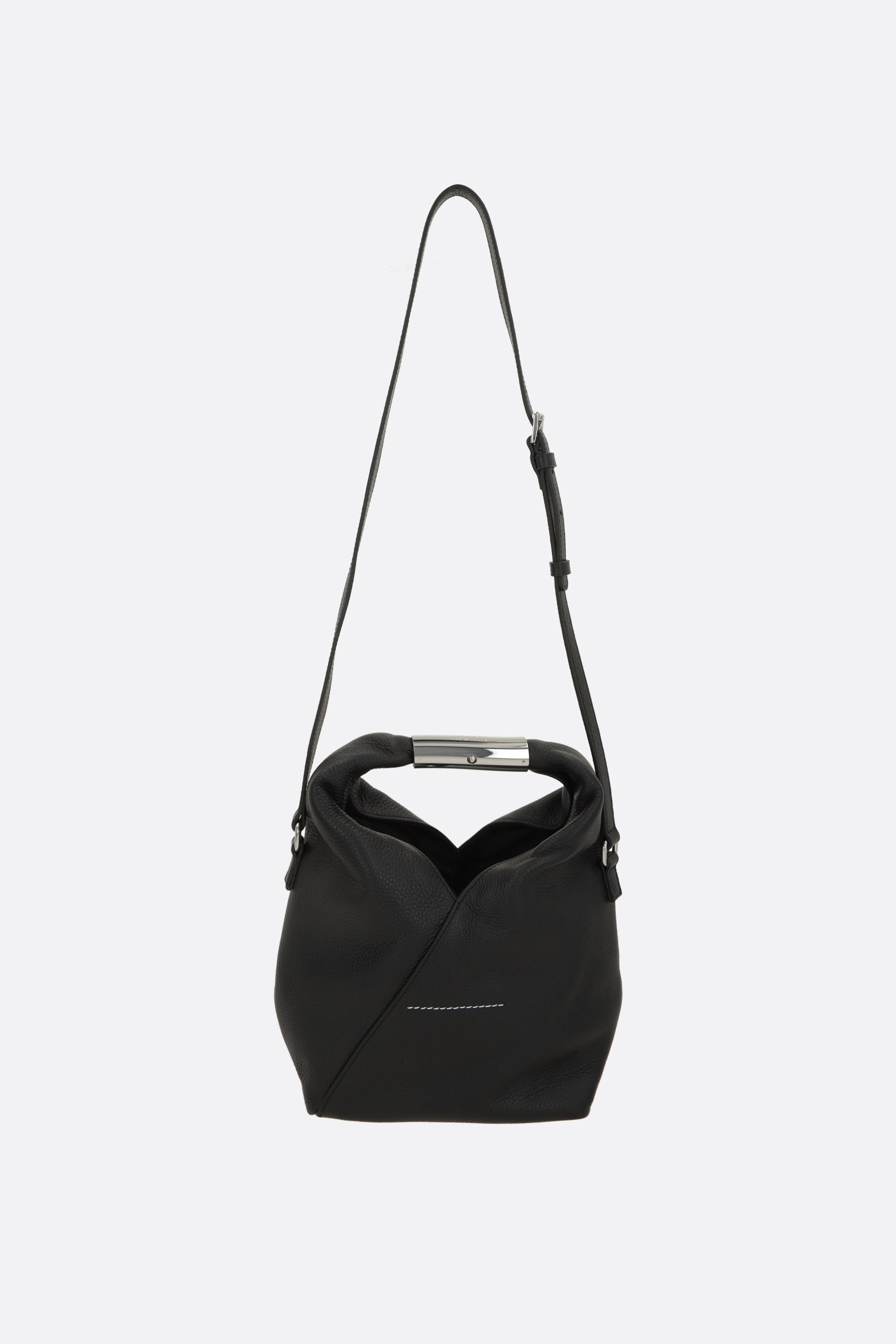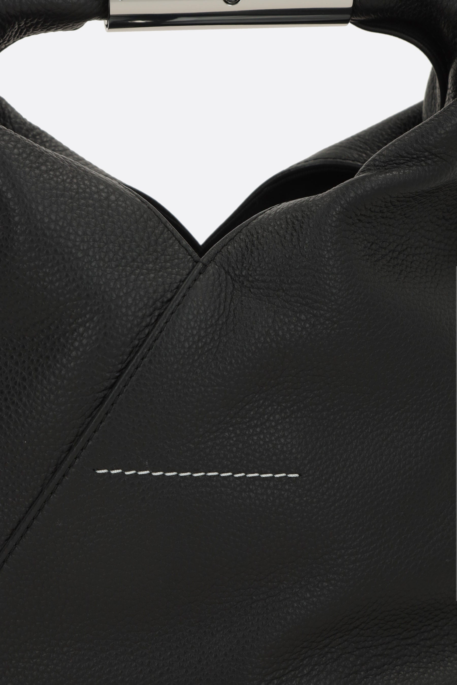 MM6 handbag crafted from black grained leather. Featuring silver-tone hardware, internal snap closure, adjustable and removable shoulder strap, and a tubular metal handle engraved with the signature numeric logo. The interior is lined with tone-on-tone canvas. Completed with the Maison's iconic white stitching on the back.