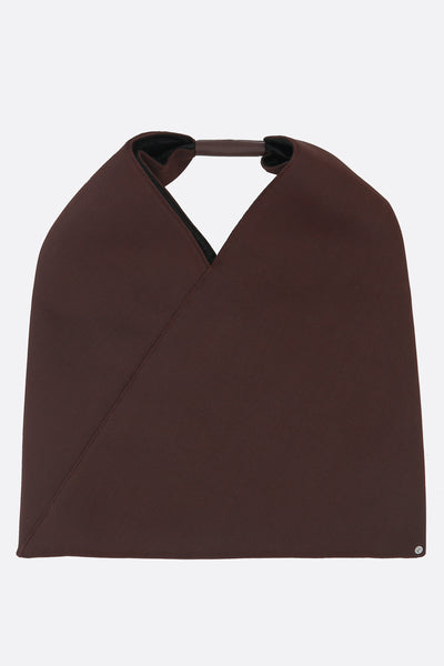 MM6 handbag crafted in black faux leather. It features silver-tone hardware, internal snap-buttoned tab and top leather handle embellished by the iconic numeric logo embossed. Black logoed fabric-lined interior with flat pocket. The design is completed by the unmistakable single white stitch at back.