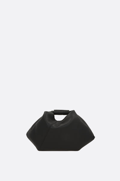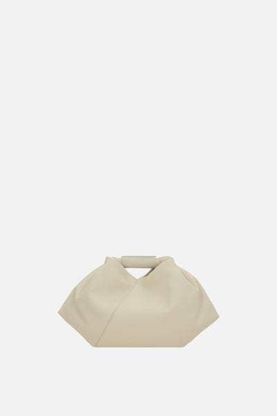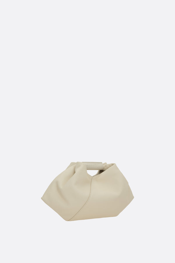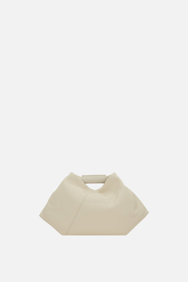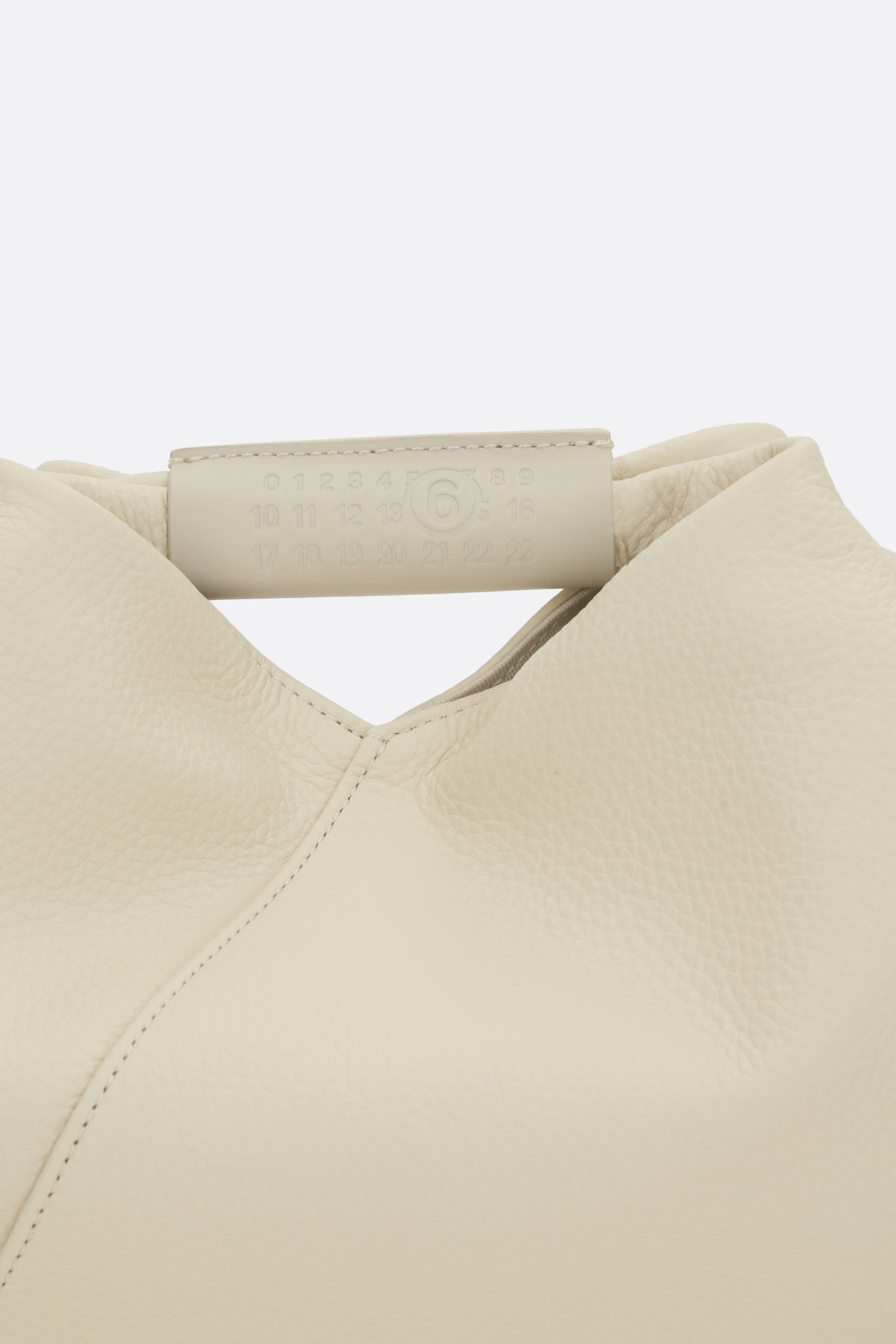 MM6 handbag crafted from ivory grained leather. It features silver-tone hardware, an internal snap-button closure, and a leather top handle decorated with the unmistakable embossed numeric logo. The interior is lined in tone-on-tone canvas. The design is completed by the Maison's signature horizontal stitching on the back.