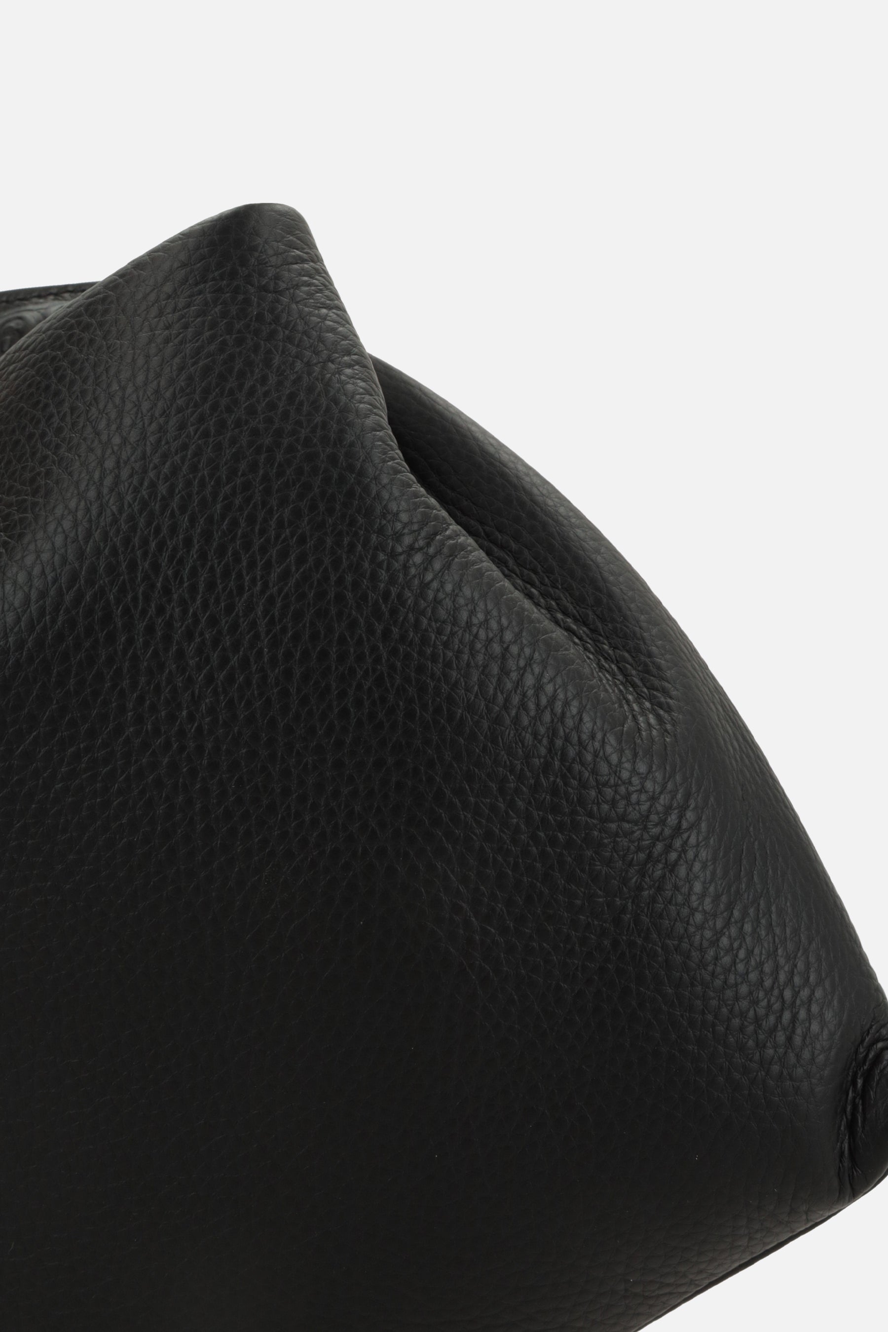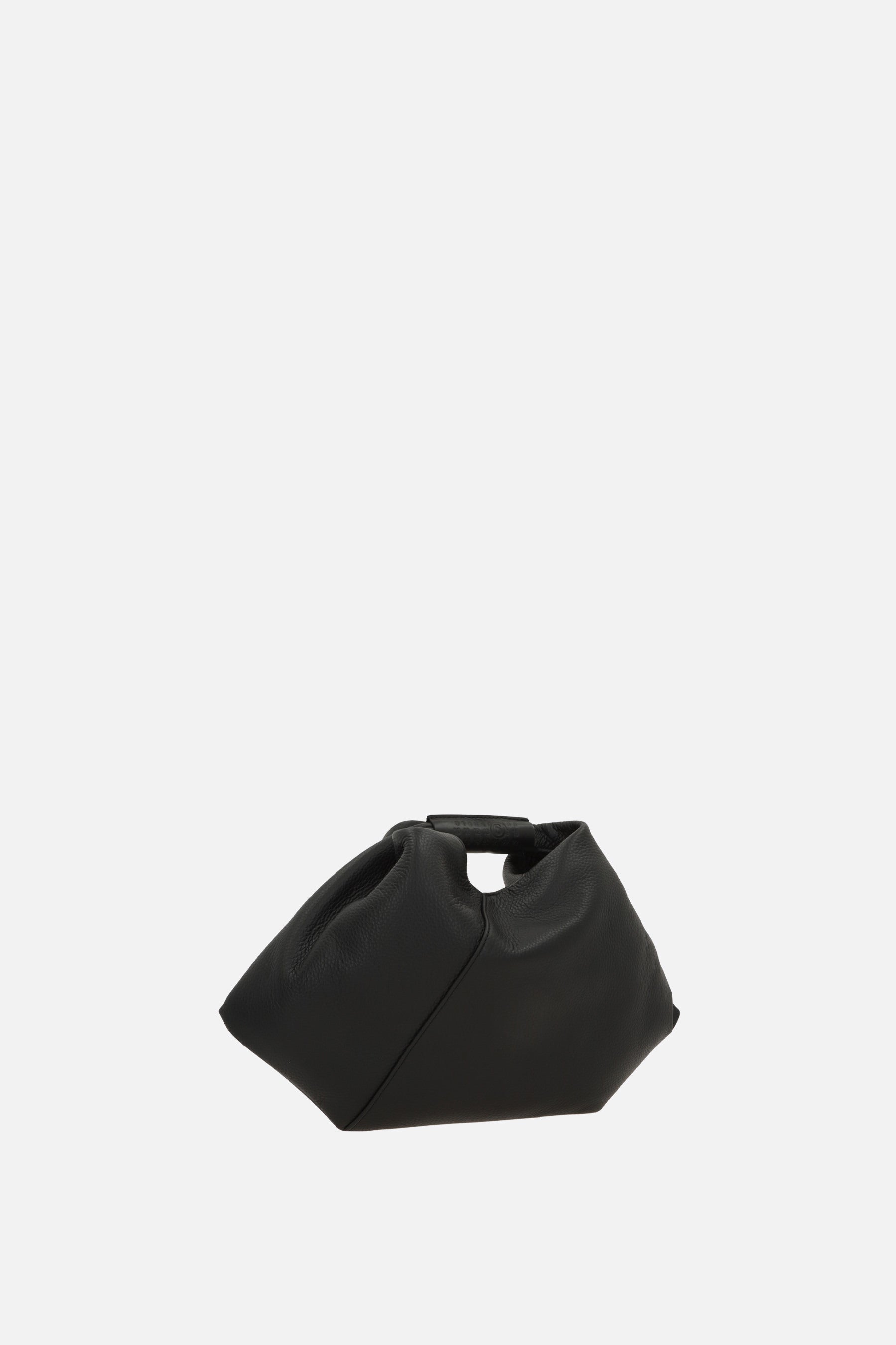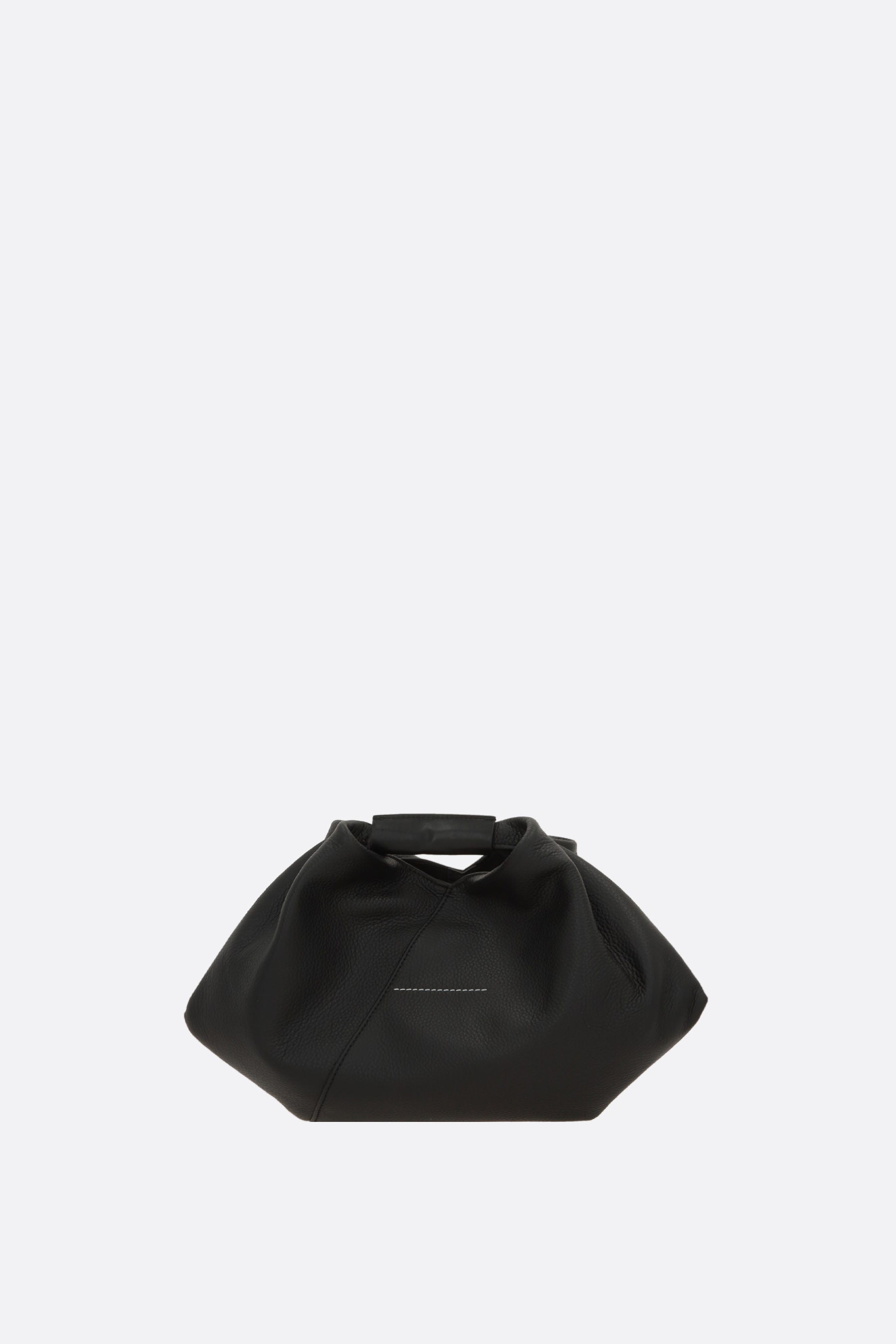 MM6 handbag crafted from black grained leather. It features silver-tone hardware, an internal snap-button closure, and a leather top handle decorated with the unmistakable embossed numeric logo. The interior is lined in tone-on-tone canvas. The design is completed by the Maison's signature horizontal stitching on the back.