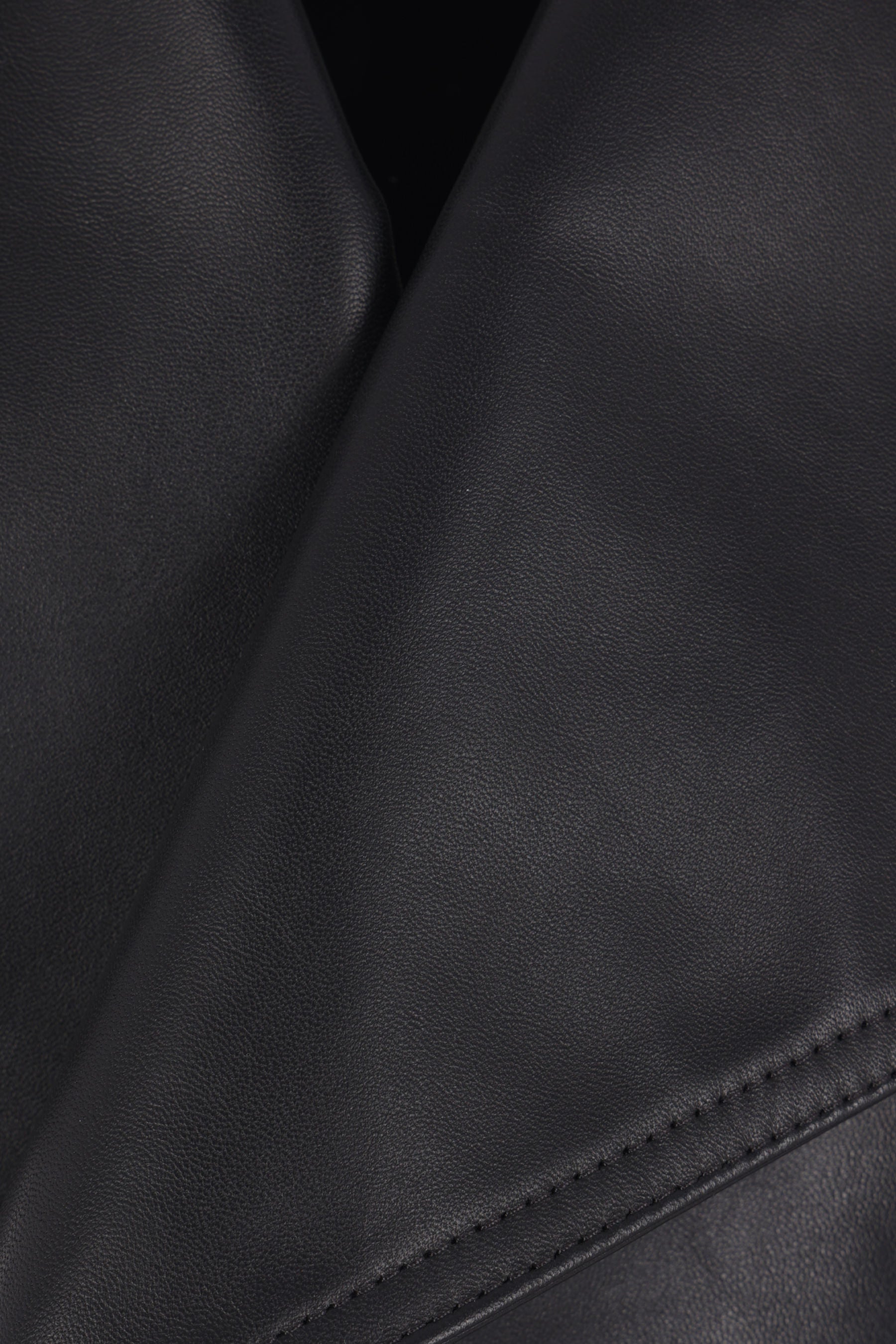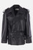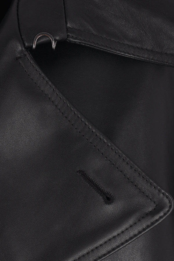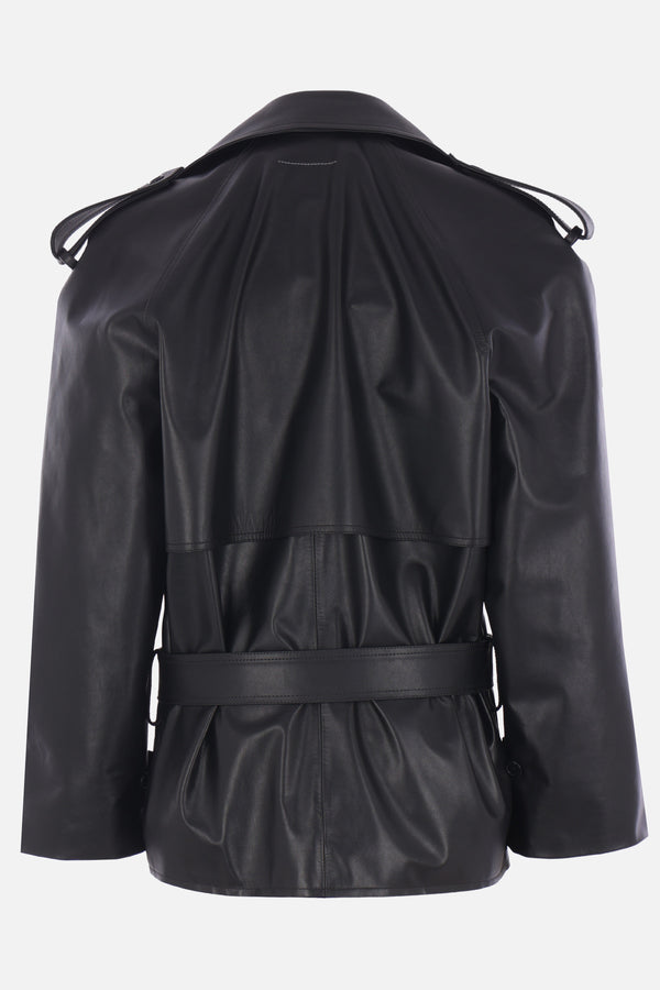 MM6 short trench coat crafted from black leather. Featuring wide lapels, double-breasted button closure, welt pockets, epaulettes on shoulders and cuffs, long sleeves, storm flap, matching belt, and raw-cut hem. Lined interior. The design is completed by the Maison's signature white stitching on the back.
