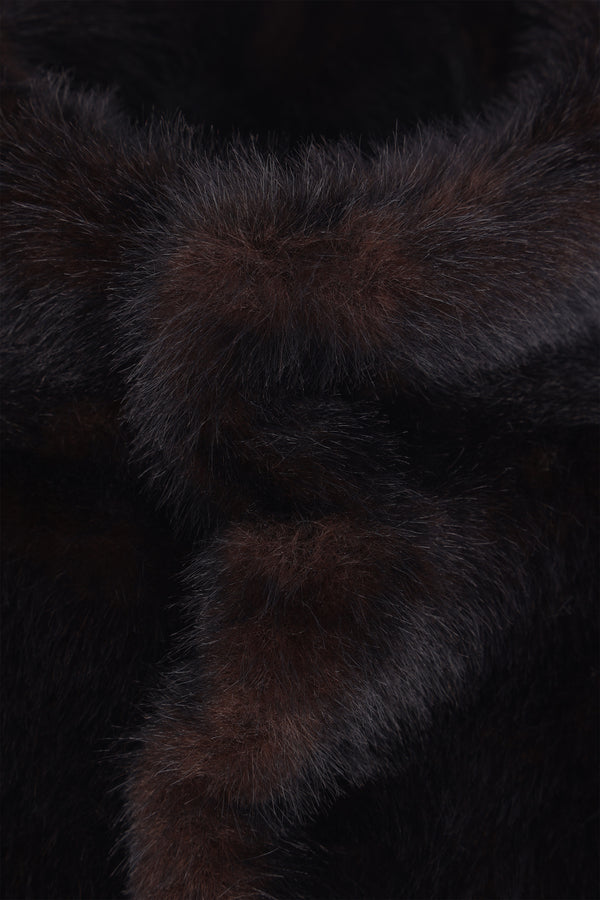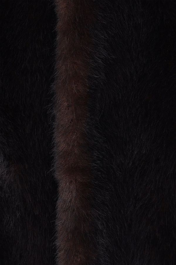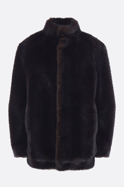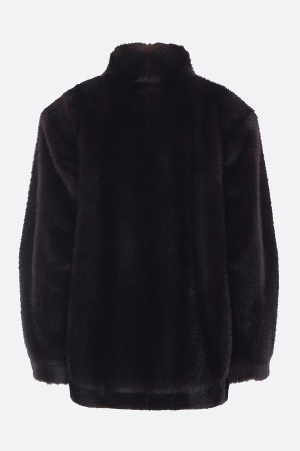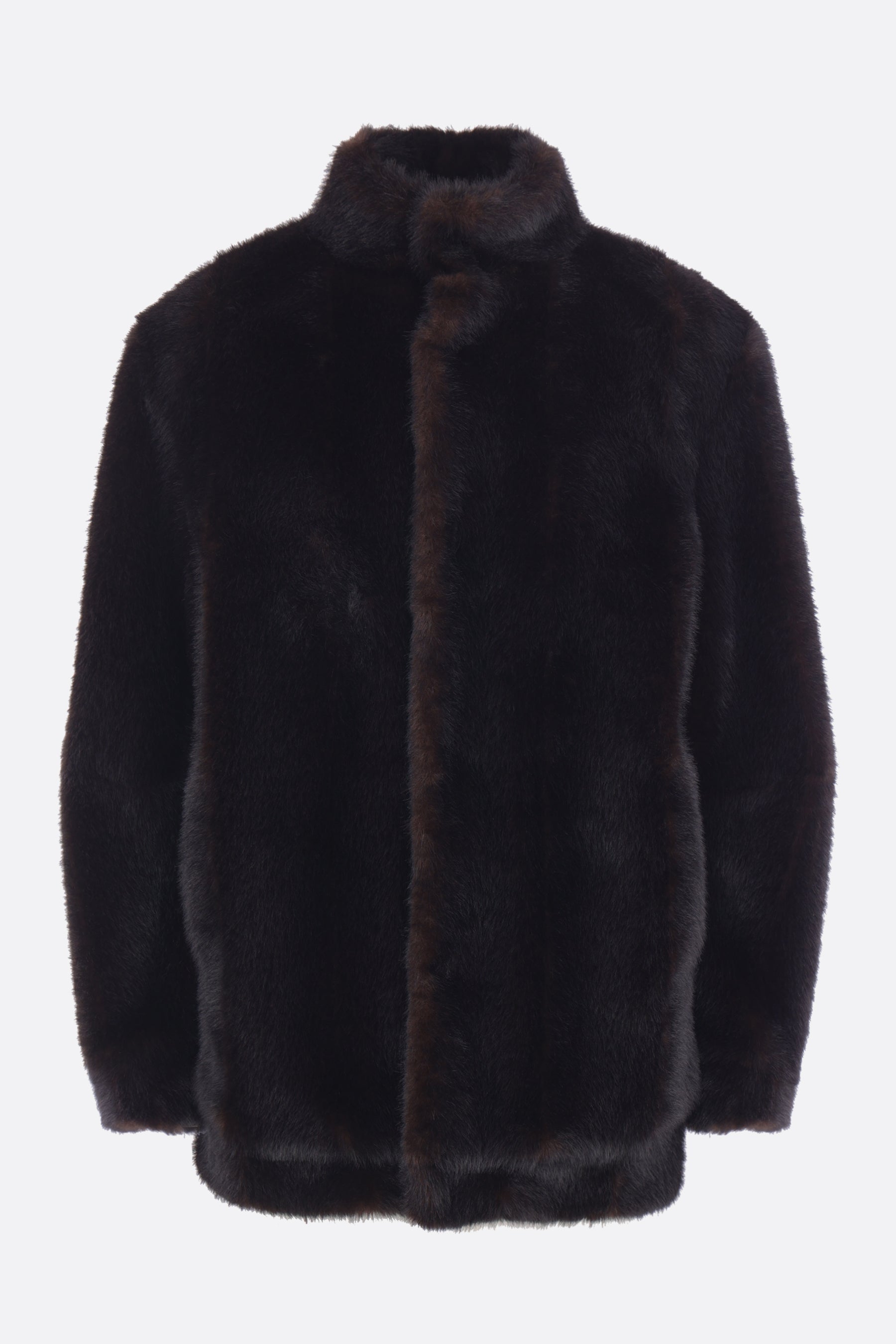 Coat by MM6 made of brown faux fur. Features a high collar, concealed snap button closure, invisible side pockets, long sleeves, and straight hem. Fully lined.