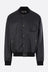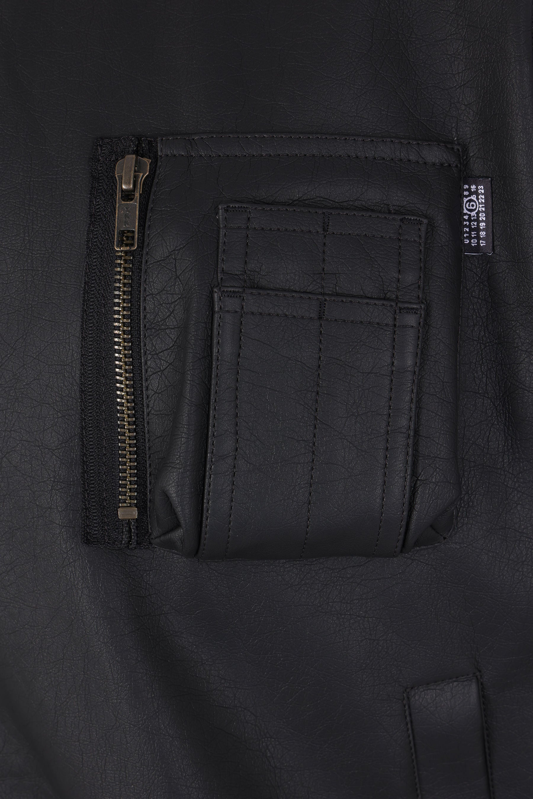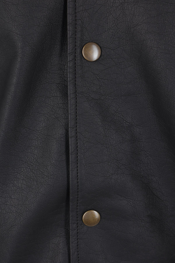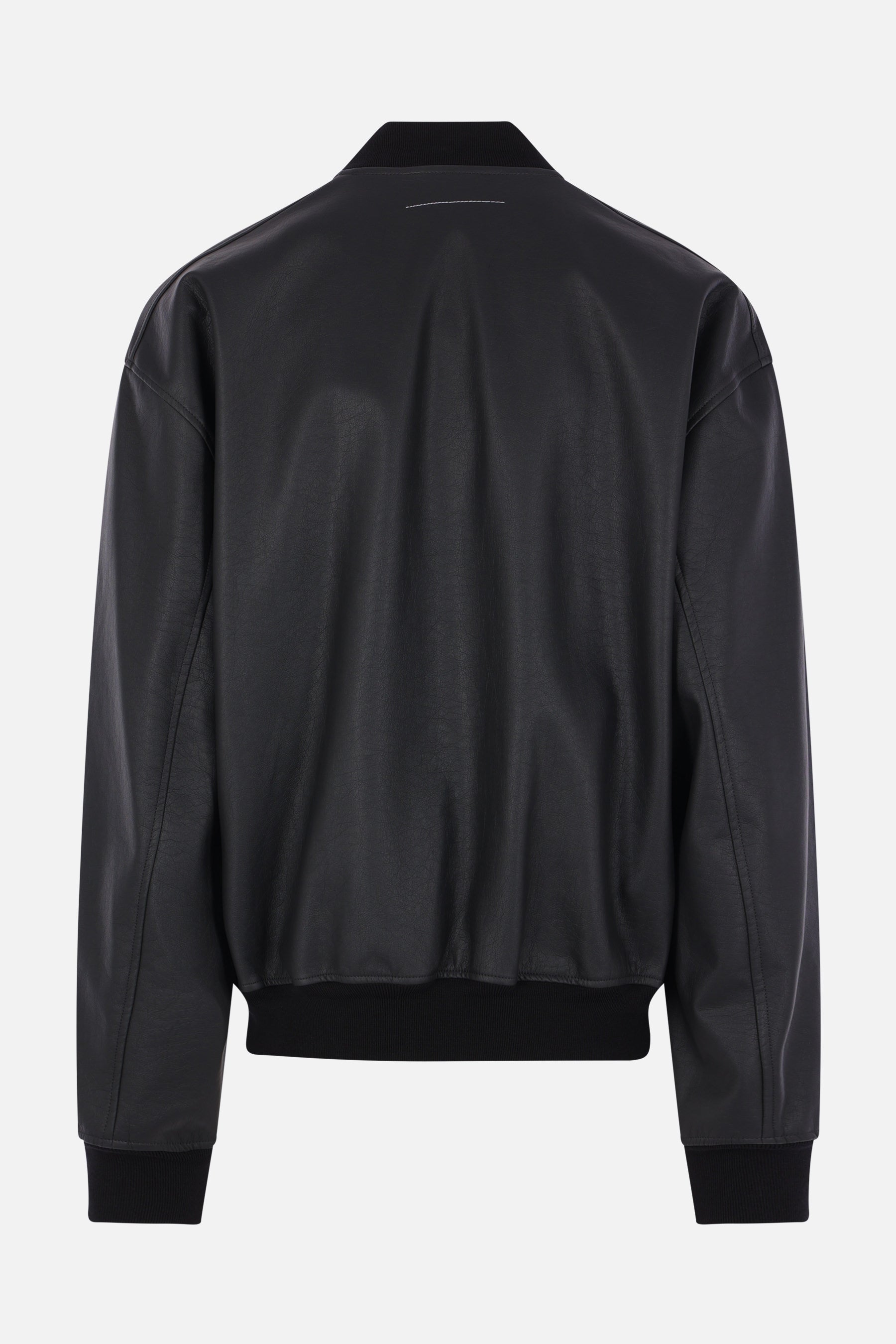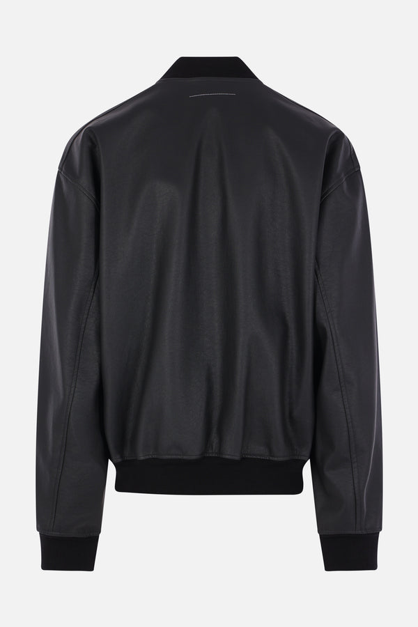 MM6 bomber jacket made of black faux leather. Featuring a bomber collar, front closure with zip and snap buttons, multiple pockets, long sleeves, and ribbed knit edges. Unlined interior. Finished with the Maison's signature white stitch on the back.