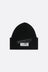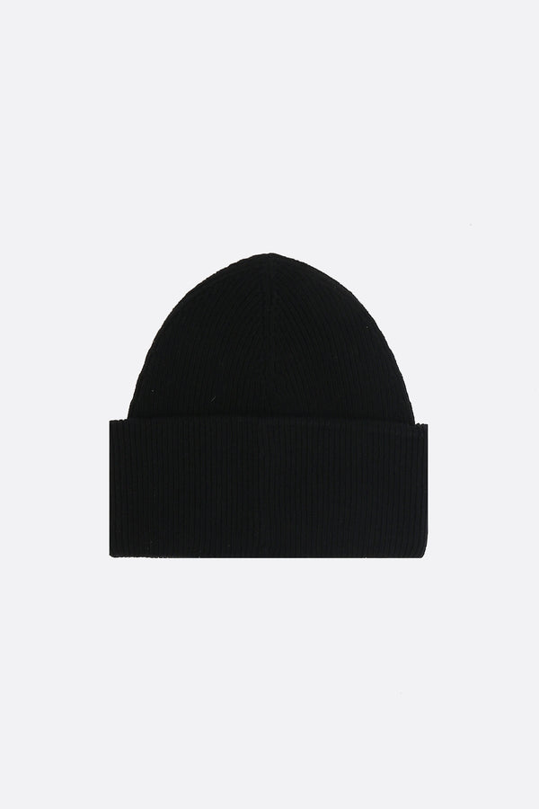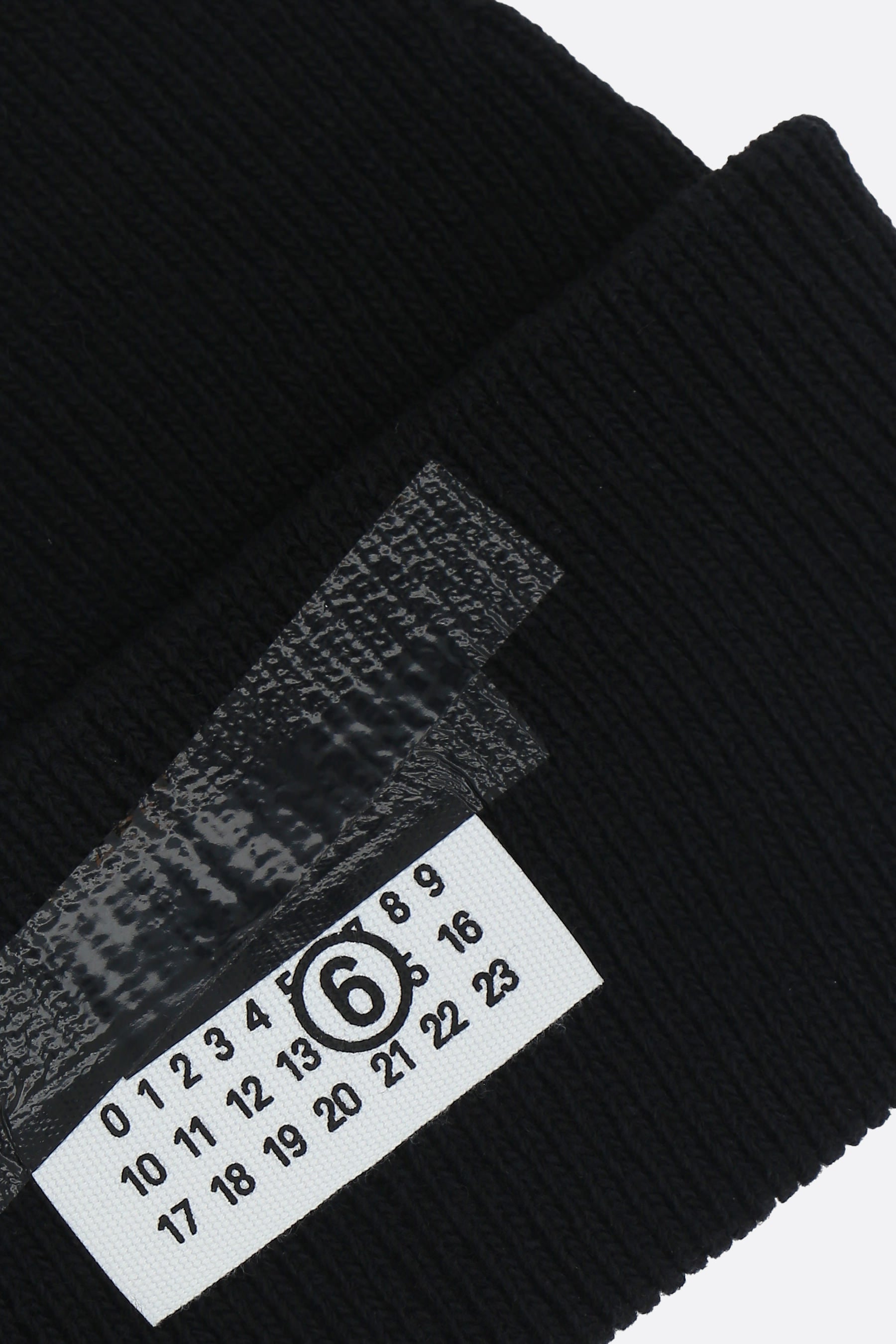 MM6 beanie crafted from black wool-blend ribbed knit, featuring the signature numeric logo label sealed beneath layers of black tape.