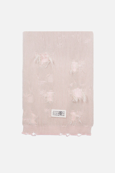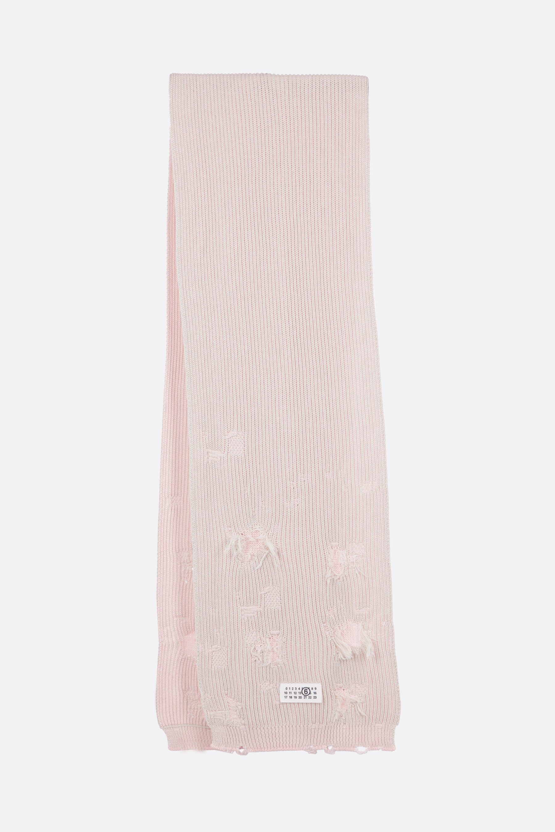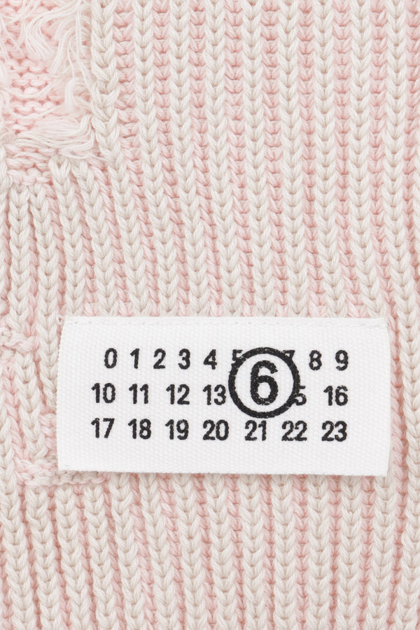 MM6 reversible scarf made of ribbed cotton knit, light pink on one side and ecru on the other, with a frayed effect. Featuring all-over distressing and a numeric logo label on one end.