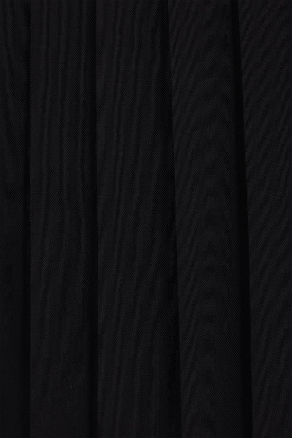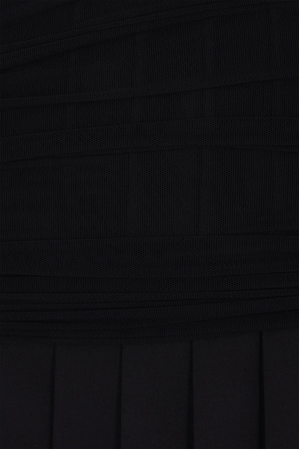 MM6 pleated skirt crafted from black wool blend with an overlapping tone-on-tone stretch mesh panel. Featuring a side invisible zip closure and unlined interior. The design is completed with the Maison's signature white stitch on the back.