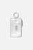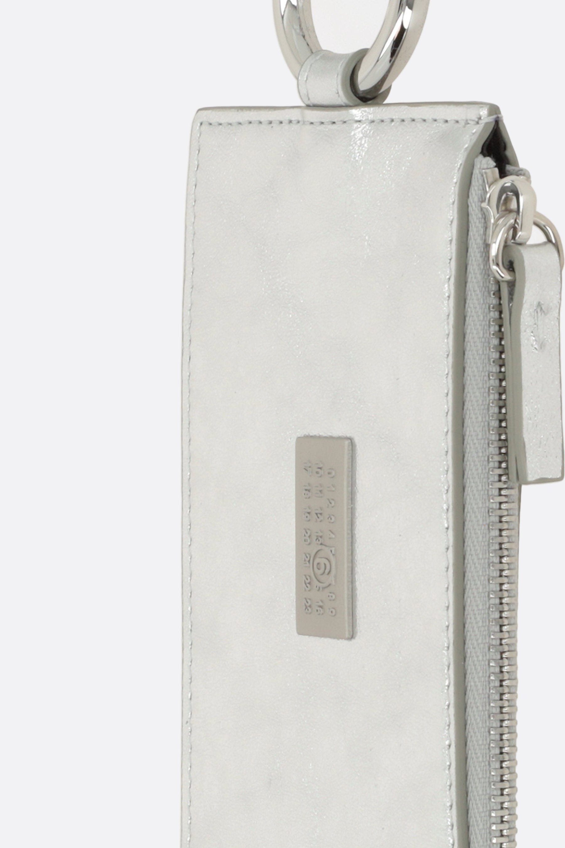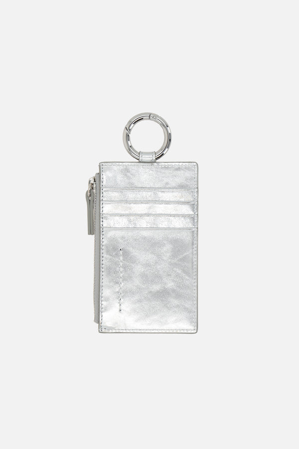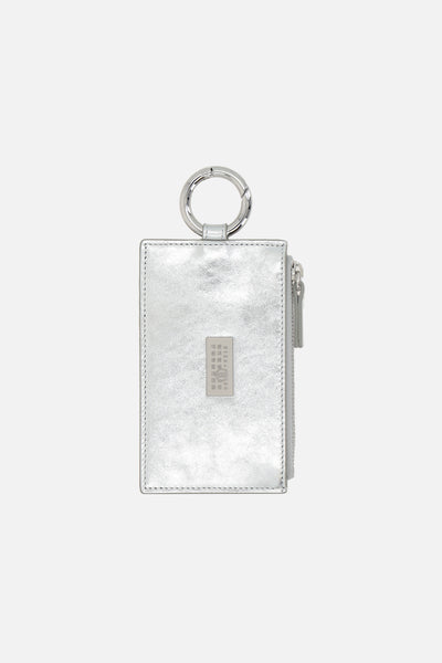 MM6 credit card holder made of silver laminated leather, featuring a numeric logo patch applied on the front. It is characterized by four card slots, a zip coin pocket, and a key ring. The unmistakable white stitching of the Maison on the back completes the design.