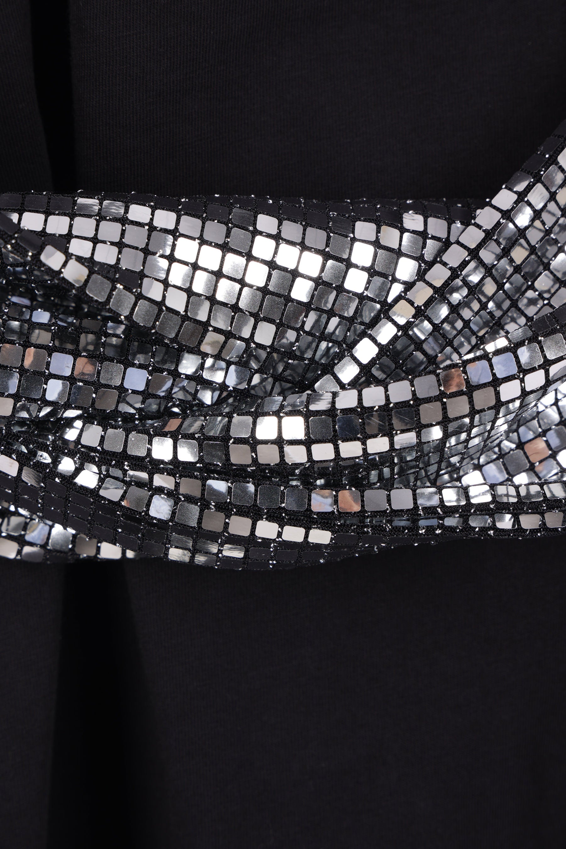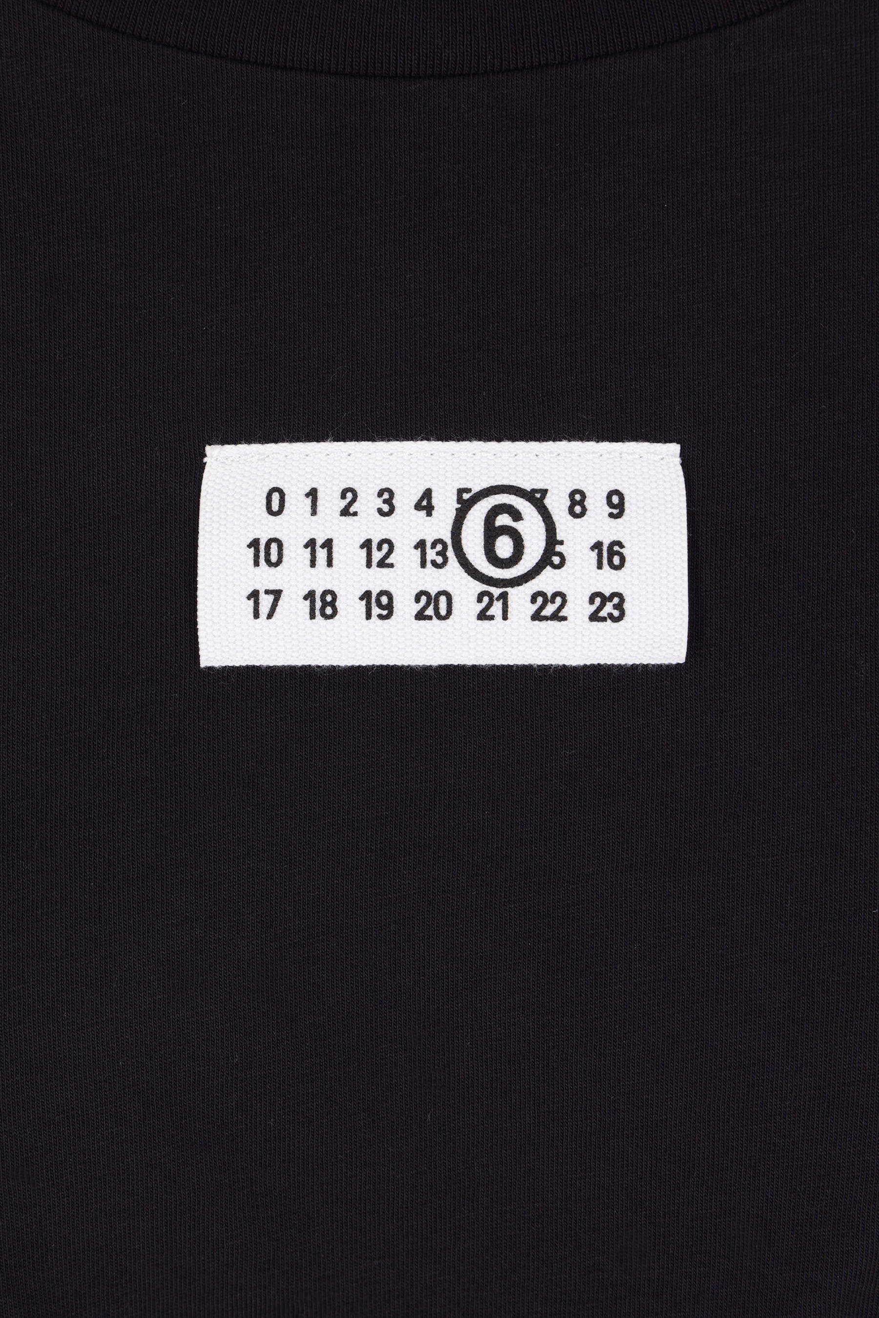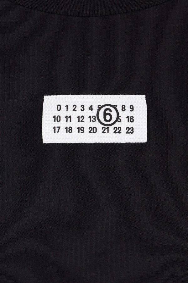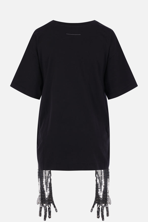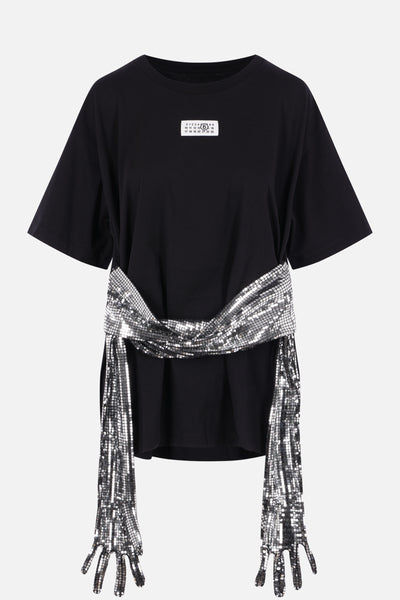 MM6 t-shirt crafted from black cotton jersey, featuring a numeric logo label on the chest. It has a crew neckline, short sleeves, attached long gloves with silver sequins tied at the waist, and a straight hem. The design is completed by the Maison's signature white stitching on the back.