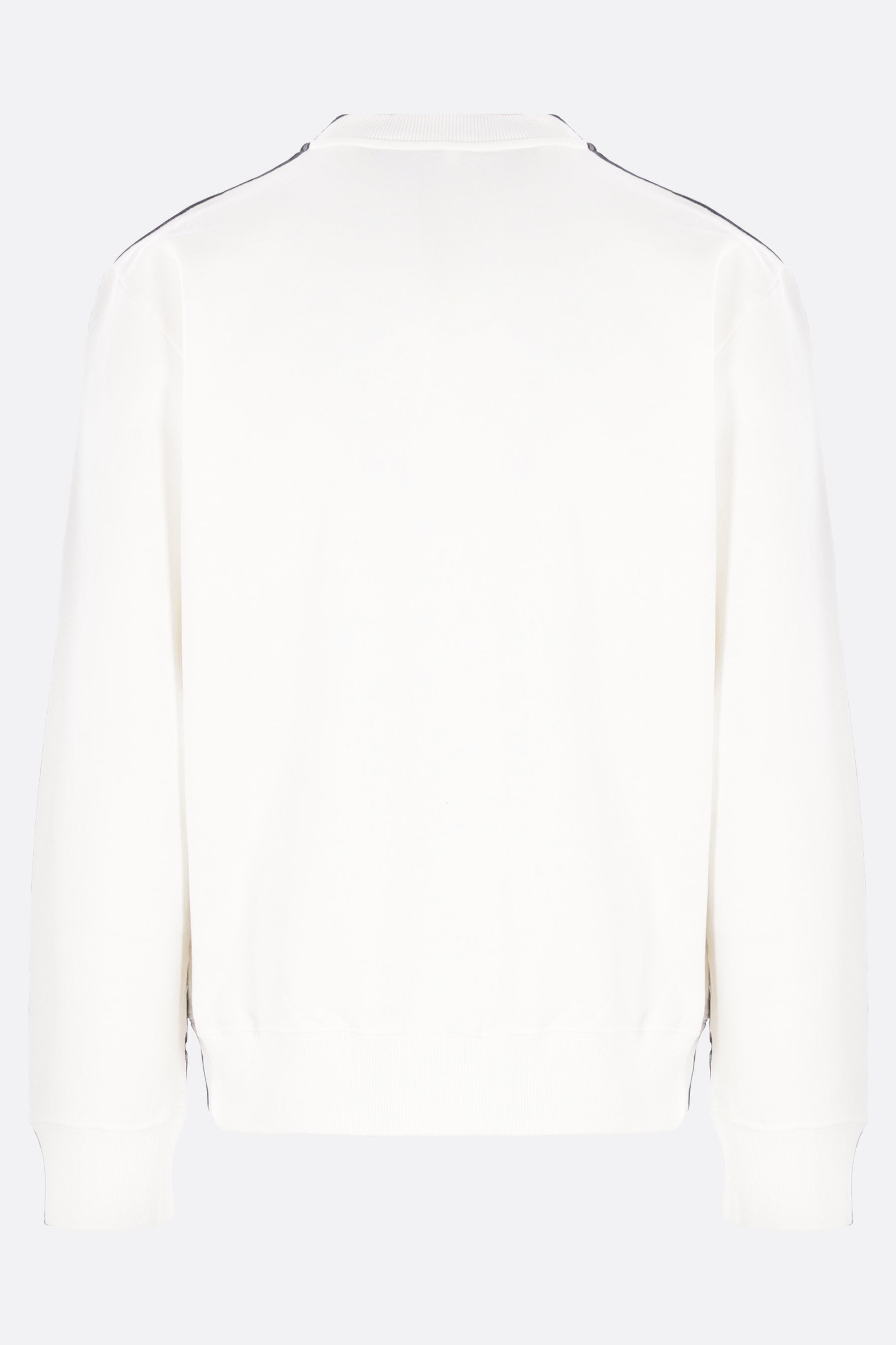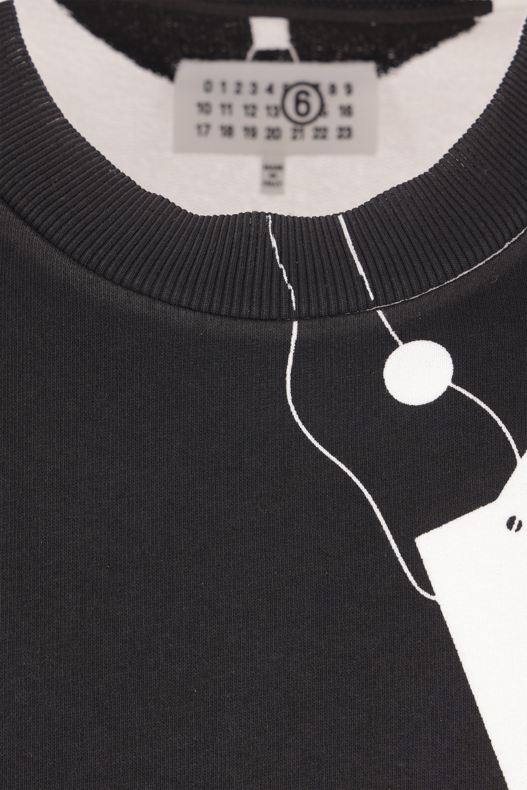 MM6 sweatshirt made of black and white cotton jersey with a trompe-l'œil effect screen-printed graphic. Featuring a crew neckline, long sleeves, and ribbed trims. The design is completed by the Maison's signature white stitching on the back.