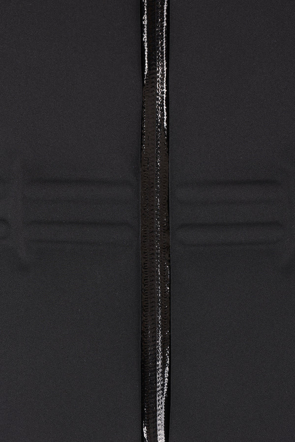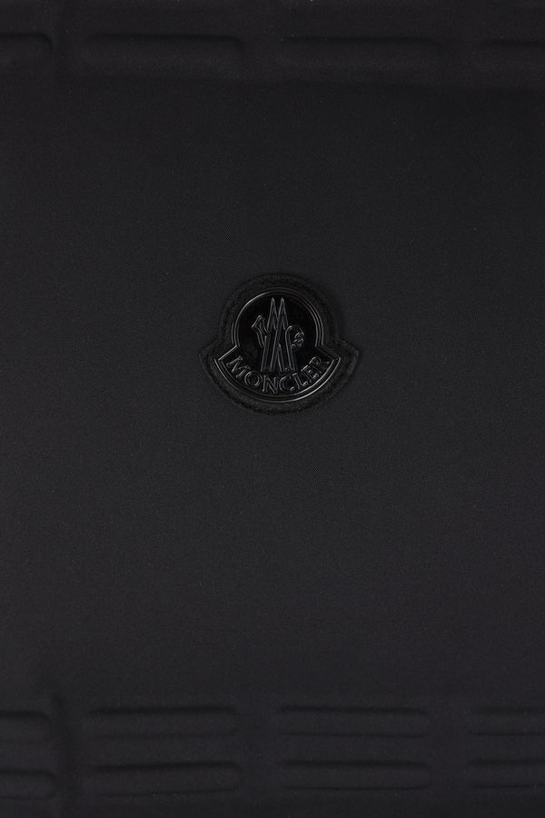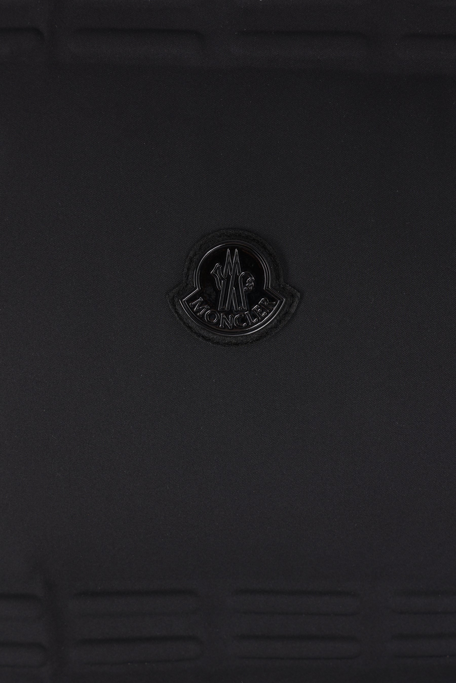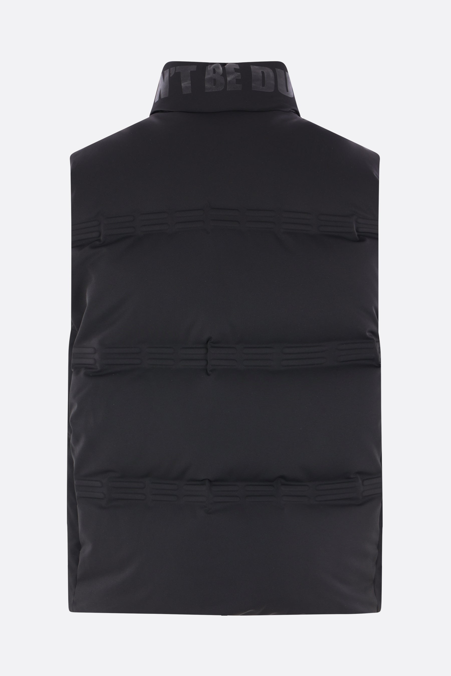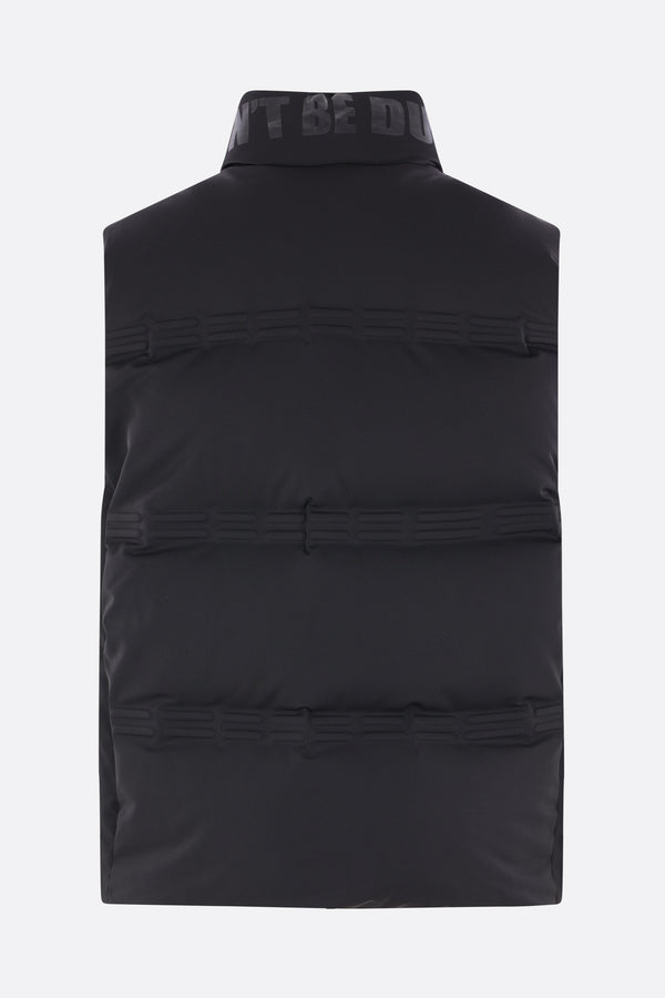 Moncler Genius sleeveless down jacket made of black 4-way stretch nylon with a logo patch applied on the chest. It features a high collar, front closure with double-slider zip, side zip pockets, and a straight hem. The design is completed by the “Don't be dumb” print on the collar. Collection 1 A$AP Rocky.