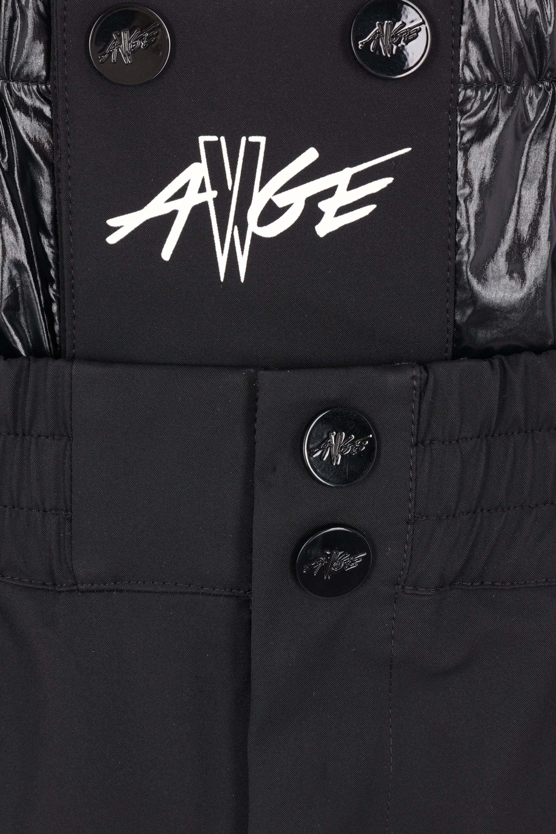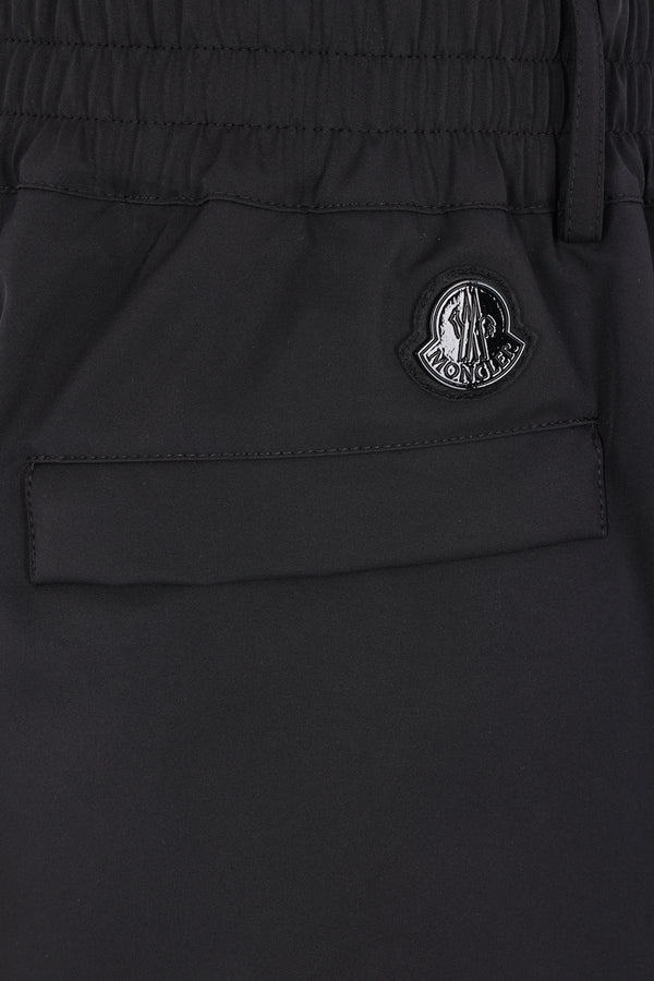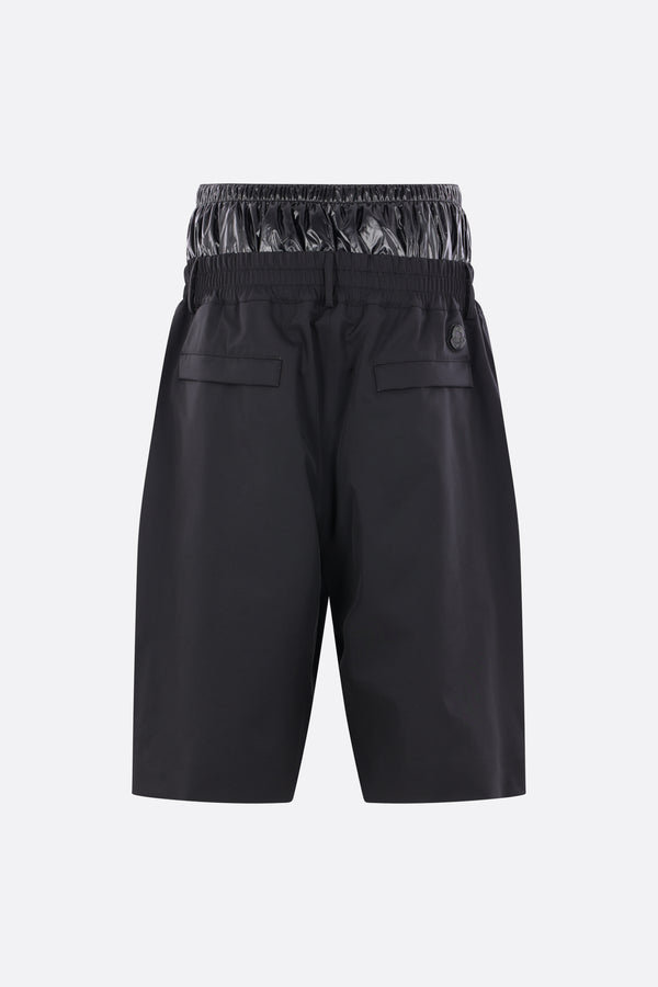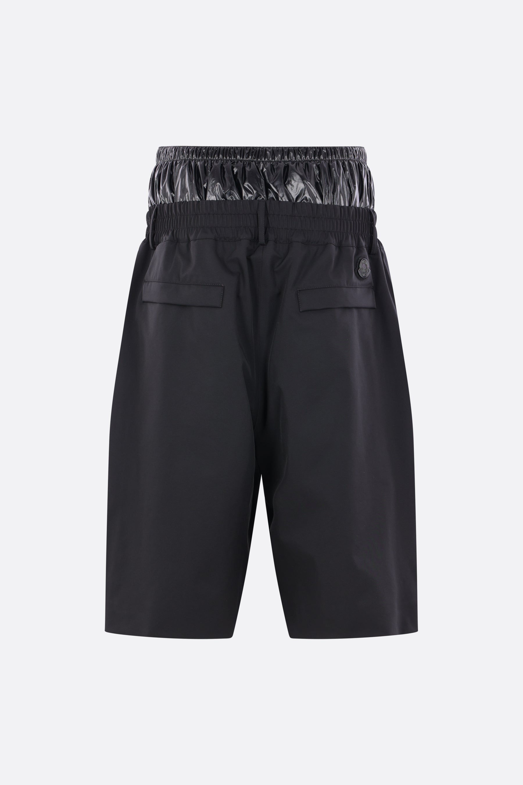 Moncler Genius oversized shorts made of black 4-way stretch nylon with a padded shiny nylon waist gaiter. Featuring an elasticated waistband, front closure with snap buttons and zip, belt loops, and multiple pockets. The design is completed by the iconic logo patch on the back. Collection 1 A$AP Rocky.