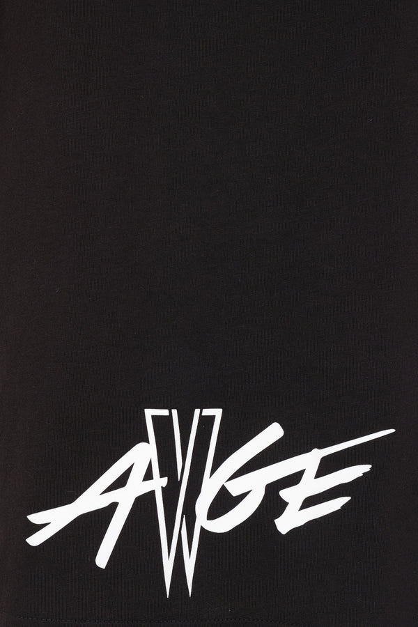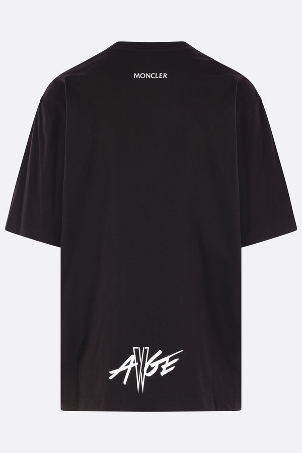 Moncler Genius oversized t-shirt crafted from black cotton jersey, featuring a logo lettering print at the back of the neck and a graphic print on the hem. Featuring a crew neckline, short sleeves, and a straight hem. The design is completed with the iconic logo patch on the chest. Collection: 1 A$AP Rocky.