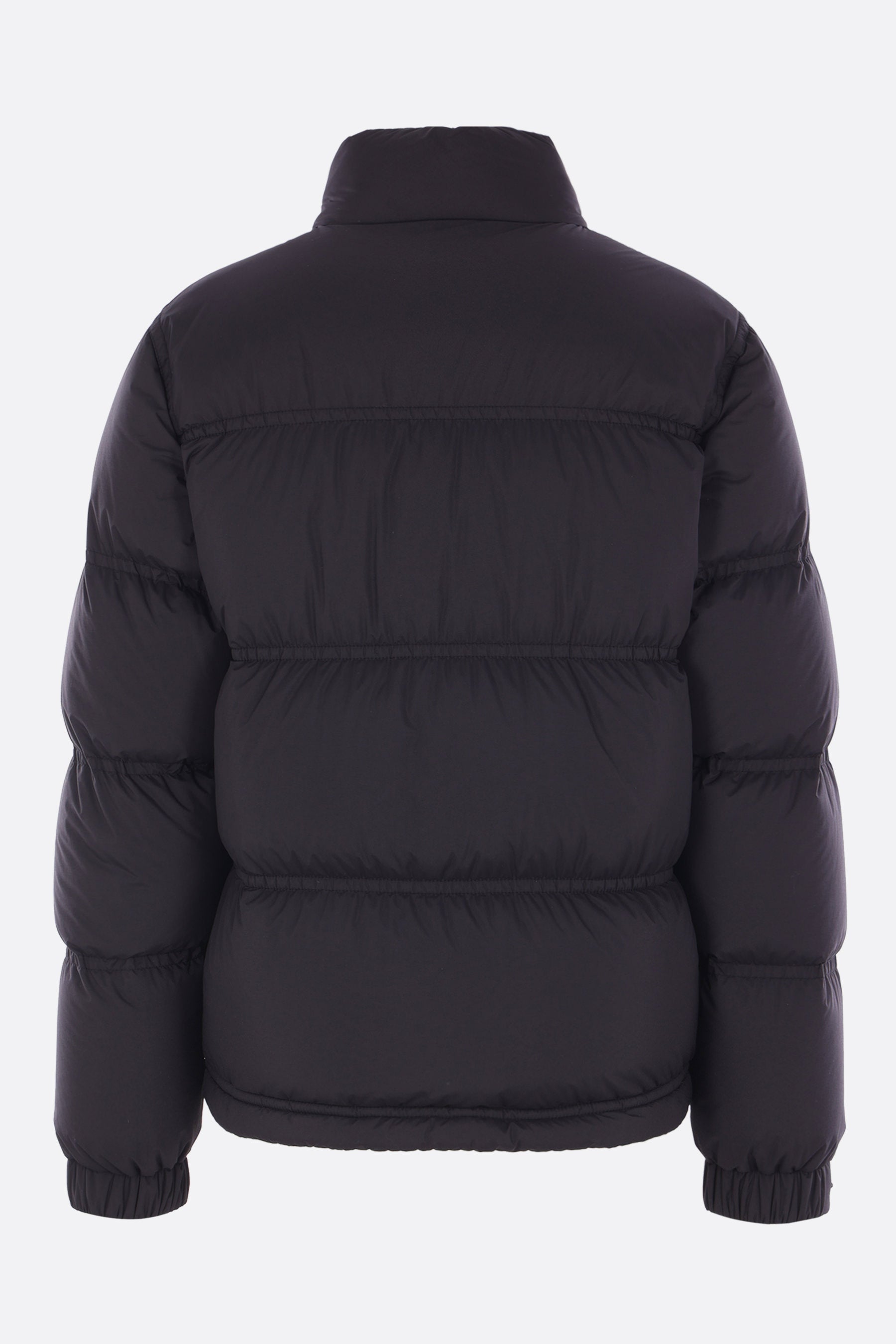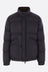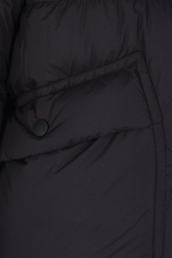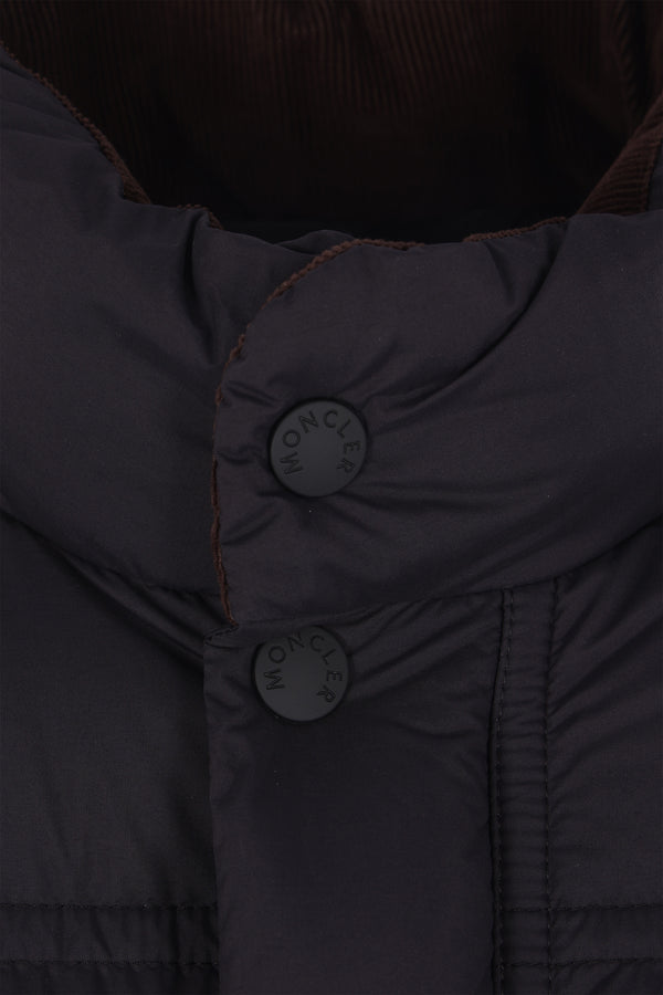 Moncler Grenoble down jacket crafted from black nylon with logo patch on the left sleeve. Featuring high collar with brown corduroy lining, two-way zip and snap button closure, front pockets, long sleeves with elasticated cuffs, straight hem with drawstring, and faux fur-lined interior.