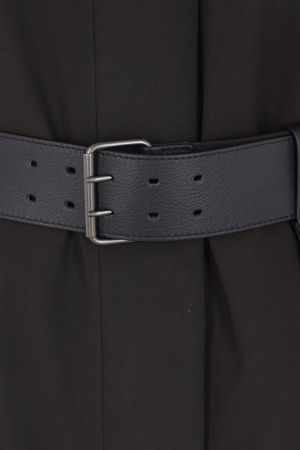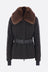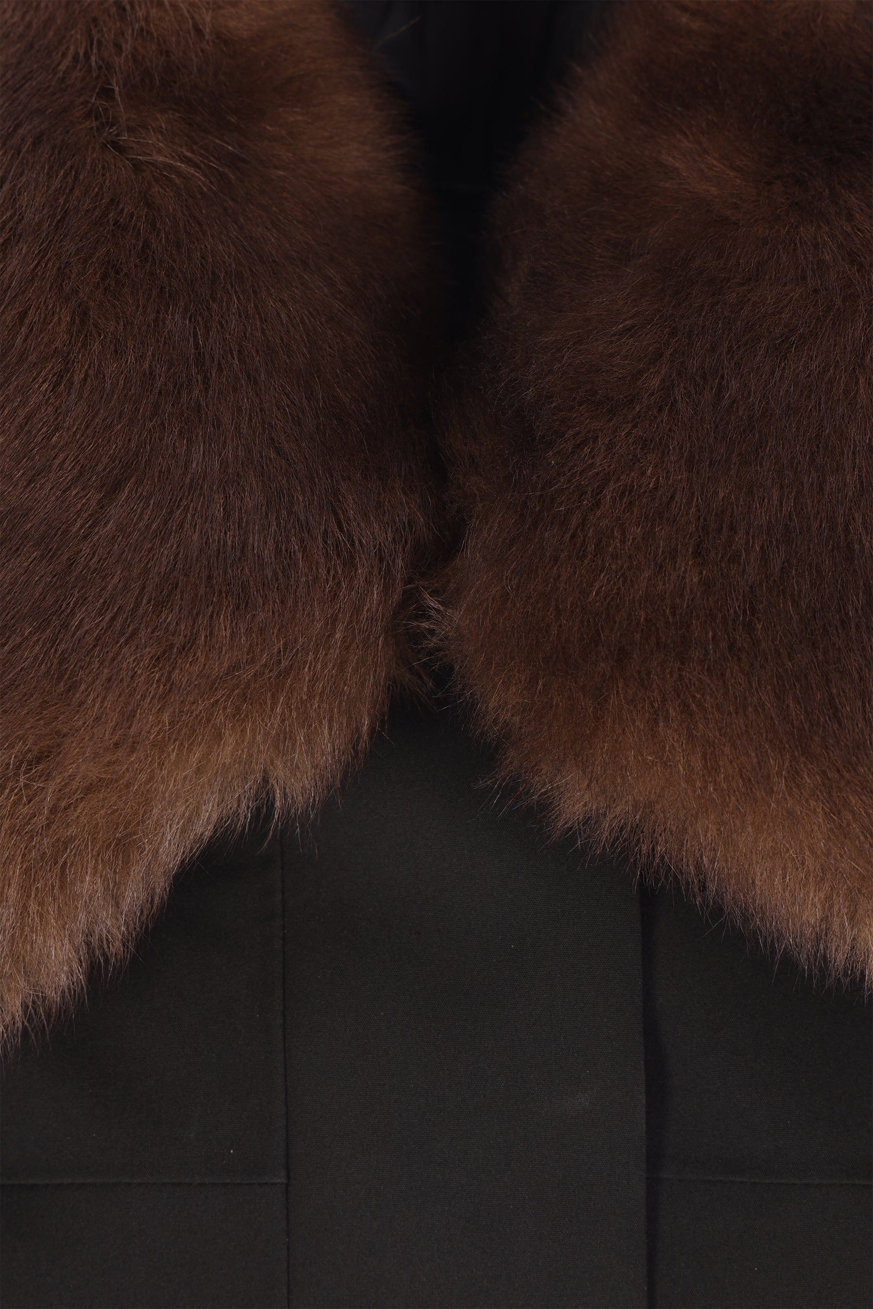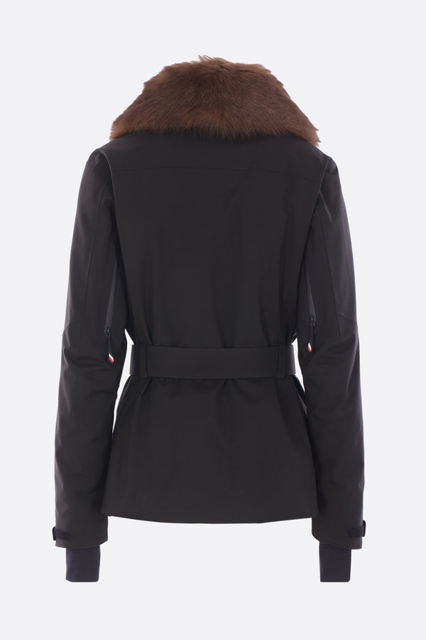 Moncler Grenoble down jacket made from black stretch nylon with logo patch on the left sleeve. Features a pointed collar with removable brown fur trim, front closure with double-slider zip and snap buttons, zip pockets, matching belt with leather insert, long sleeves, cuffs with stretch jersey gaiters, and straight hem with wind skirt.
