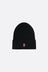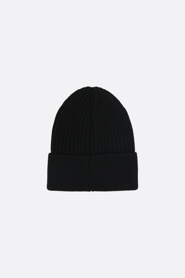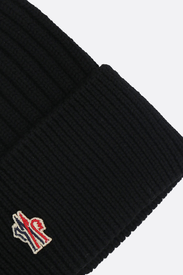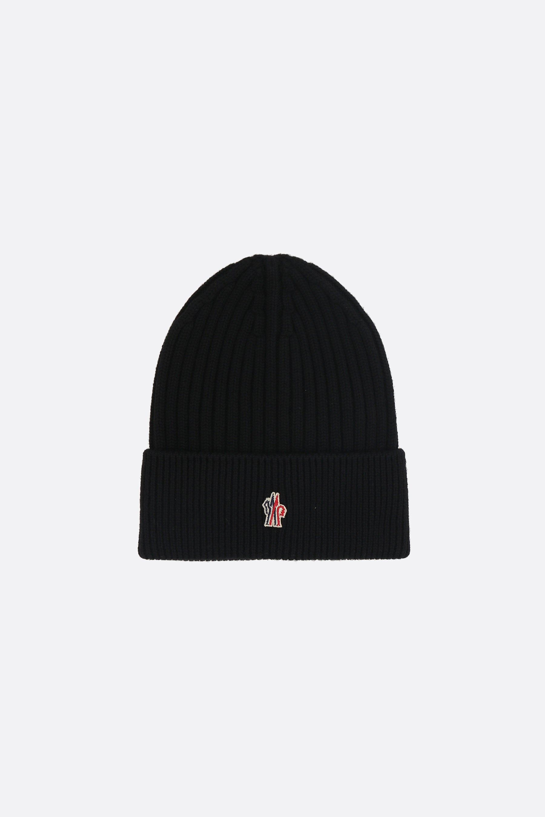 Moncler Grenoble beanie crafted from black ribbed wool knit with a logo patch on the front cuff.