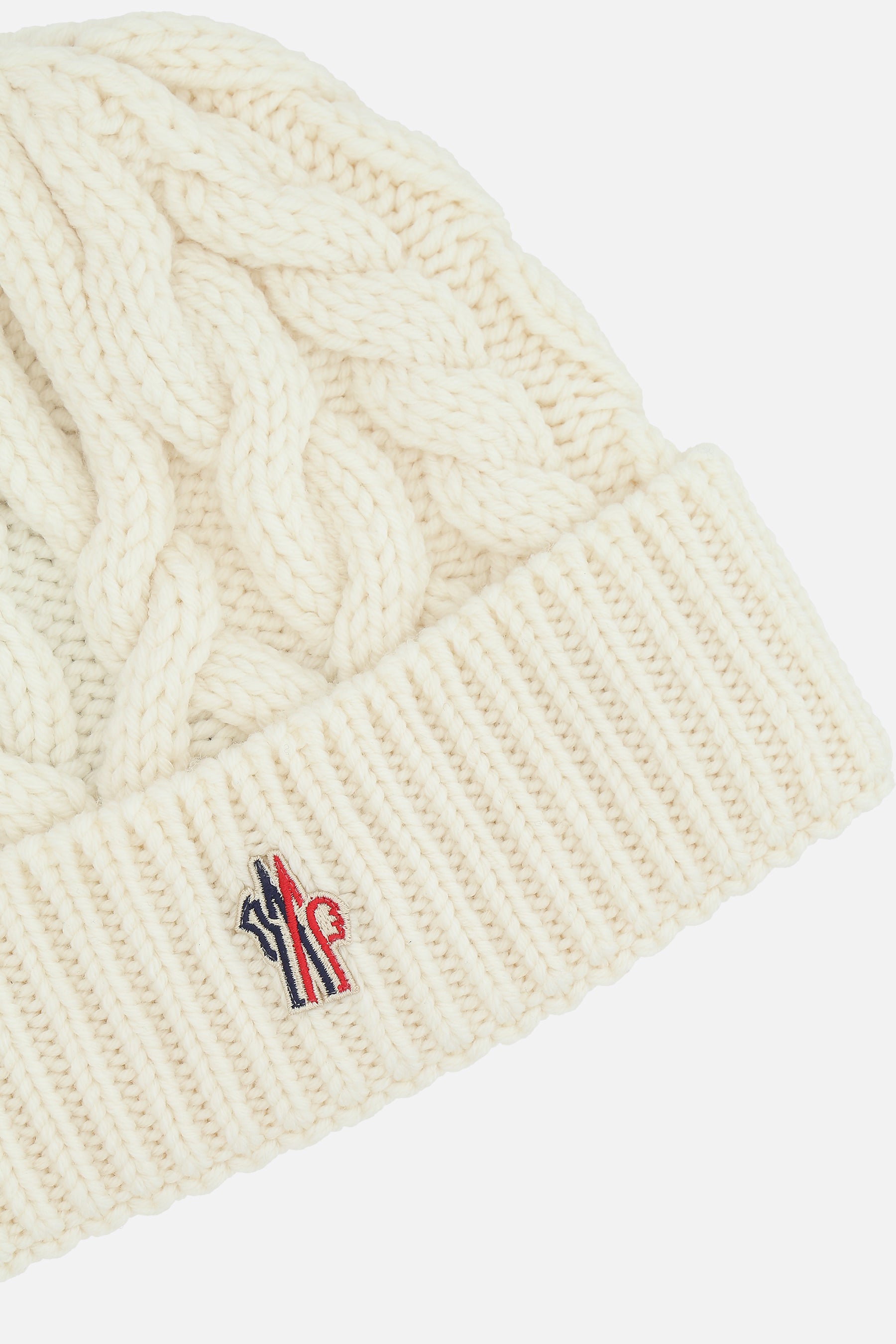 Moncler Grenoble beanie crafted from cable-knit wool, featuring a ribbed turn-up and the iconic logo patch.