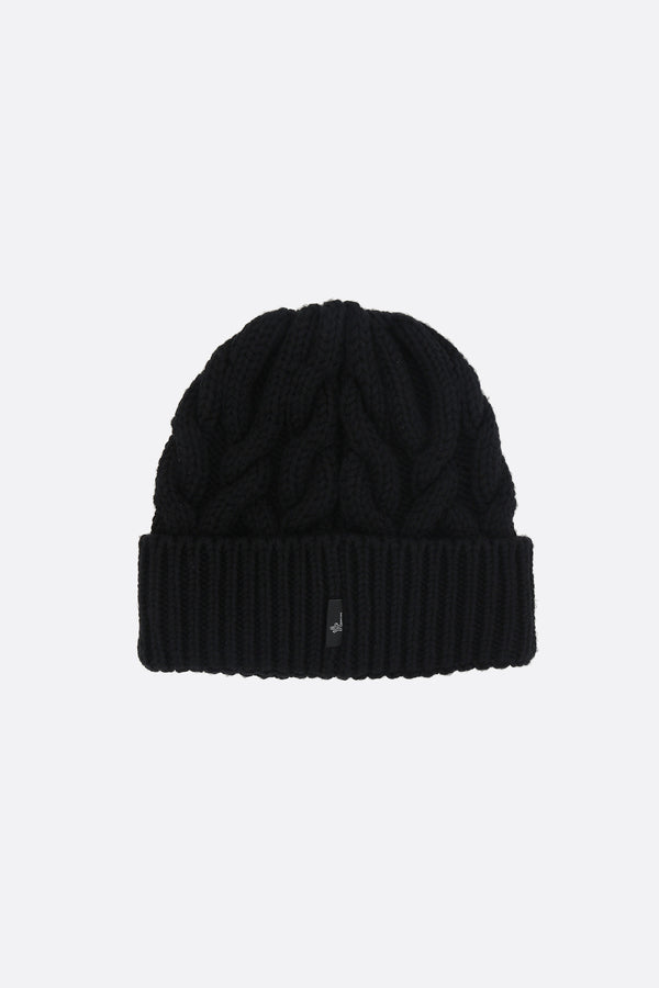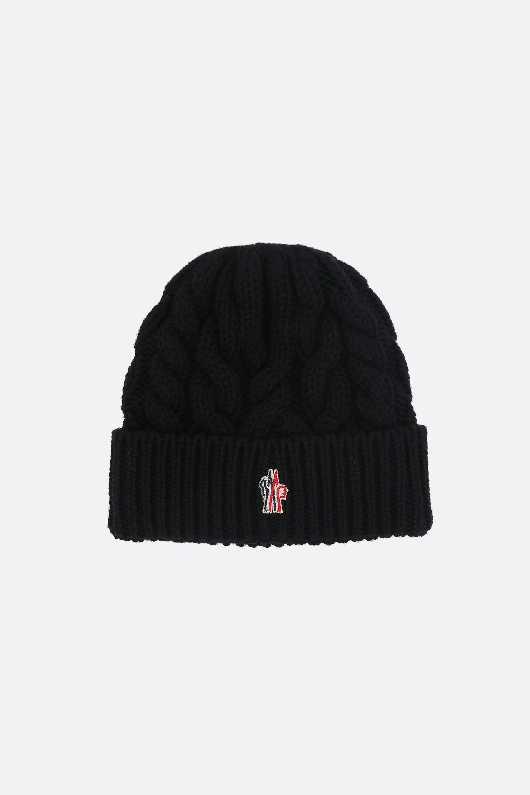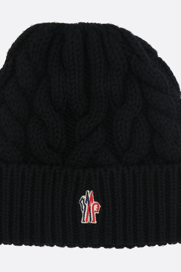Moncler Grenoble beanie crafted from cable-knit wool, featuring a ribbed turn-up and the iconic logo patch.