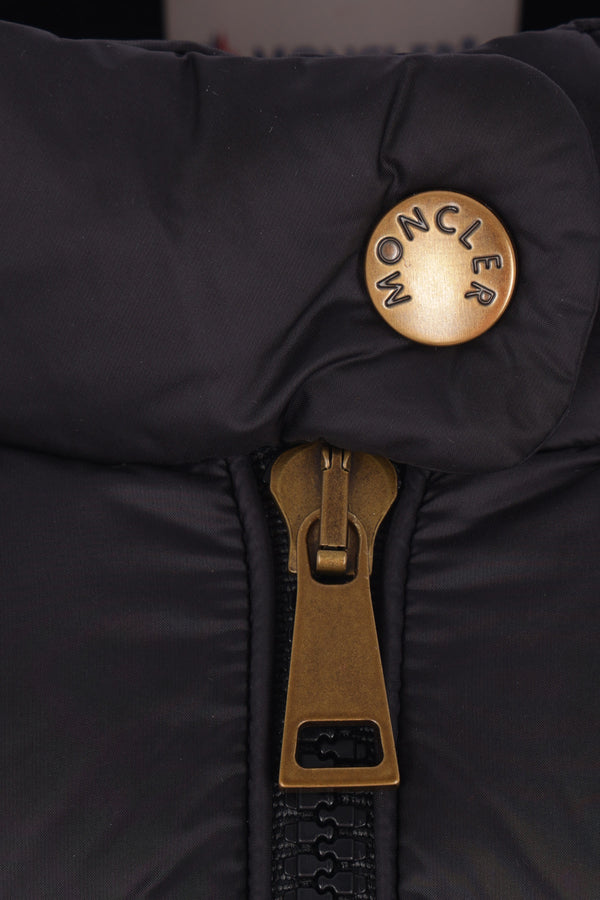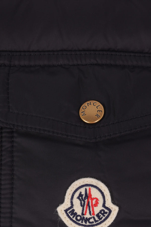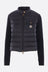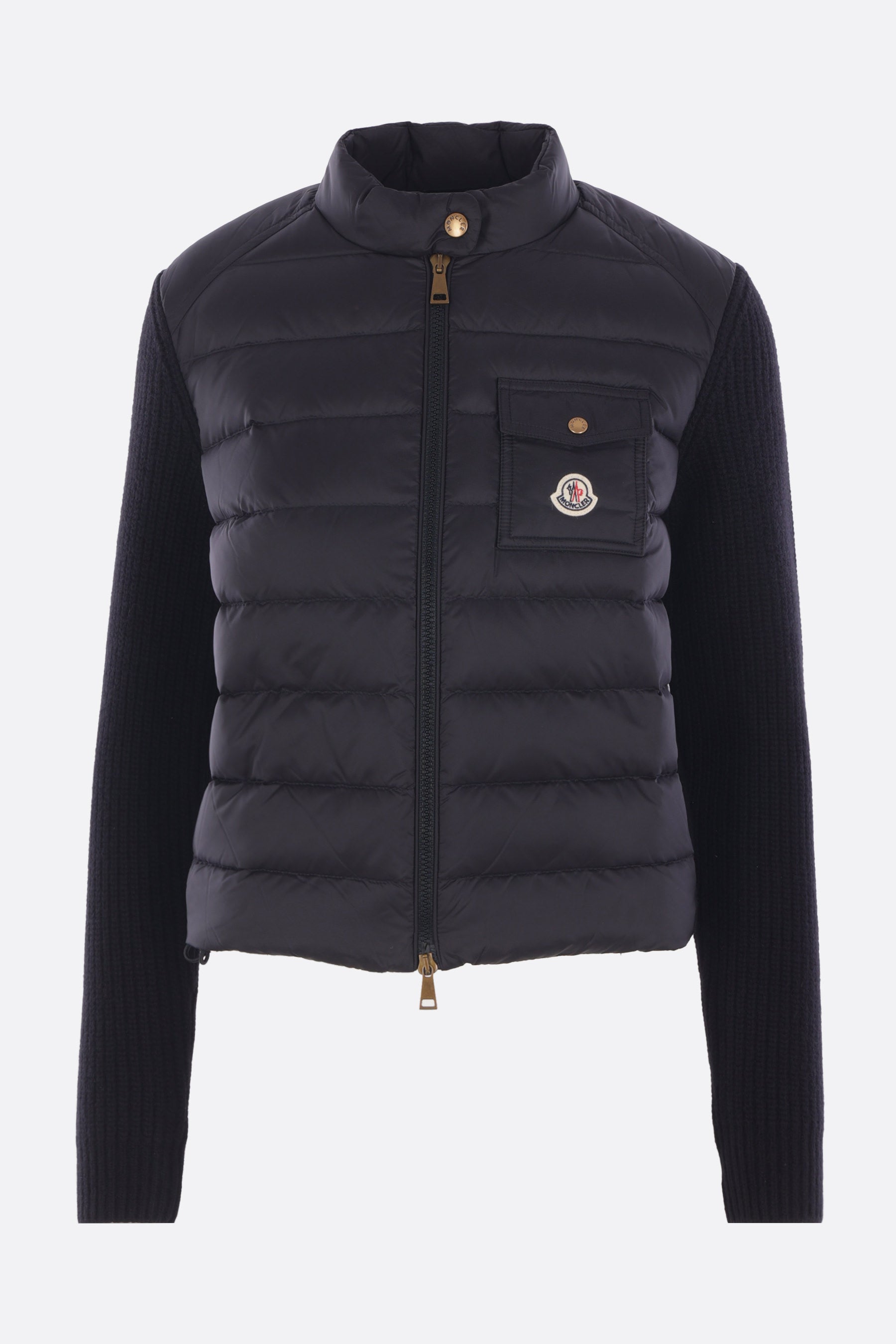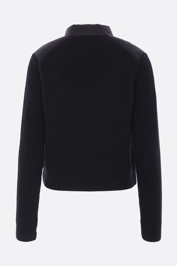 Moncler cardigan made of black ribbed wool and cashmere knit with a front insert in quilted nylon padded with down. Features a stand collar, front closure with two-way zip, side zip pockets, long sleeves, and a straight hem with drawstring. The design is completed by a flap pocket on the chest adorned with the iconic logo patch.