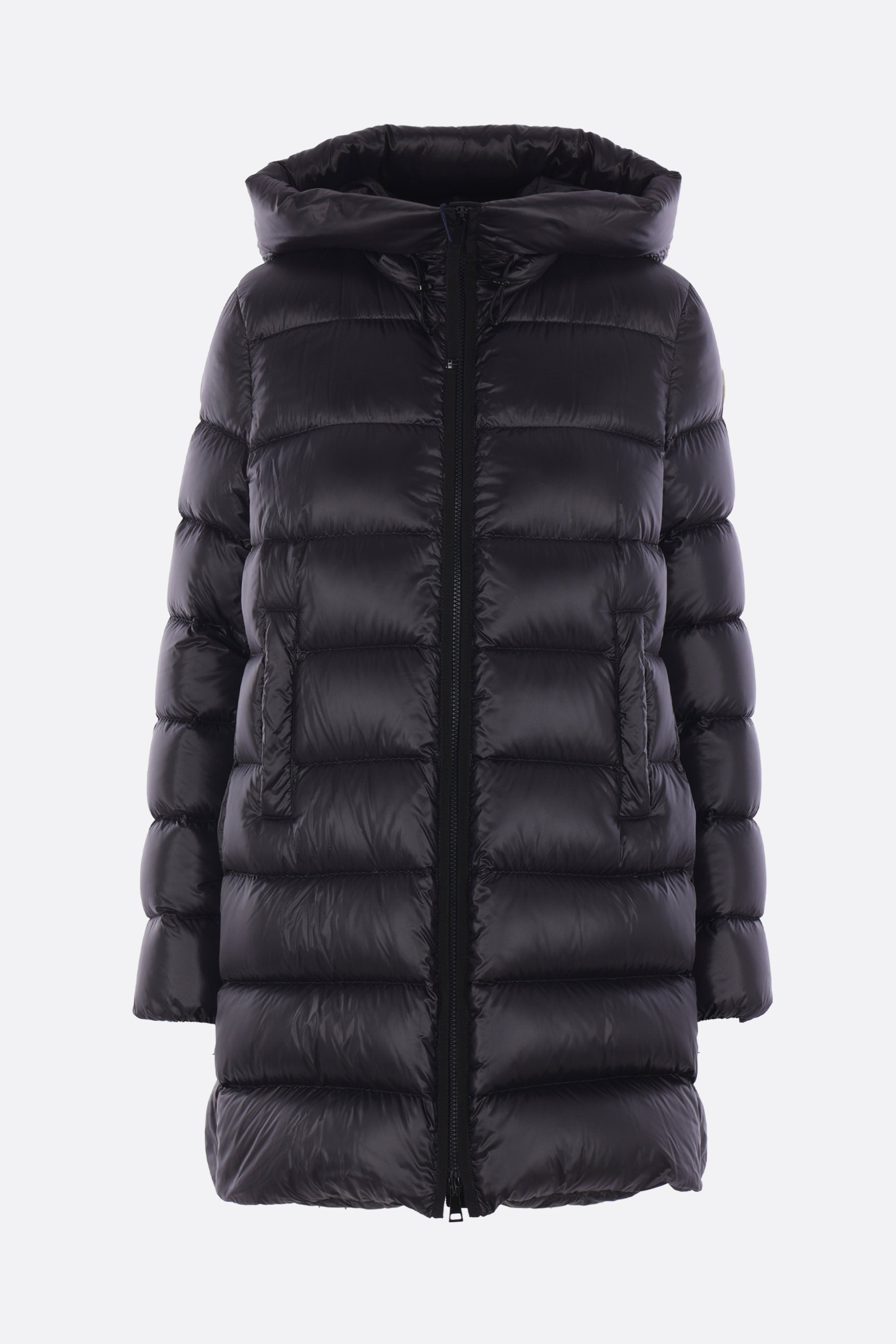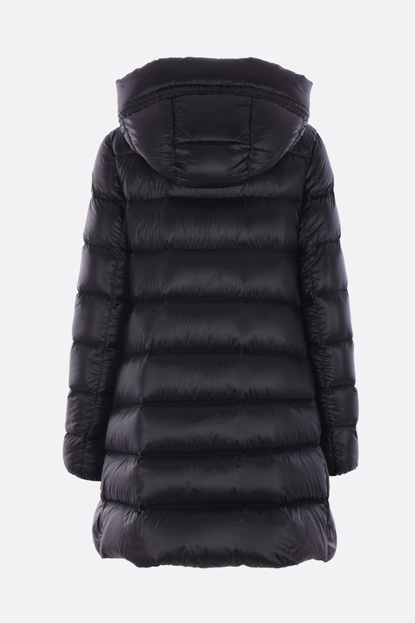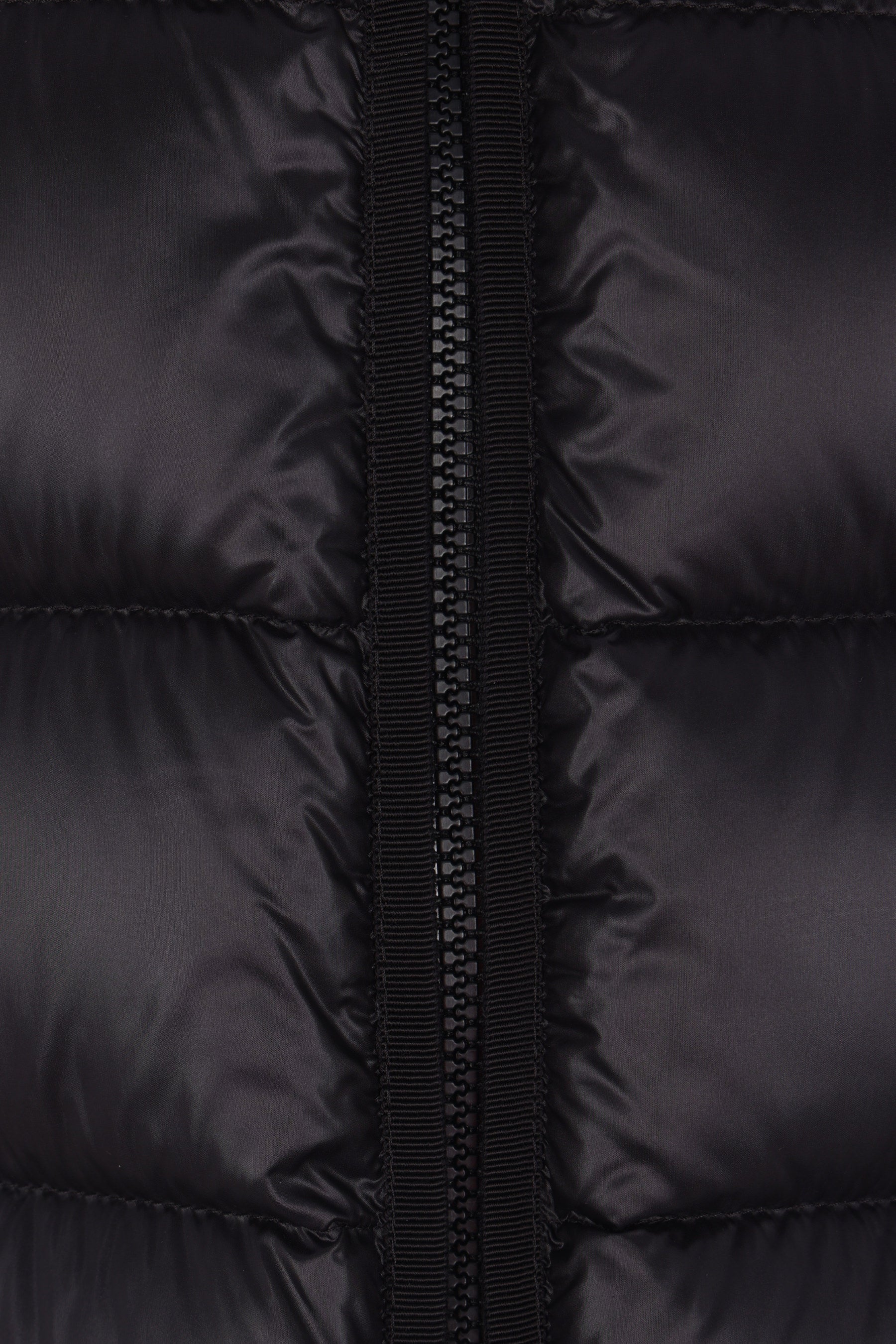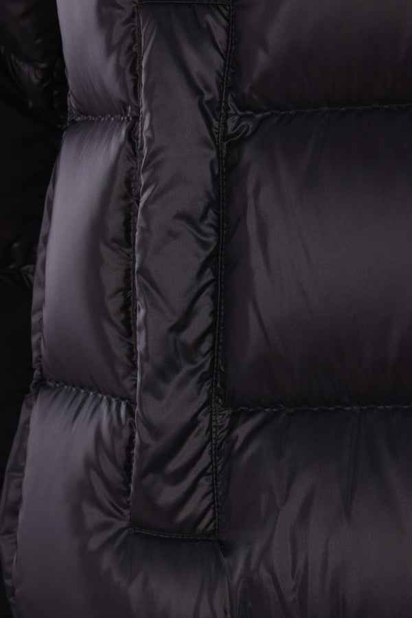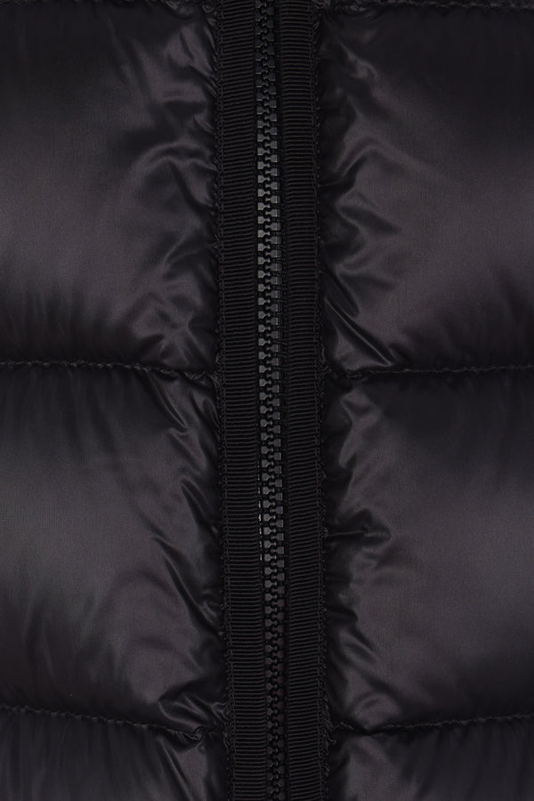 Moncler down jacket made of black nylon. Features a drawstring hood, front closure with two-way zip, welt pockets, long sleeves with elasticated cuffs, and a flared hem. The design is completed by the iconic logo patch applied on the left sleeve.
