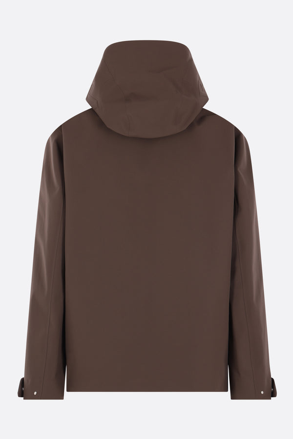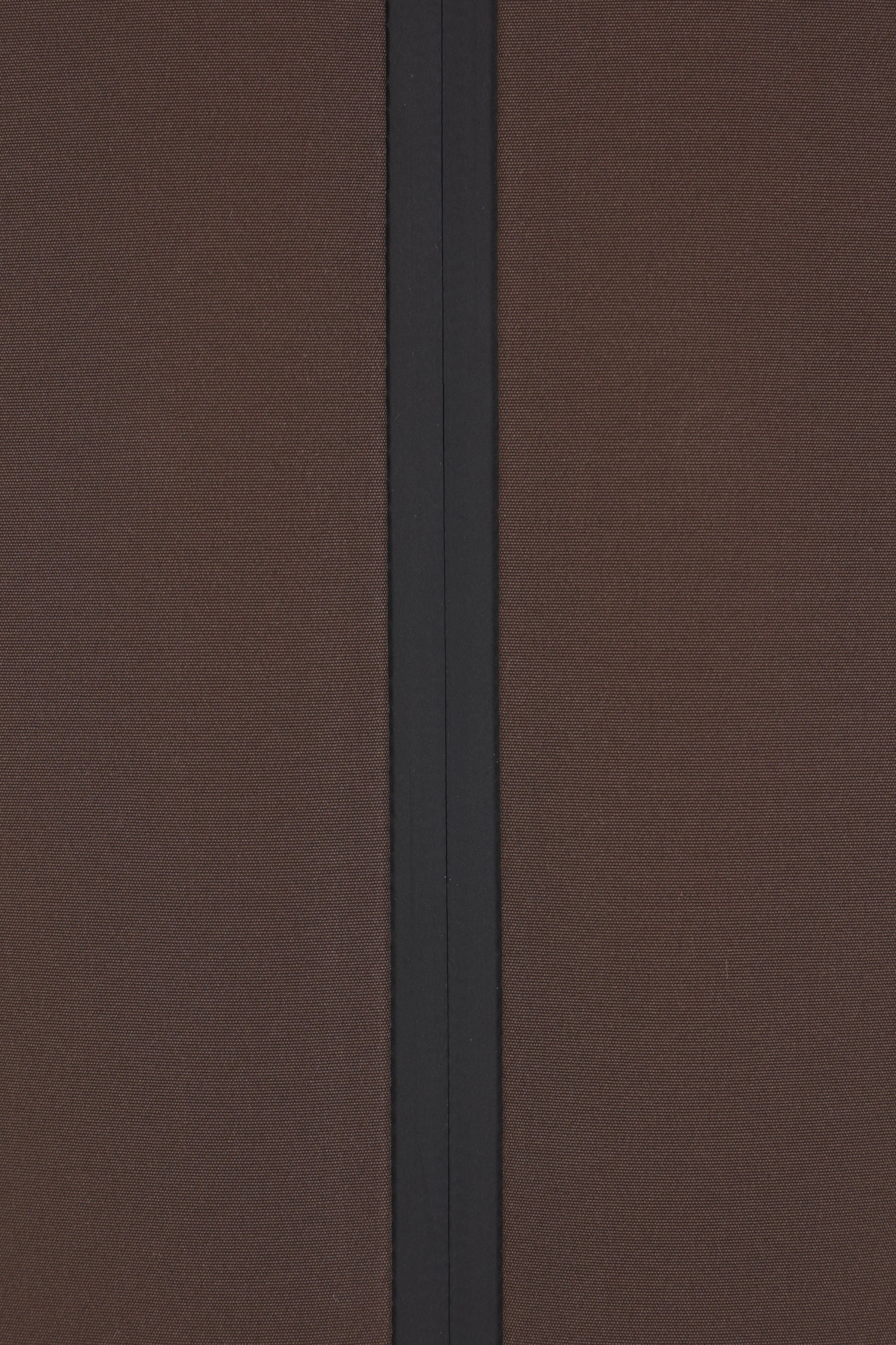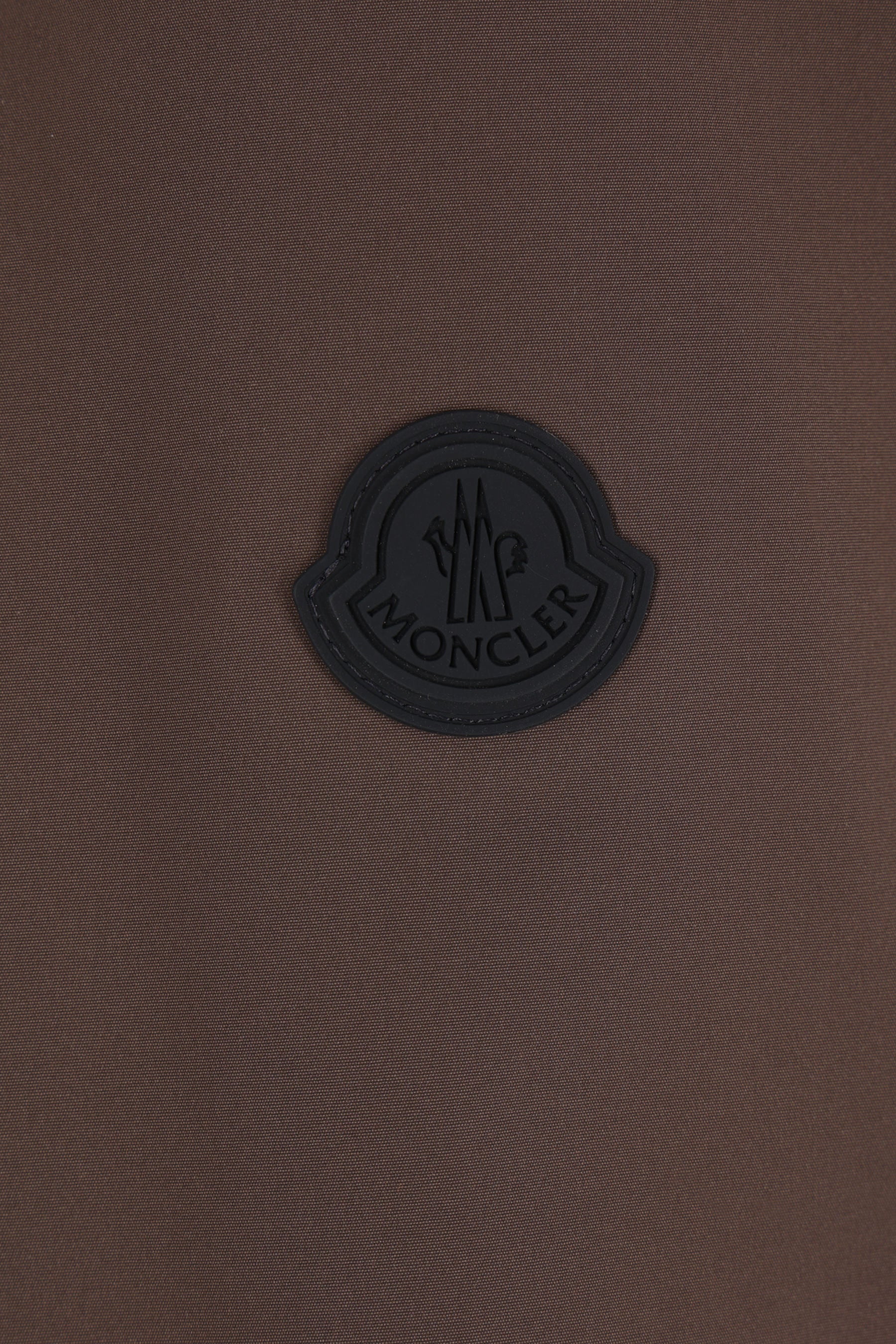 Moncler windbreaker crafted from brown technical fabric with a logo patch on the left sleeve. Featuring a hood with drawstring and embossed logo lettering, double-slider front zip closure, zippered pockets, long sleeves with adjustable cuffs, and a rounded hem with drawstring. The design is completed by a removable black nylon sleeveless down vest.