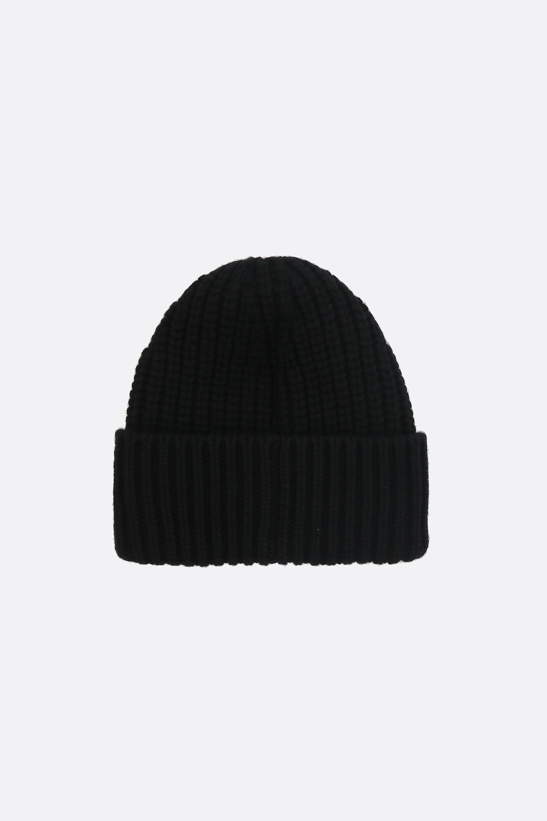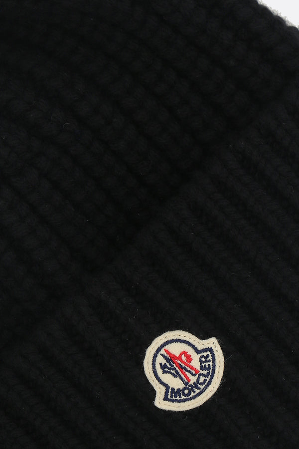 Moncler beanie made of black ribbed wool and cashmere knit with a logo patch on the front turn-up.