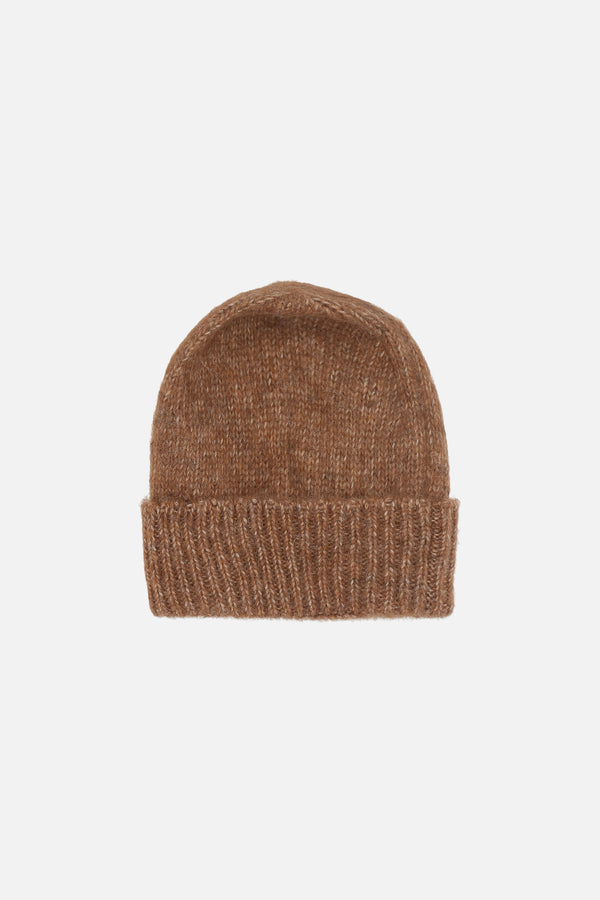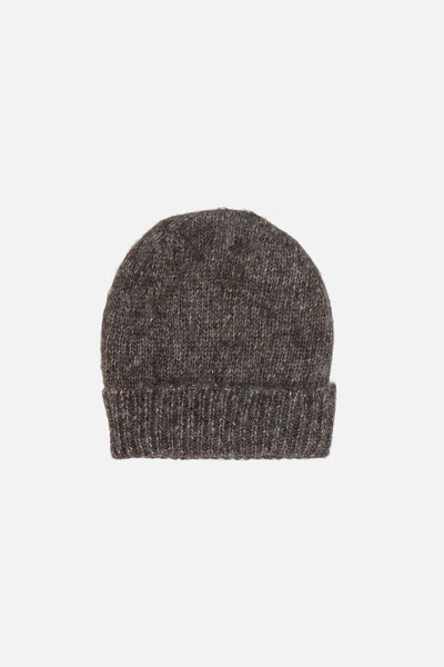 Monitaly beanie crafted from brown melange alpaca and Pima cotton knit.