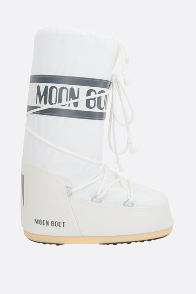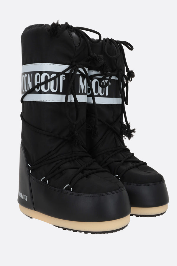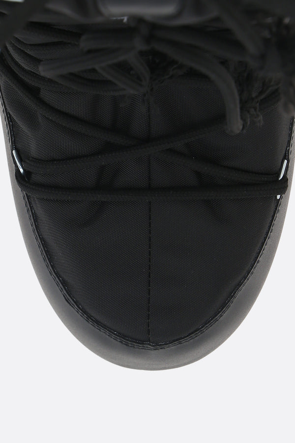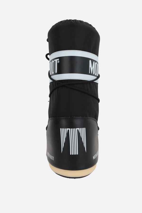 Moon Boot high-top snow boots crafted in black nylon. Featuring lace-up closure, a round-toe silhouette, fabric lining and rubber sole. The design is completed by contrasting faux-leather band embellished by the iconic logo print.