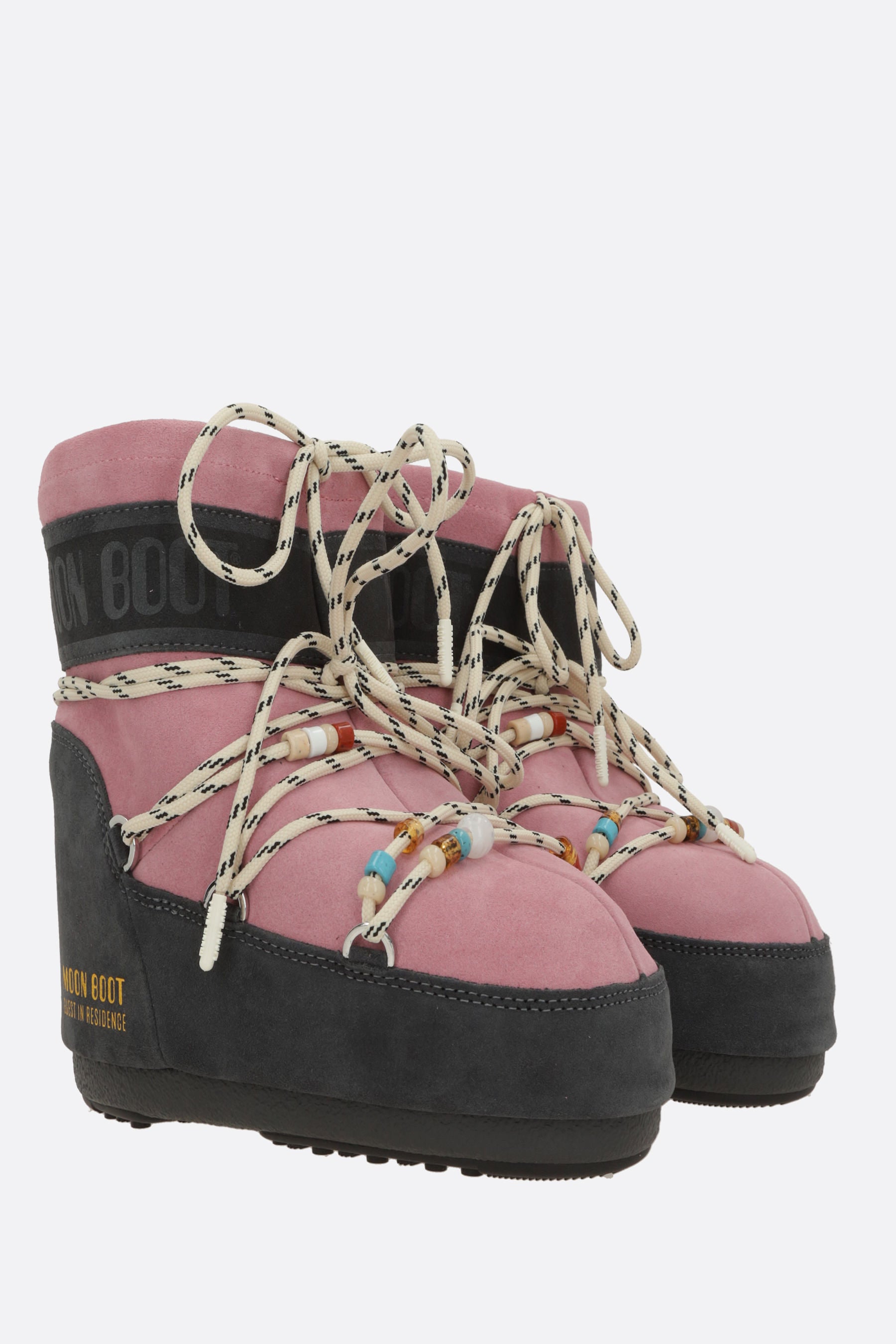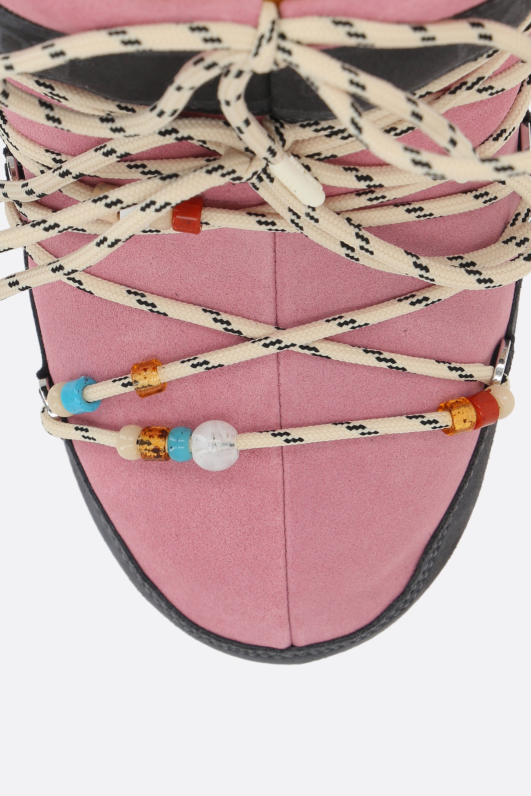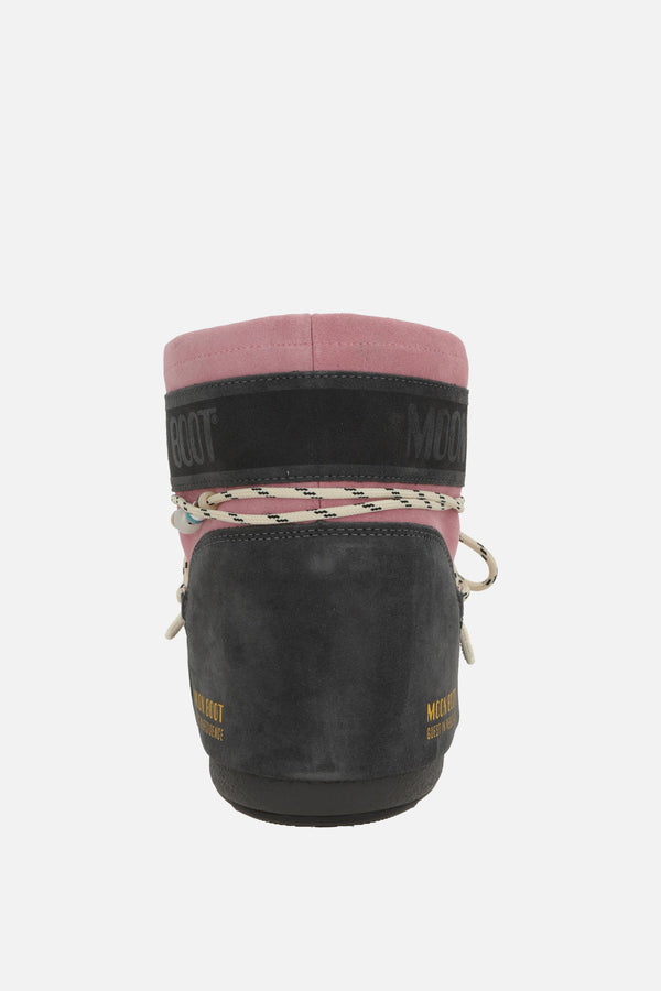 Moon Boot x Guest In Residence ankle boots made of pink and dark grey suede. They feature front laces with bead details, a round toe, fleece lining, and a rubber sole. The design is completed with embossed logos on the sides.
