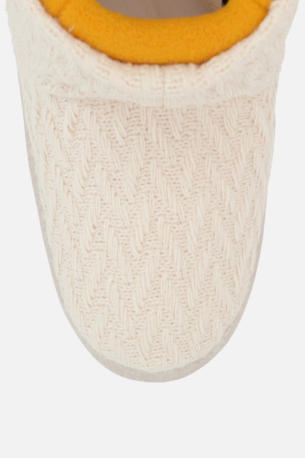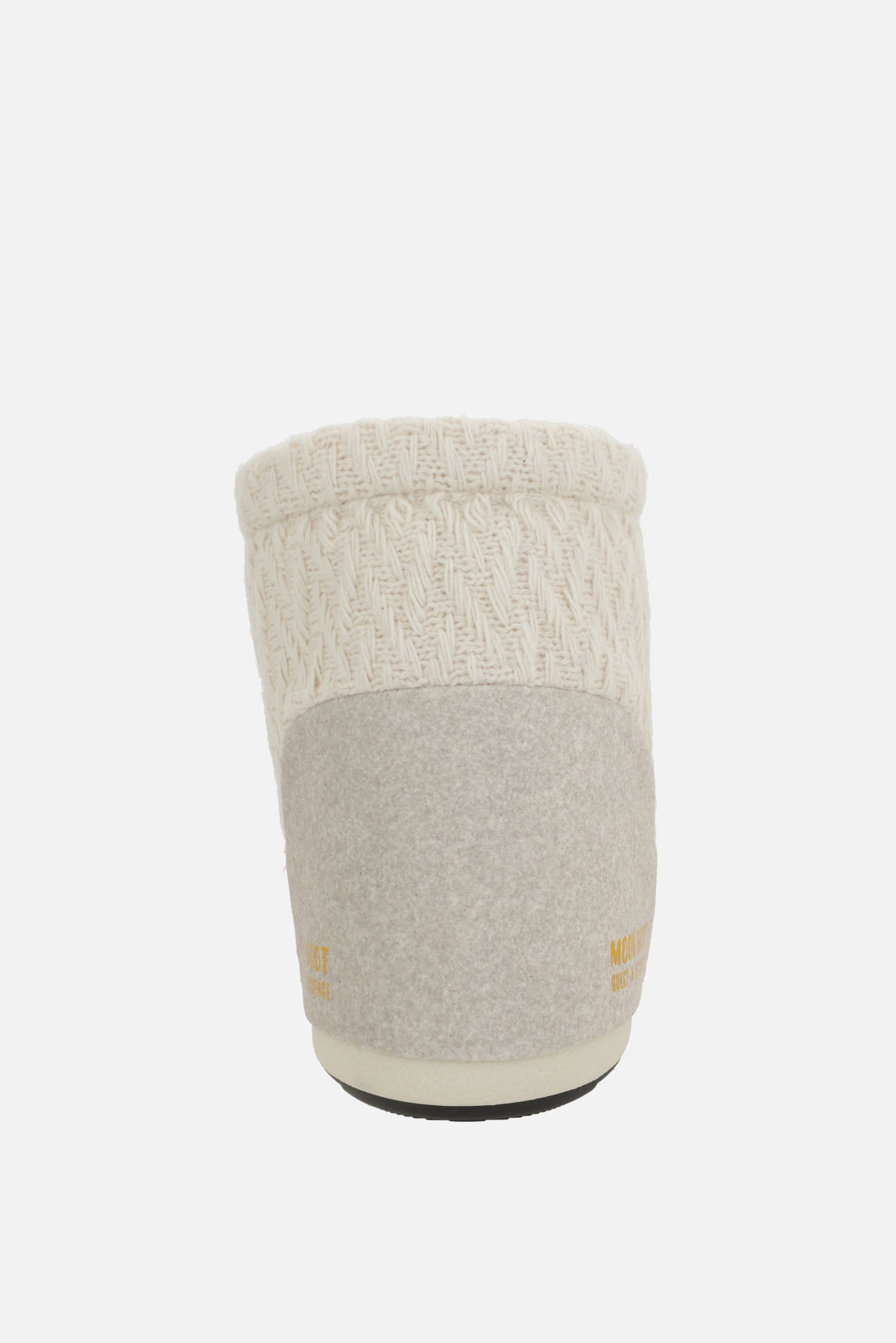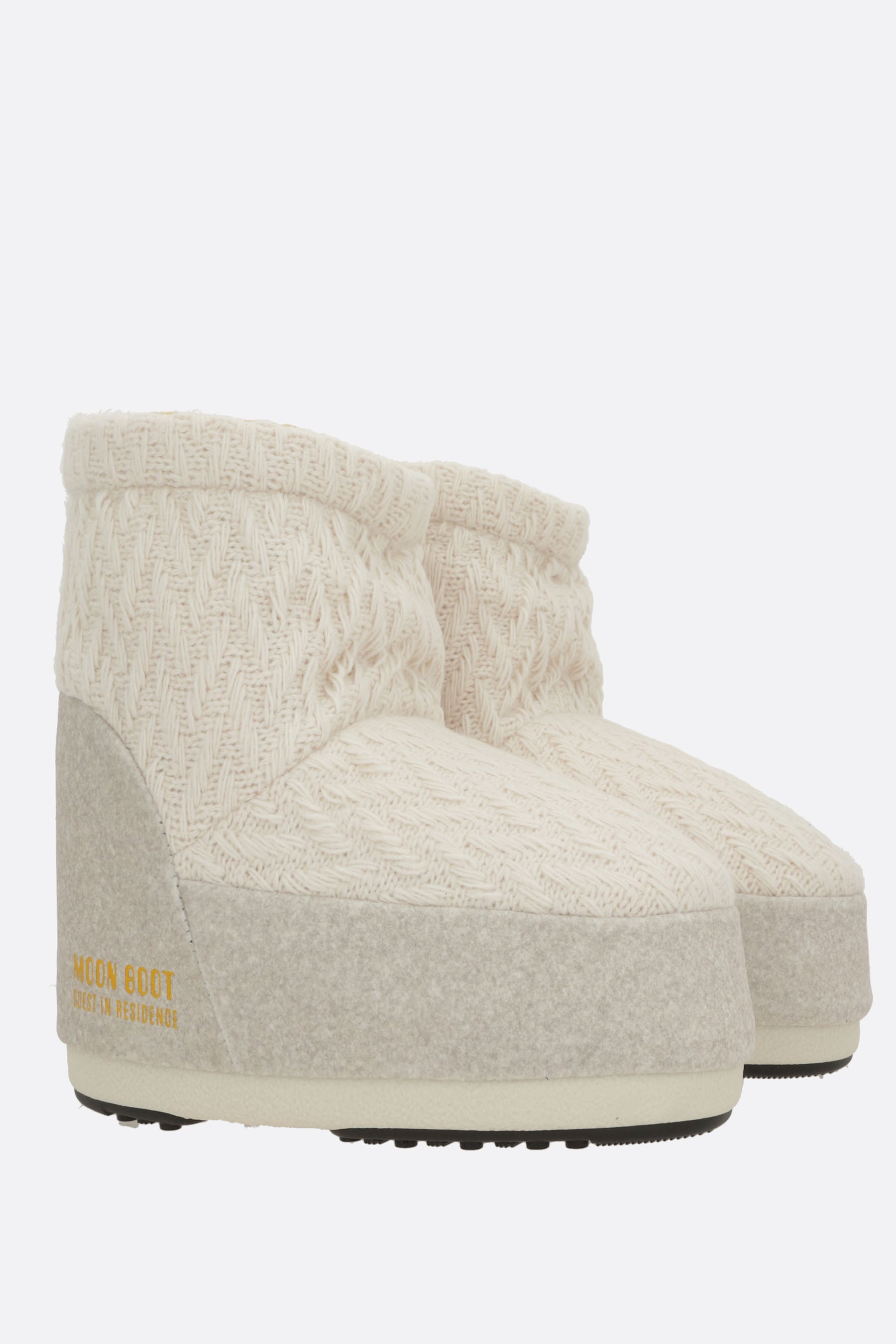 Moon Boot x Guest In Residence ankle boots made of ivory knit with tone-on-tone felt trim. They feature a round toe, fleece lining, and a rubber sole. The design is completed with printed logos on the sides.