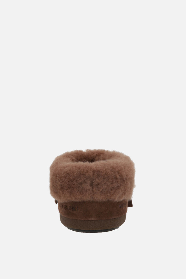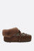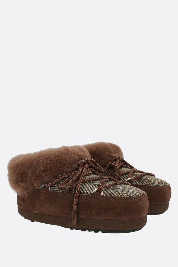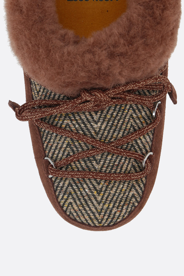 Moon Boot x Guest In Residence mules crafted from brown/ecru herringbone fabric and brown suede with shearling trim. Features front laces, round toe, fleece lining, and rubber sole. The design is completed with embossed side logos.