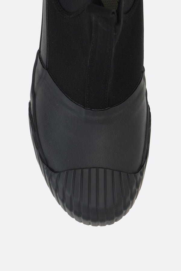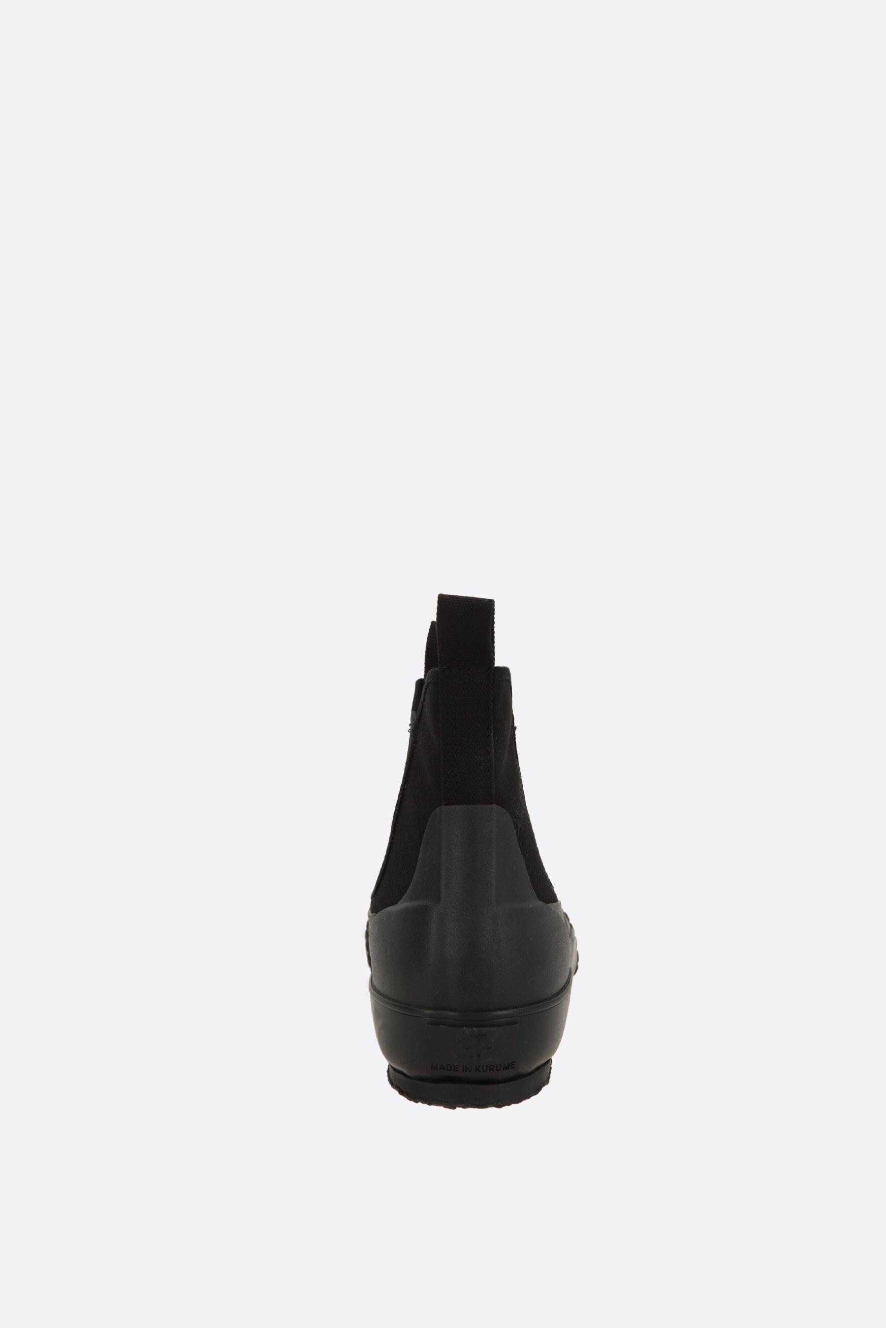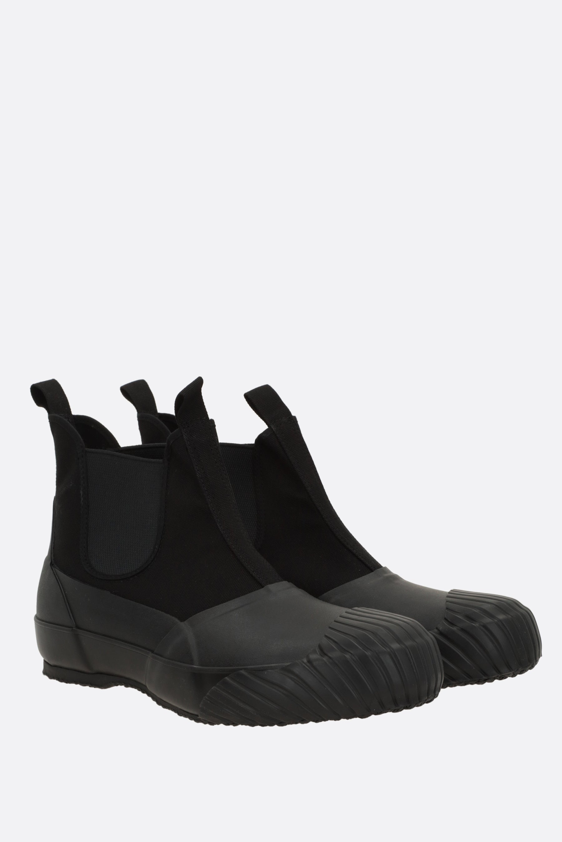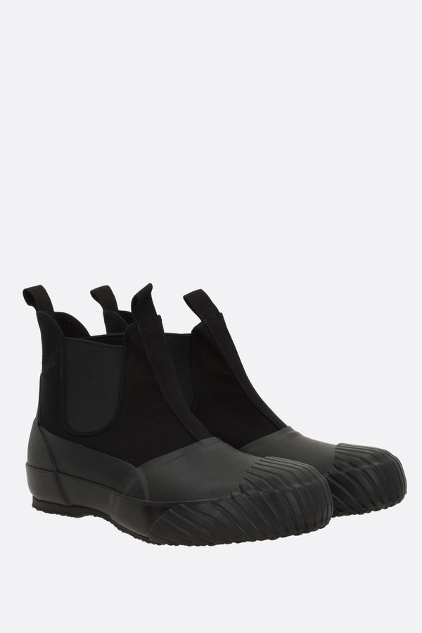 Ankle boot by Moonstar, crafted in black canvas and rubber. Featuring a round toe with a textured toe cap, fabric lining, and rubber sole.