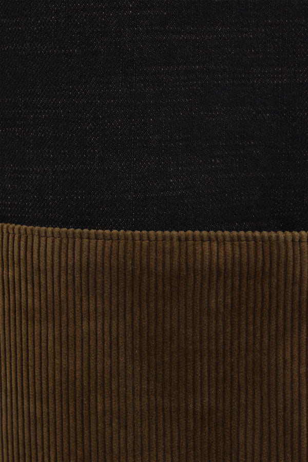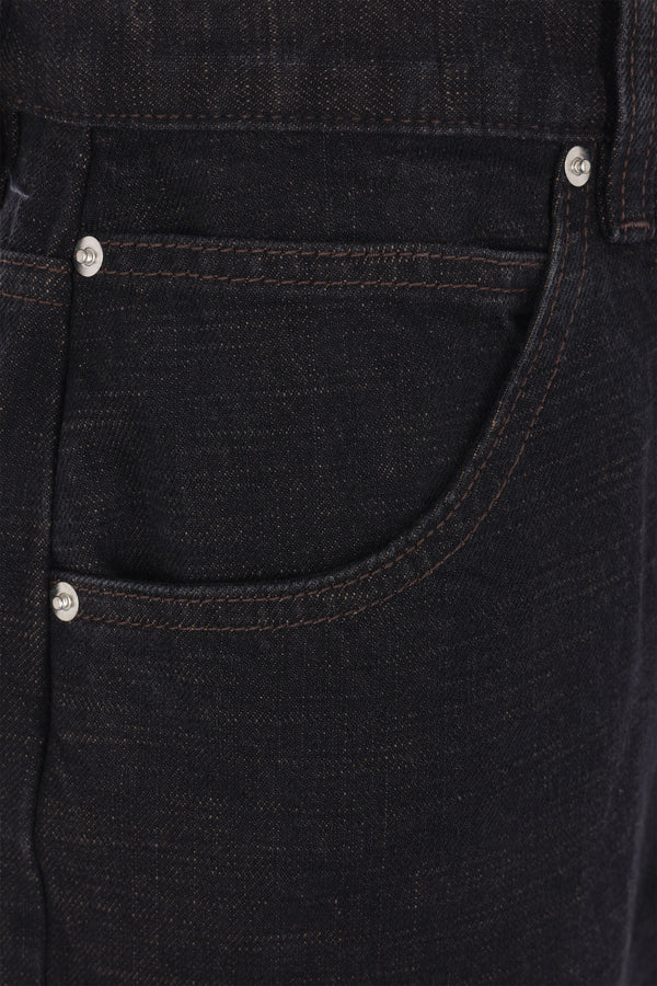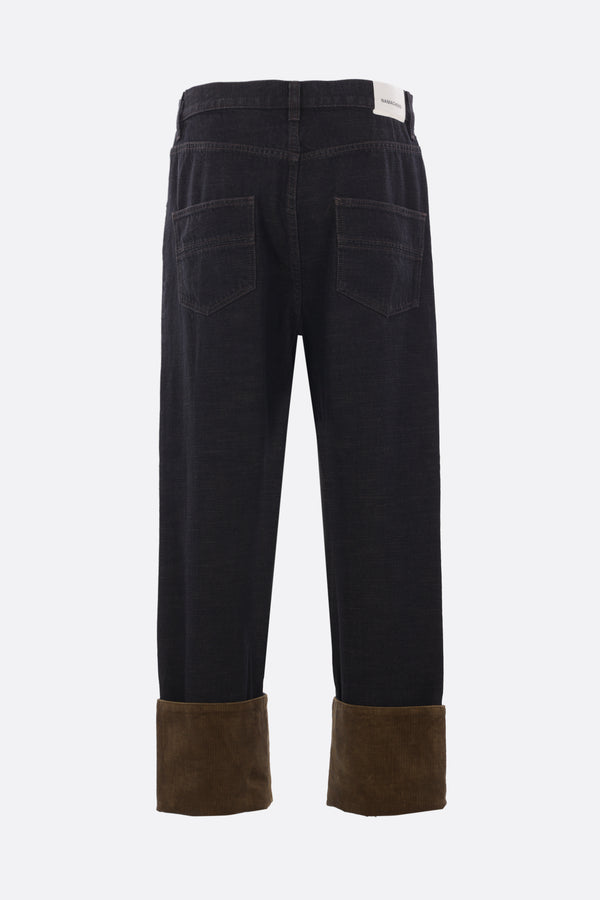 Jeans by Namacheko made of black tobacco denim. Featuring front button and zip closure, belt loops, classic five-pocket design, and oversized corduroy cuffs at the hem.