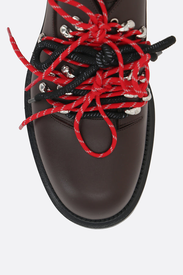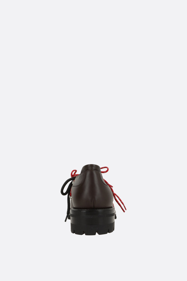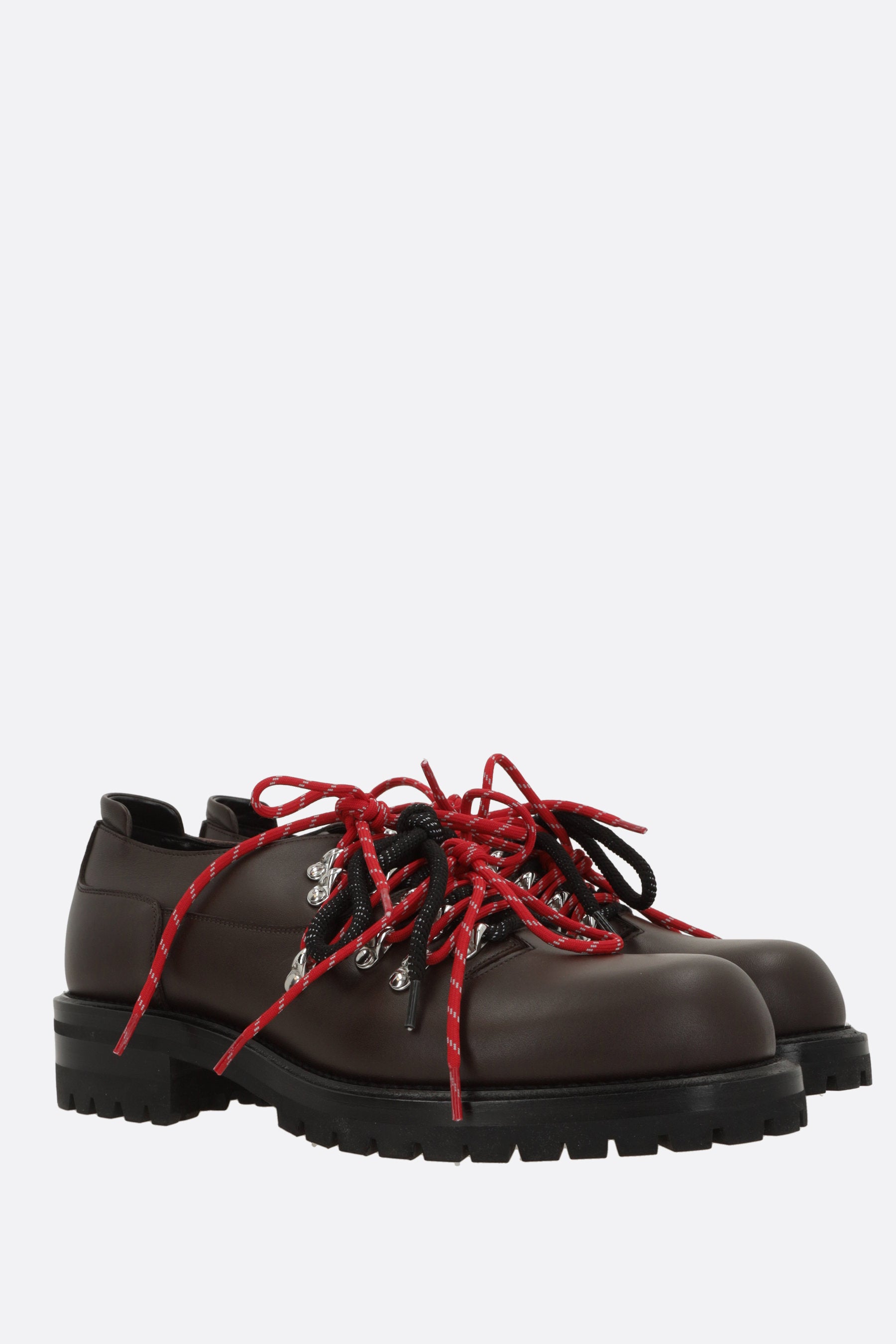 Namacheko derby shoes made of dark brown Box leather. They feature a round toe, multi-lace system closure in a trekking style, leather lining, and a lugged rubber sole.