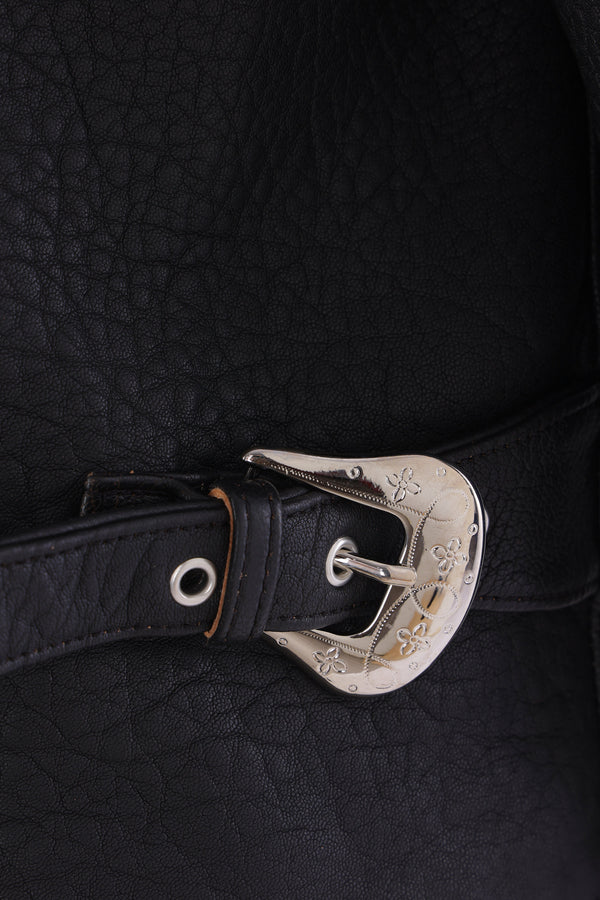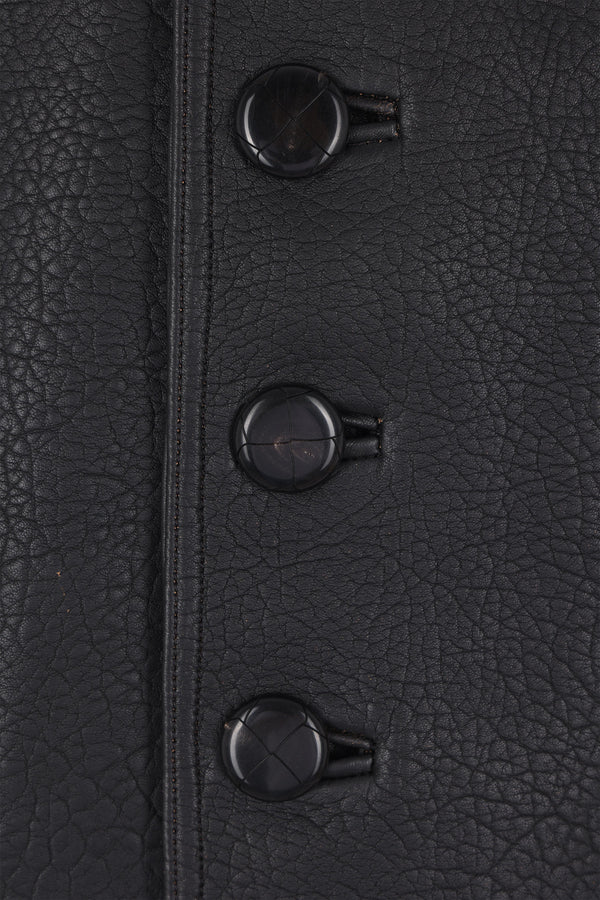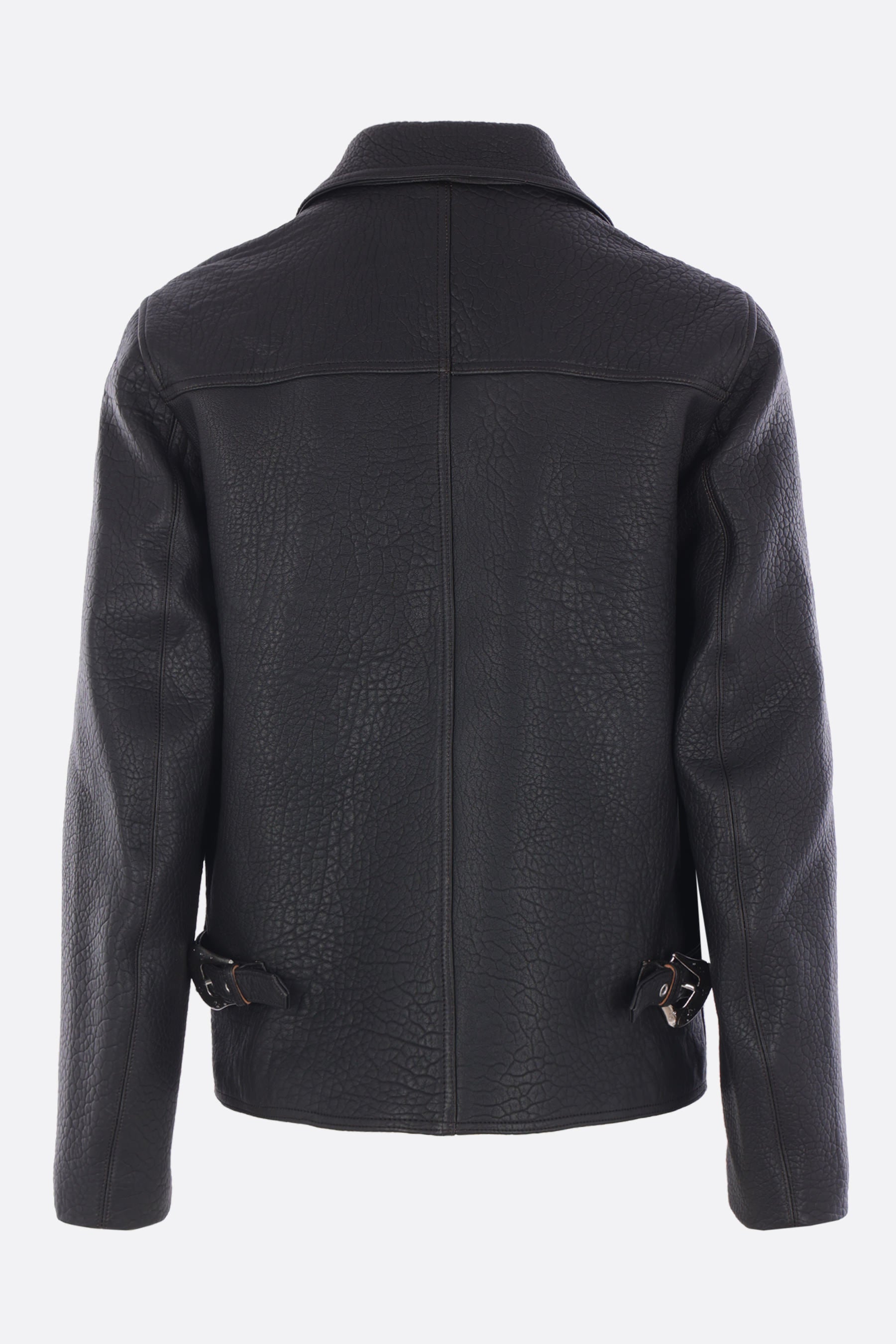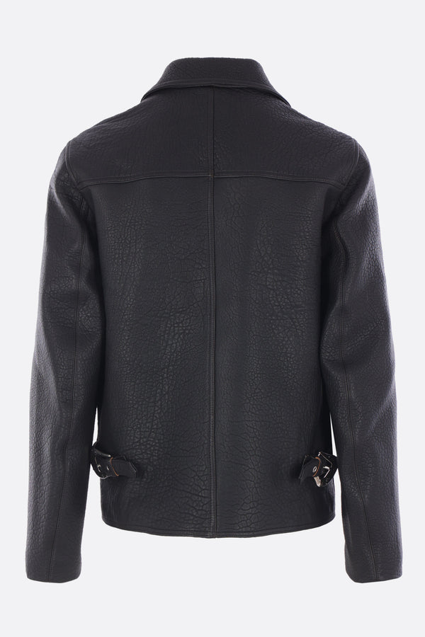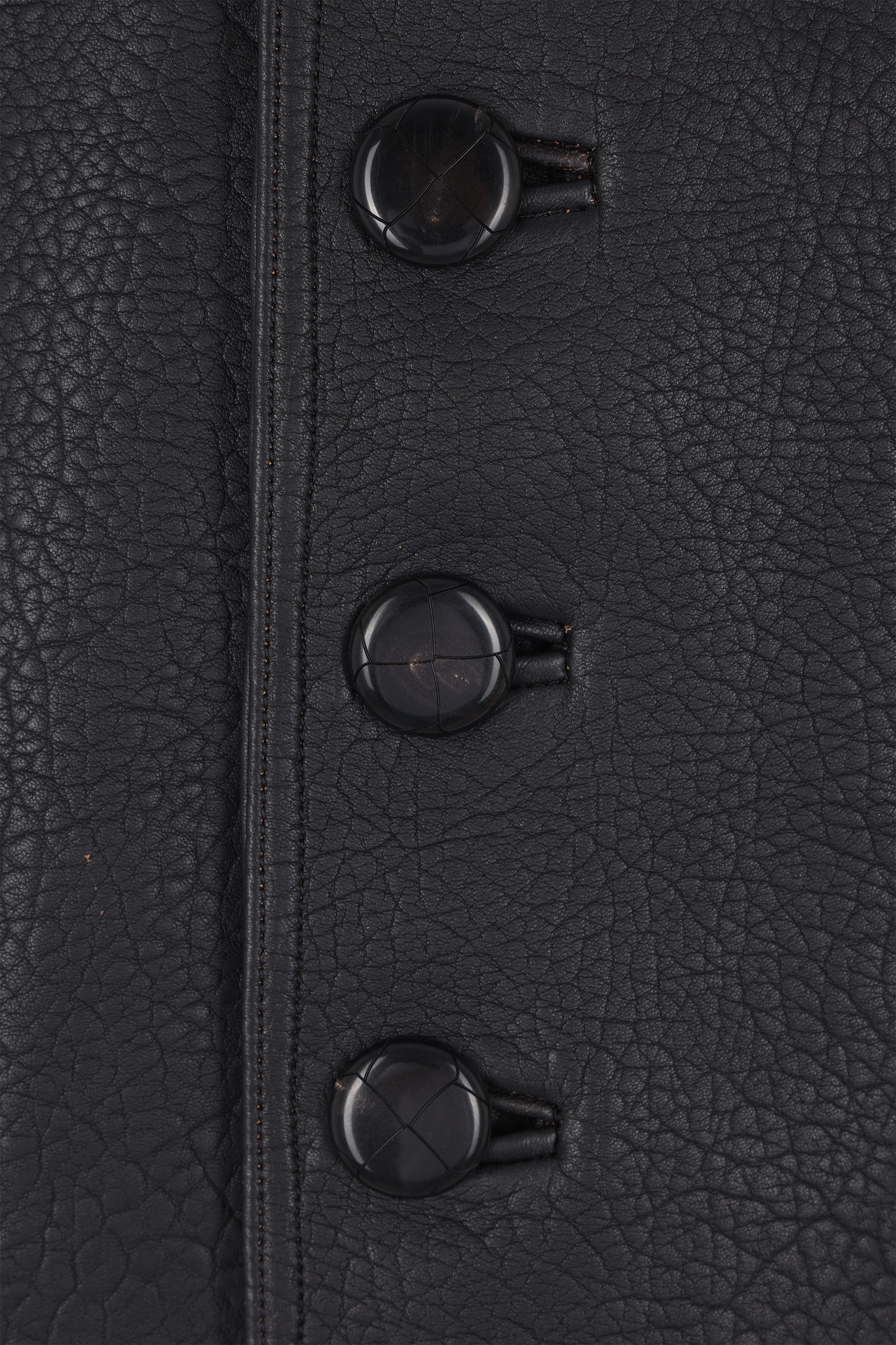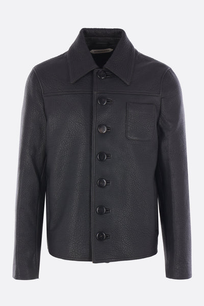 Shirt-jacket by Namacheko made of grainy black leather. Features a classic collar, button closure, multiple pockets, long sleeves, and straight hem. Fully lined.