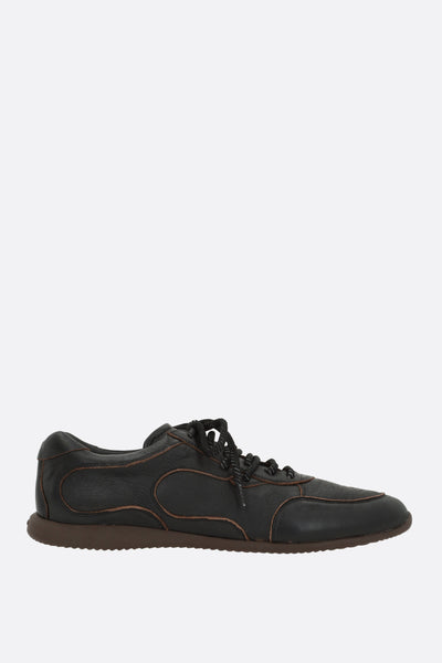 Sneaker by Namacheko crafted from smooth black/brown leather. Featuring lace-up closure, round toe, leather lining, and rubber sole with embossed logo lettering at the heel.