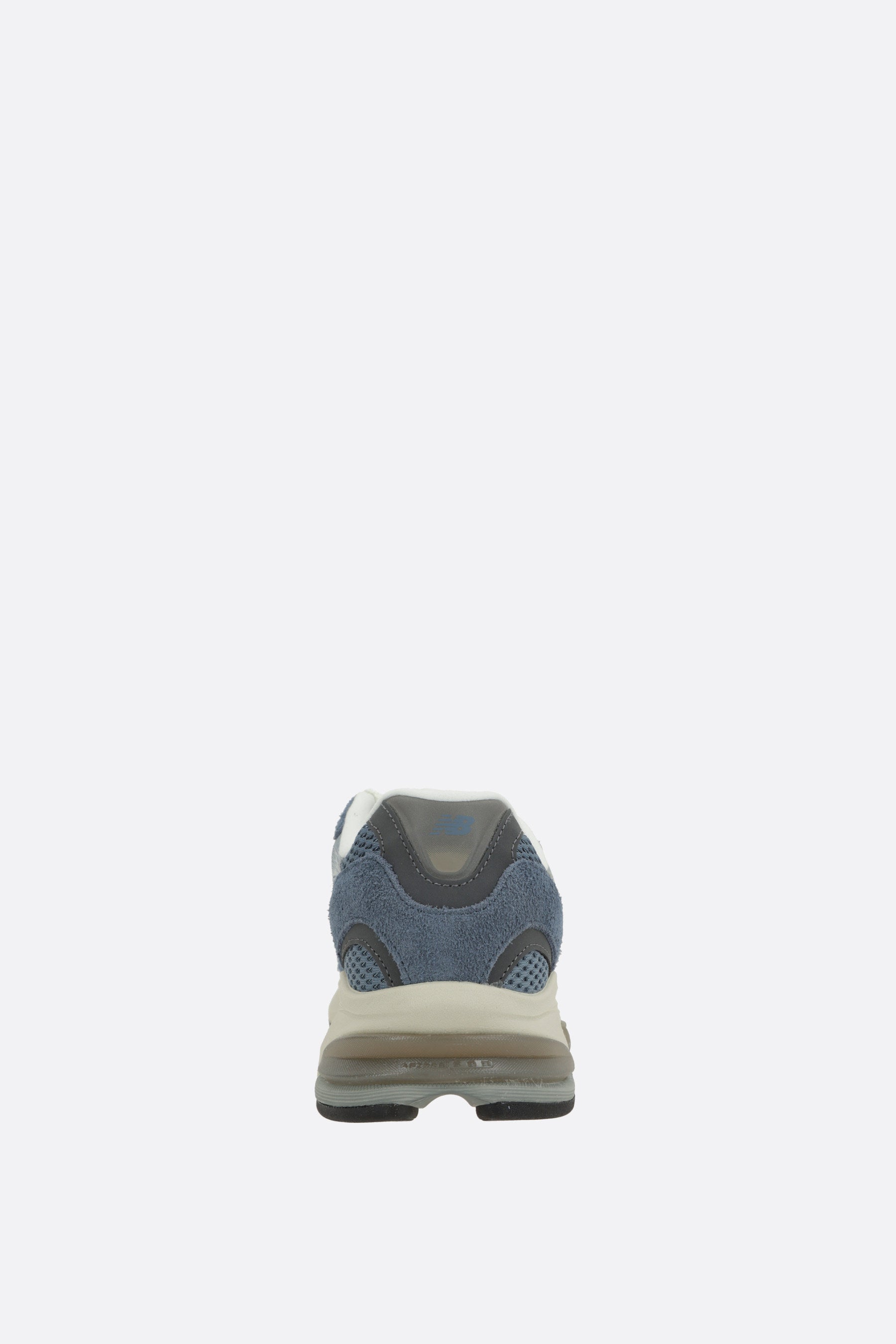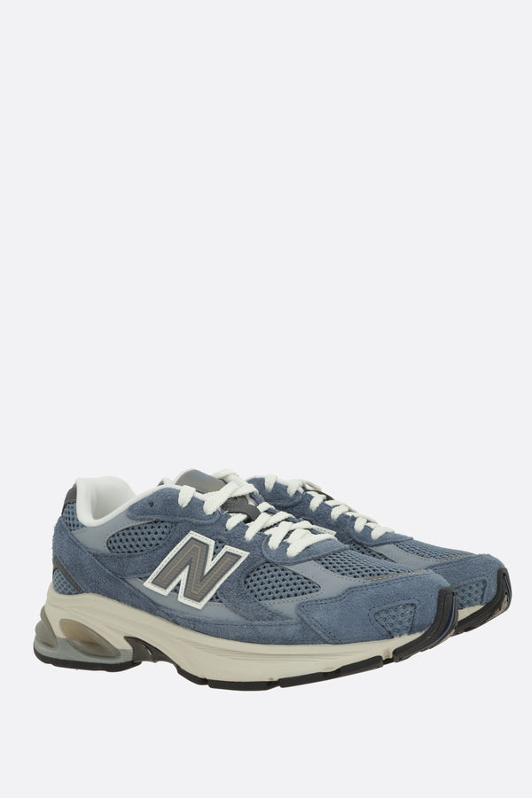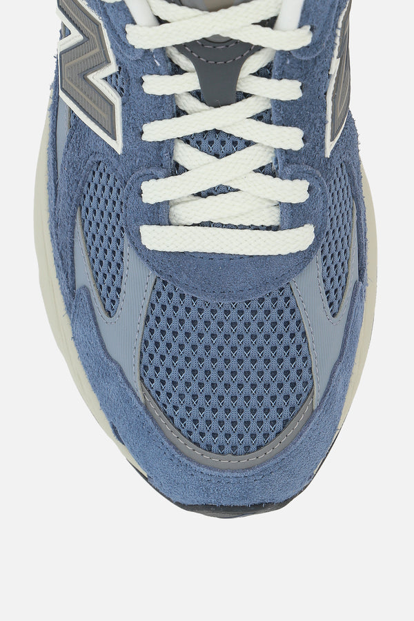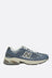 New Balance low-top sneakers crafted from indigo blue mesh and suede with reflective details. Featuring lace-up closure, round toe, fabric lining, ABZORB midsole, and rubber sole. The design is completed with reflective embroidered “N” patches on the sides and NB detailing on the heel and tongue.