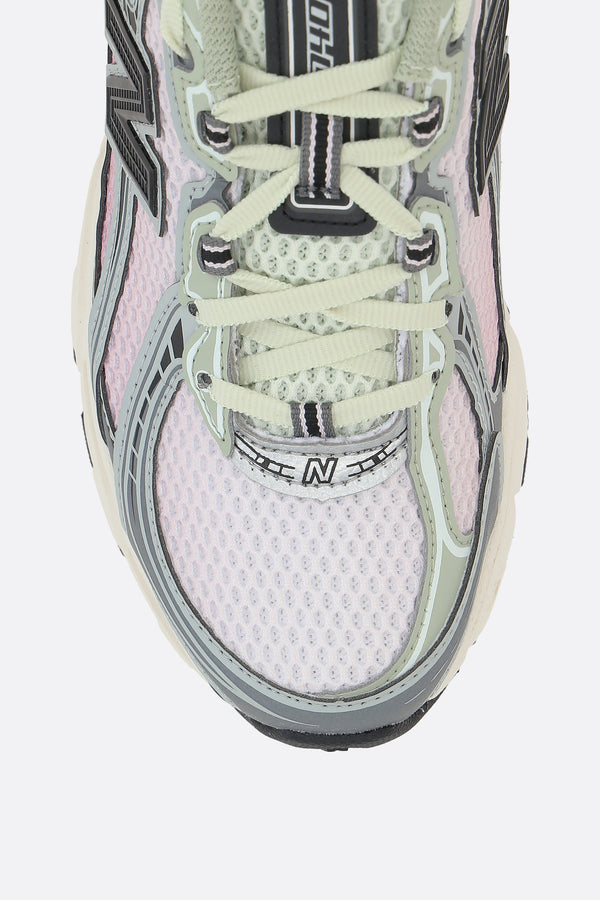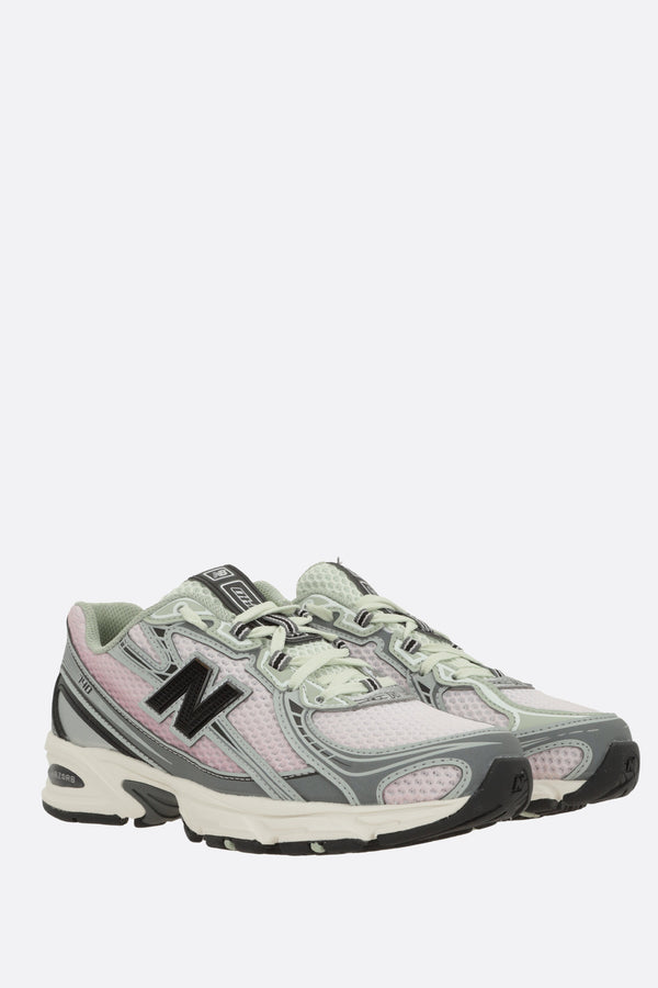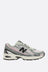 New Balance low-top sneakers crafted from pink and light green mesh and grey synthetic leather with reflective details. Featuring lace-up closure, round toe, fabric lining, ABZORB midsole, and rubber sole. The design is completed with embroidered “N” patches on the sides and NB detailing on the heel.