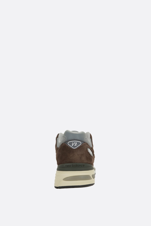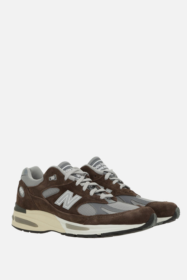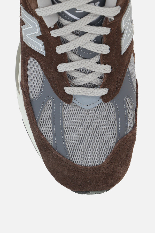 New Balance low-top sneakers crafted from grey mesh and brown suede. Featuring lace-up closure, round toe, fabric lining, FuelCell midsole, and rubber sole. The design is completed with embroidered “N” patches on the sides and reflective details.